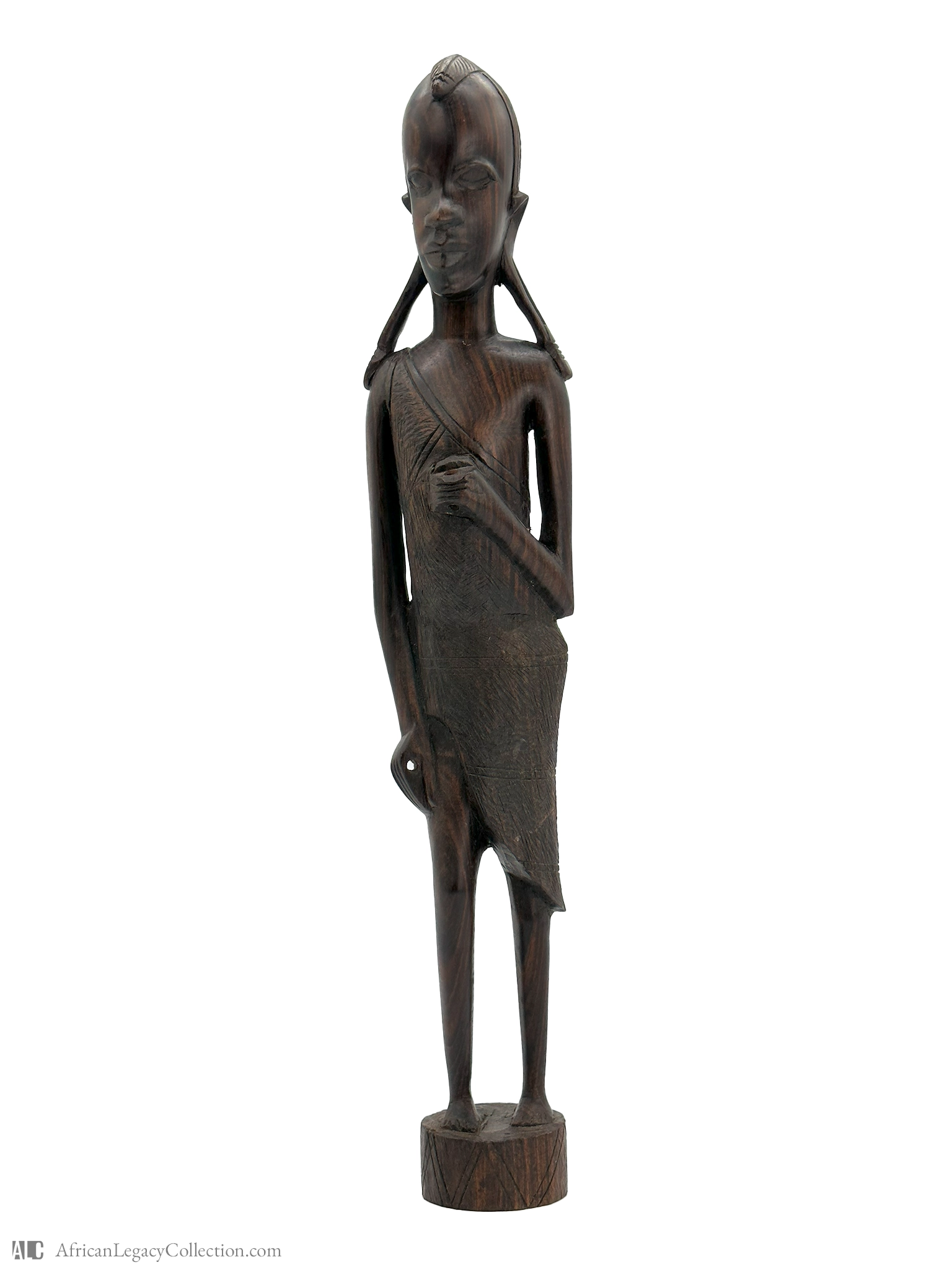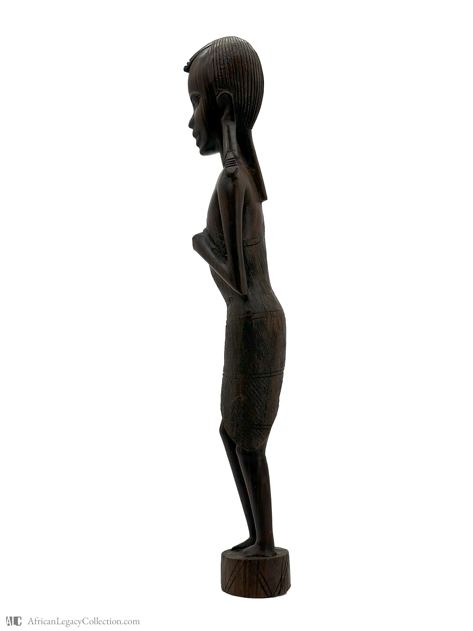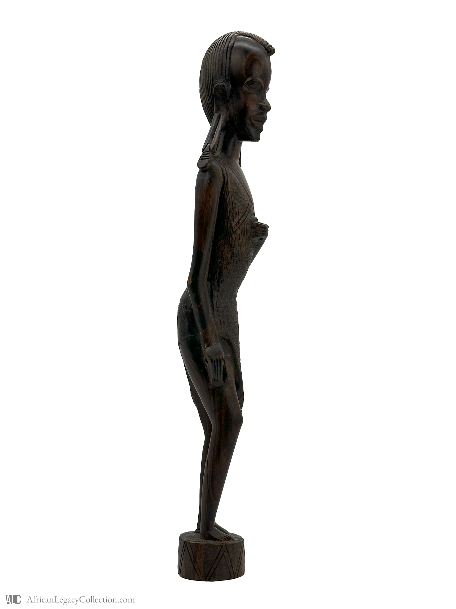 The sculpture is crafted from dark hardwood, exhibiting fine incised striations along the surface. This technique reflects skilled workmanship prevalent in the region’s carving traditions. The piece demonstrates significant cultural value, rooted in historical contexts of community and spiritual expression, reflecting the craftsmanship of the era in which it was made.