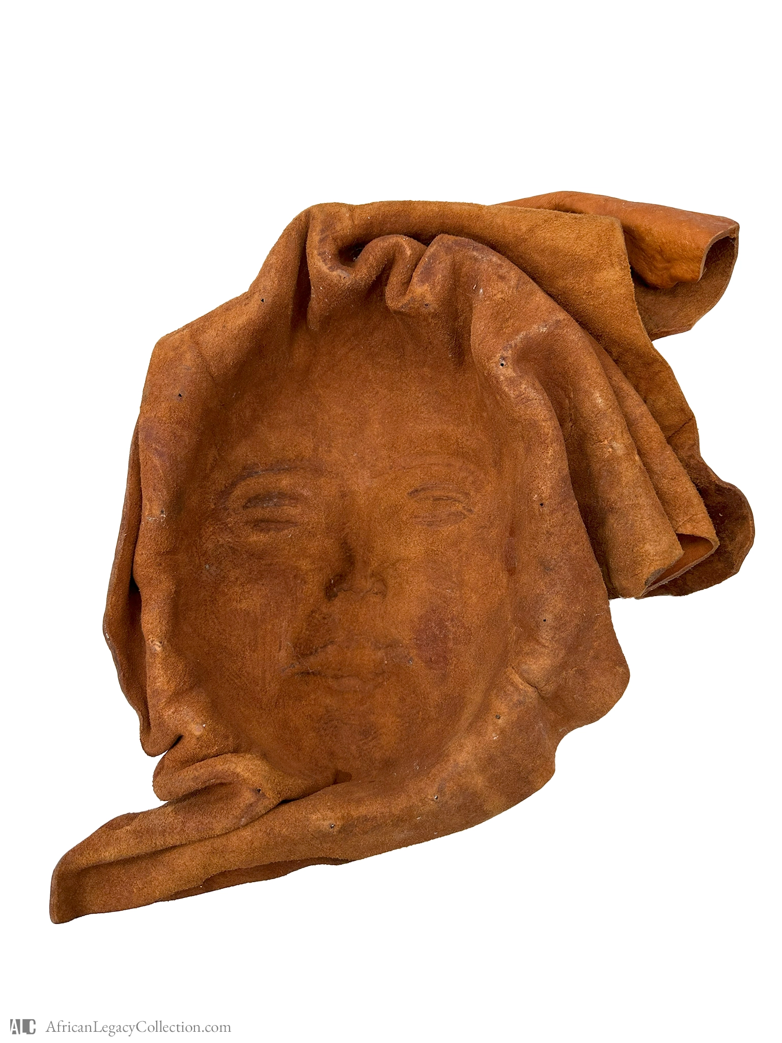 This artifact is a sculpted leather mask, likely originating from West Africa. Its purpose is ornamental, possibly used in traditional ceremonies to represent ancestral spirits or other cultural figures. The craftsmanship suggests an artistic representation common in various African societies.