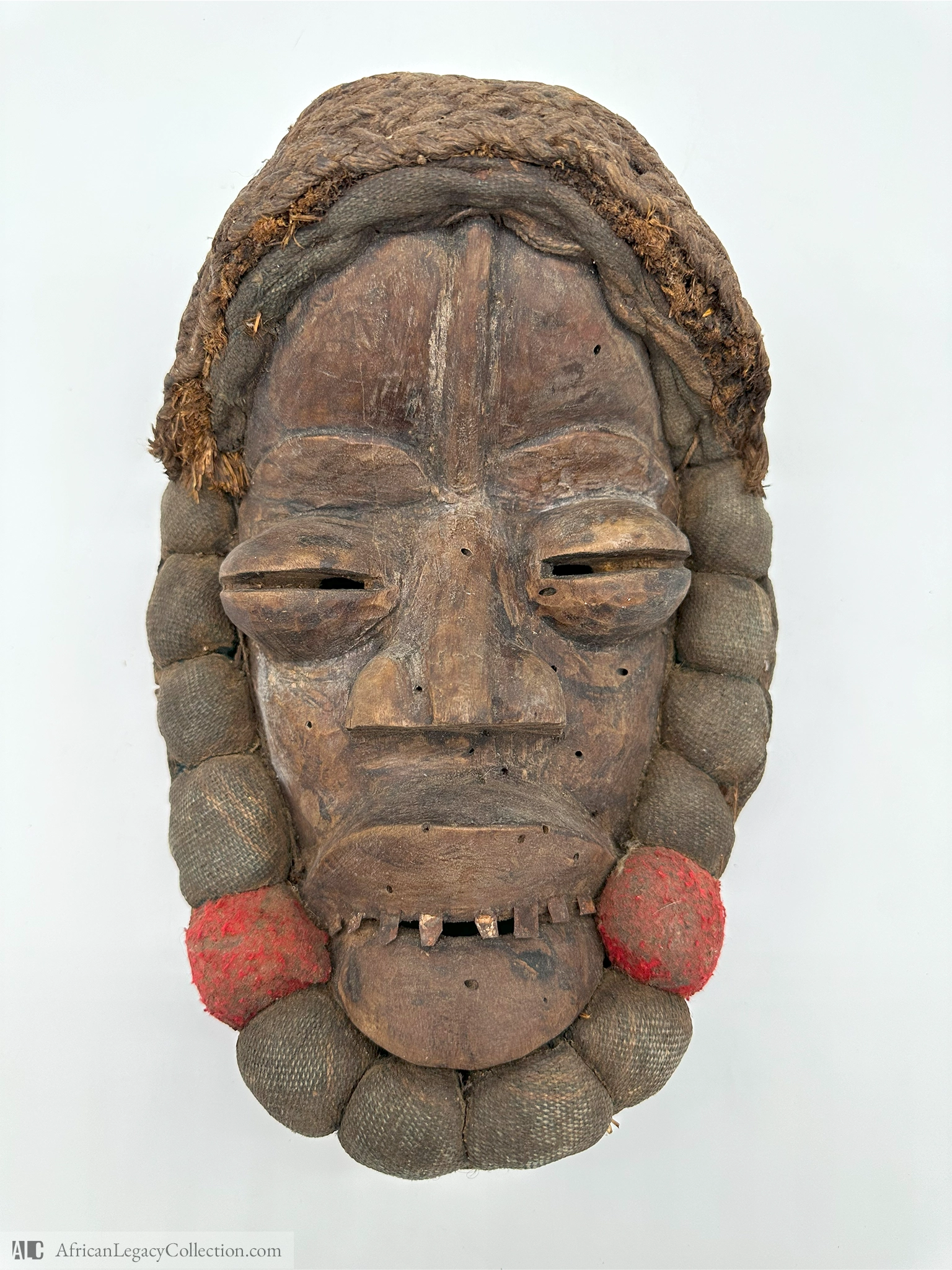 Crafted primarily from wood, the mask features fabric elements and color accents, suggesting additions to enhance its visual impact during rituals. The use of natural materials is consistent with traditional African mask-making techniques. This artifact highlights the cultural significance of masks in Dan society, symbolizing various societal roles and spiritual entities.
