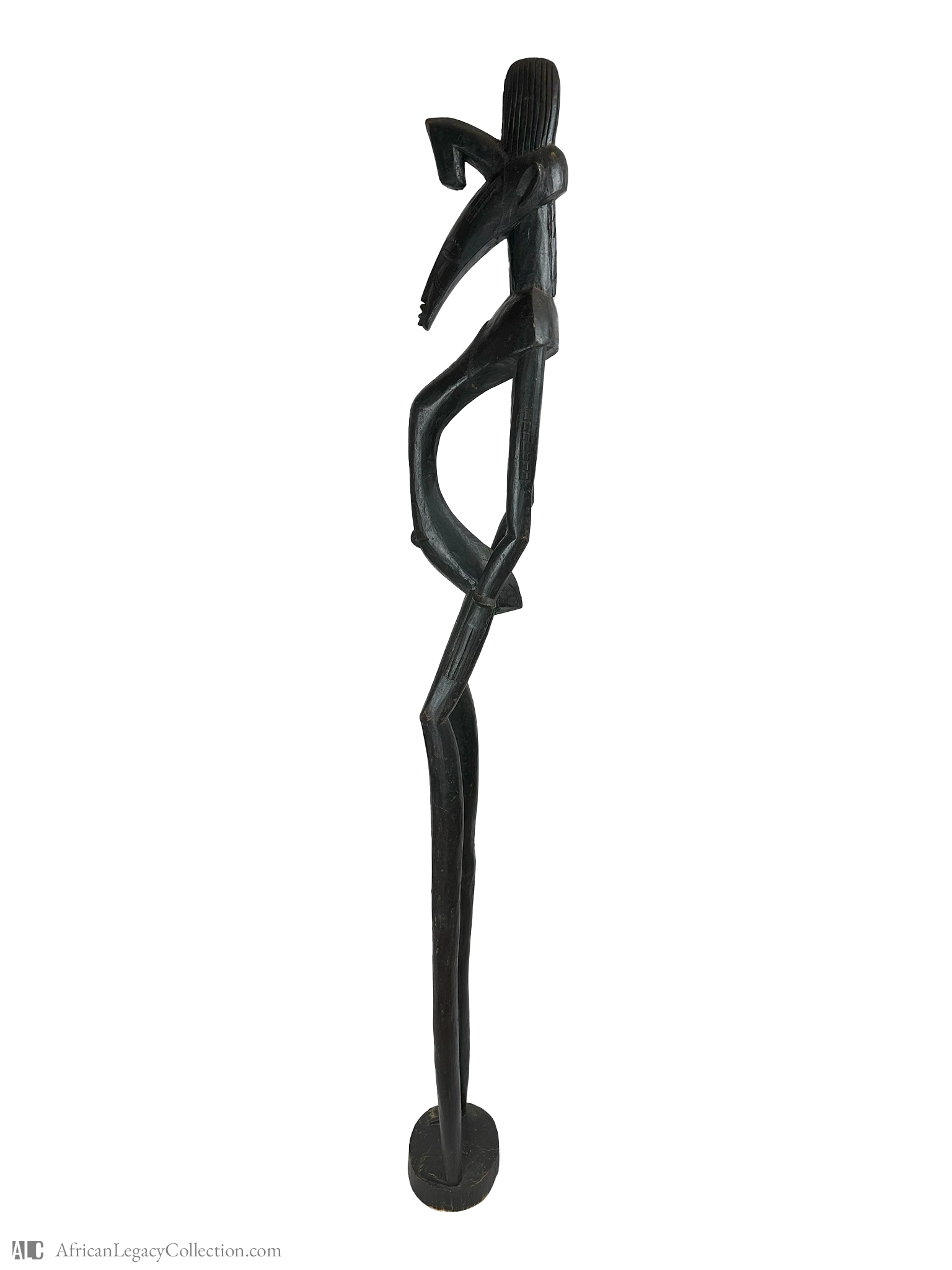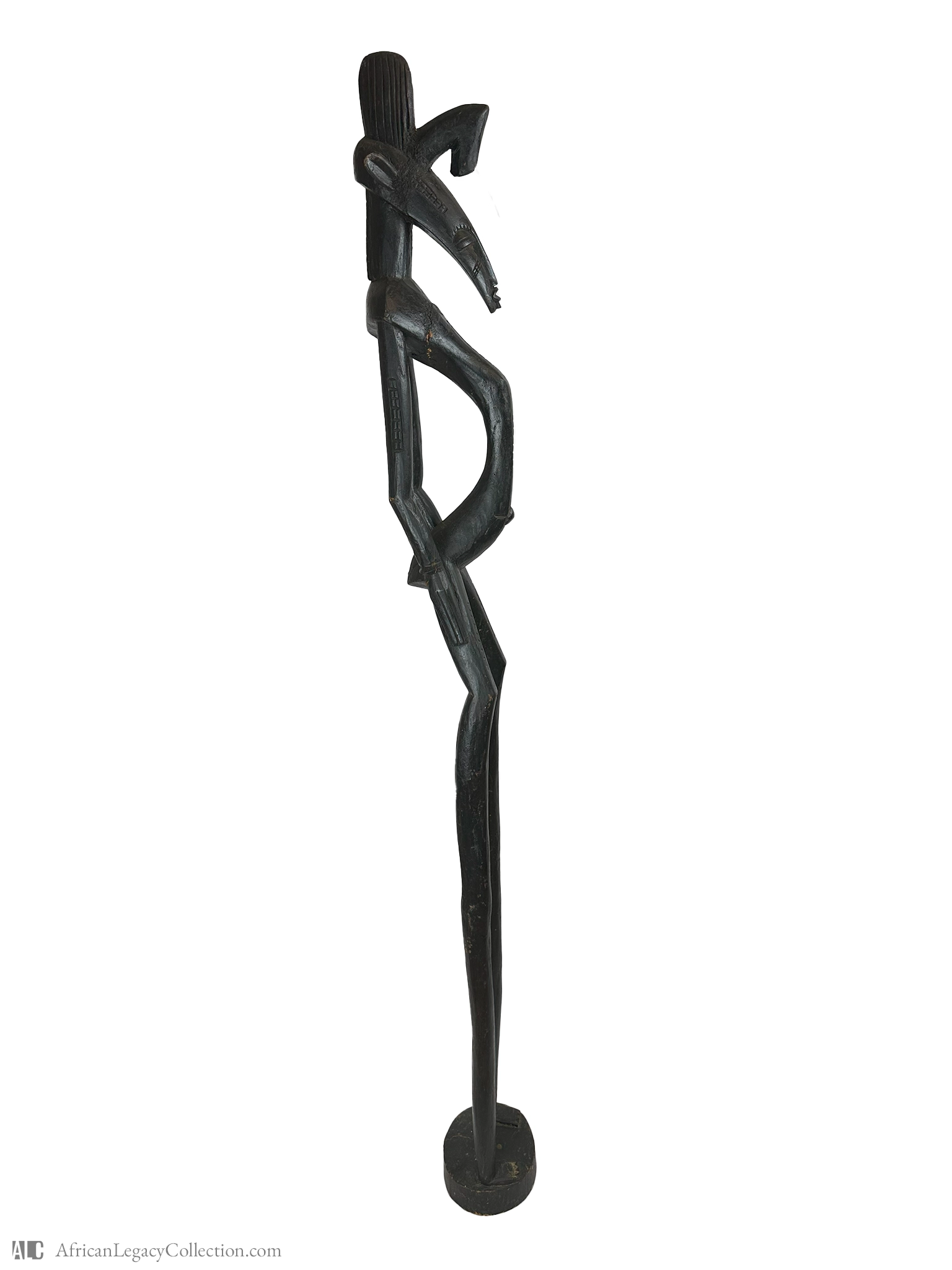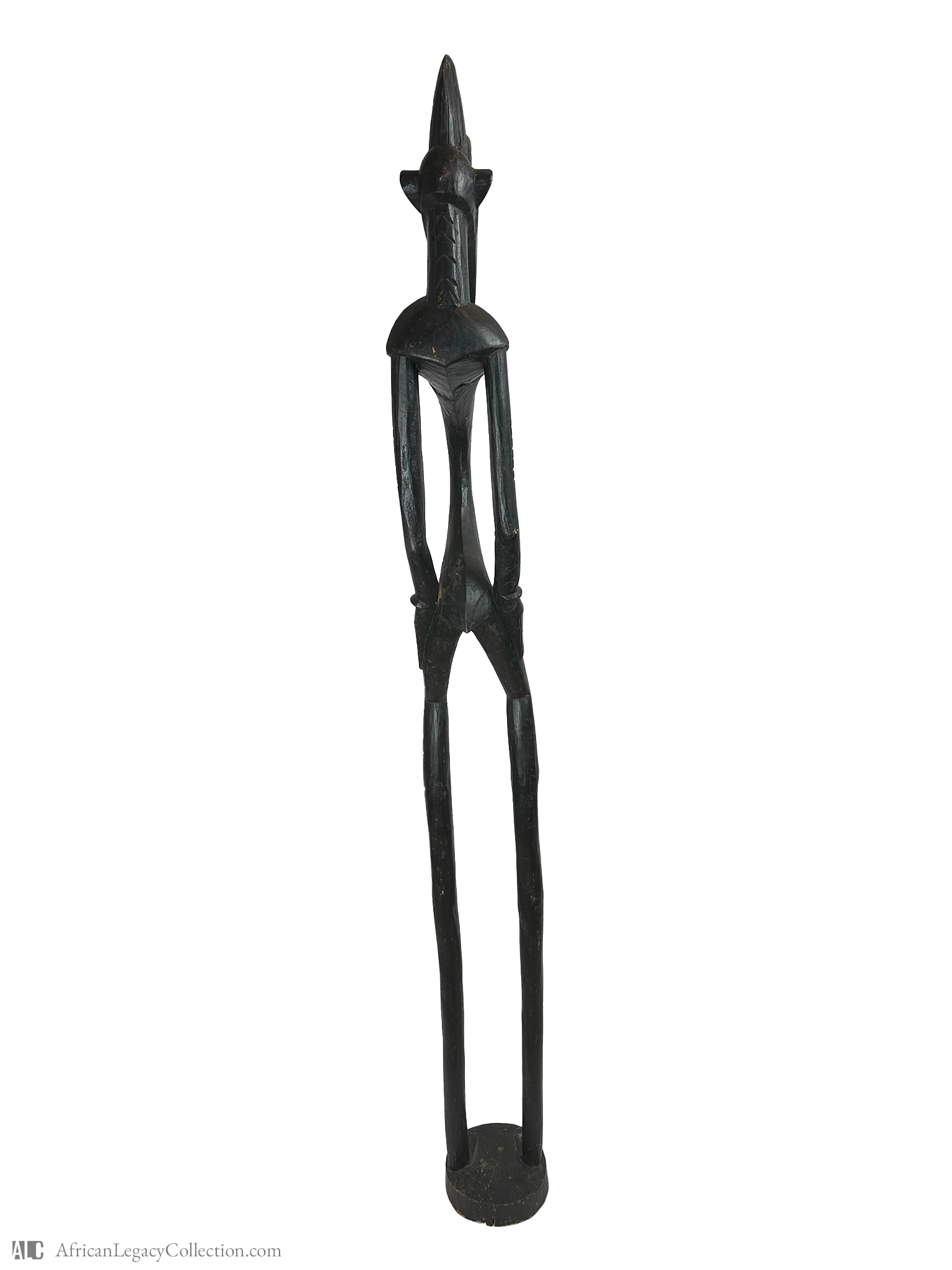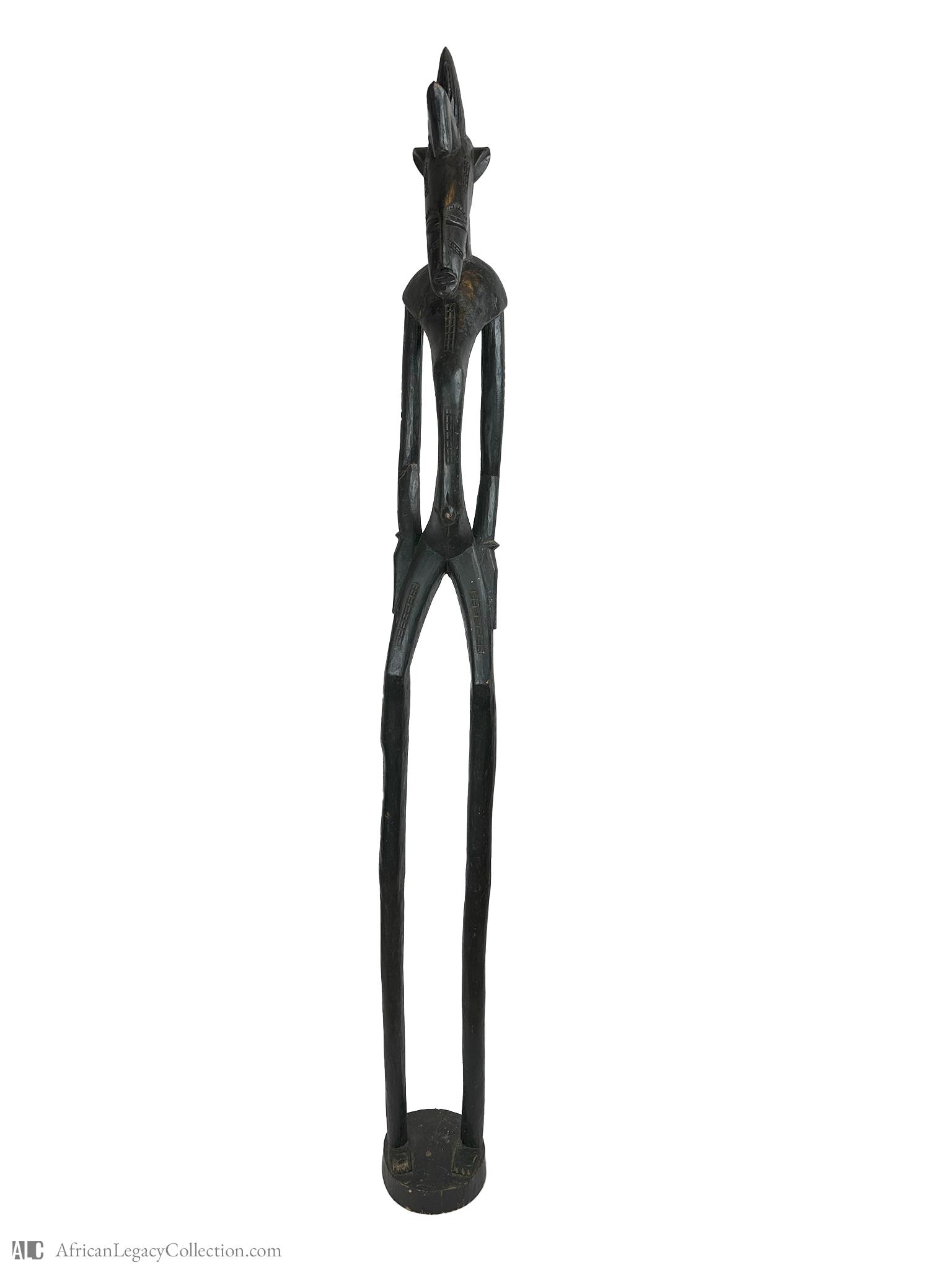 This sculpture represents an anthropomorphic figure from West Africa, often used in traditional rituals or as a protector of villages. The elongated form and distinctive facial features suggest its purpose as a spiritual or ceremonial object, commonly associated with tribal cultures in the region.