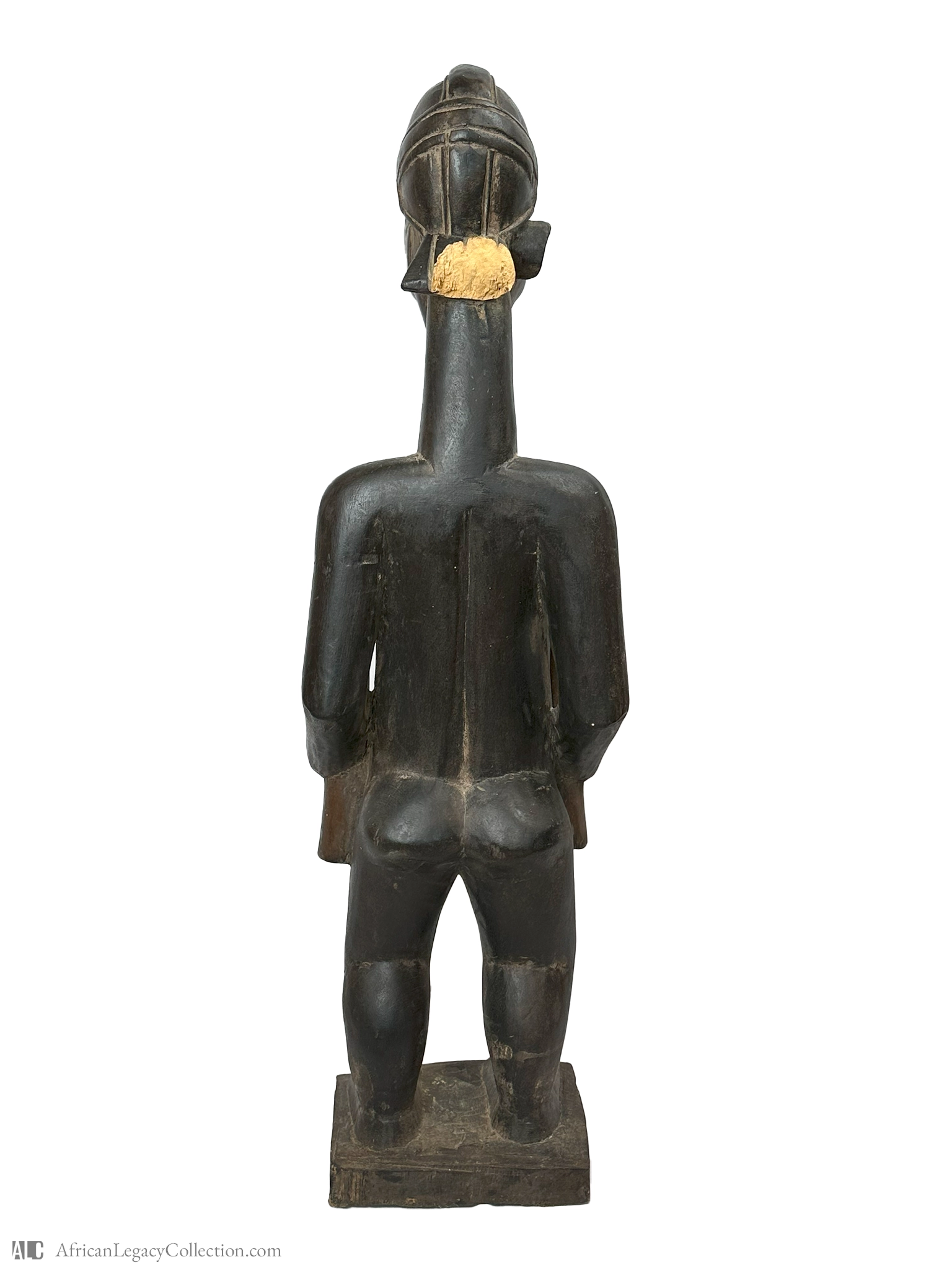 This wooden sculpture likely originates from a Central African ethnic group, known for its anthropomorphic stylization and intricate carvings. The figure appears to represent a significant cultural or spiritual entity, possibly used in ceremonial contexts to embody ancestral spirits or deities, reflecting its spiritual significance within the community.