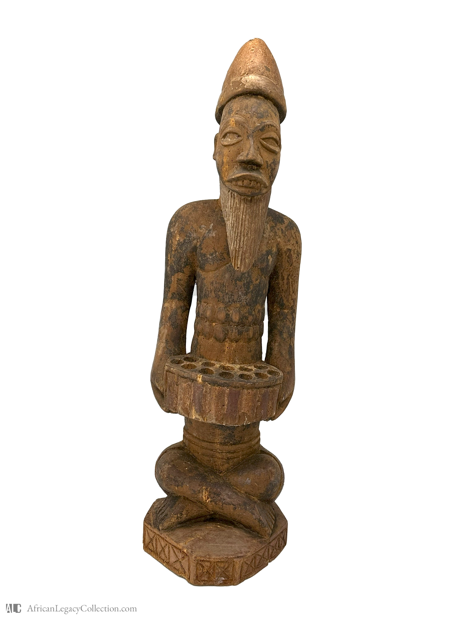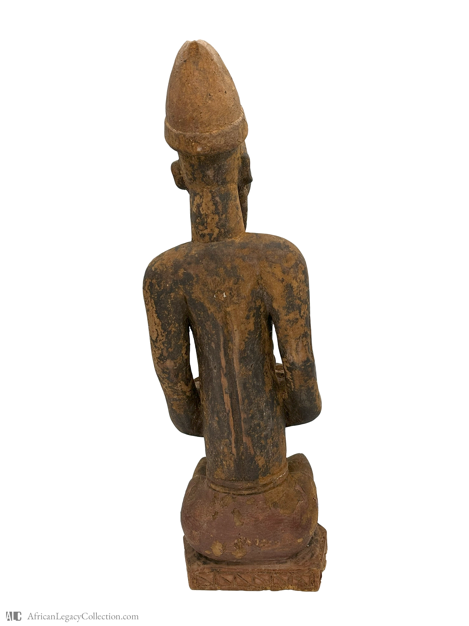 Carved from wood, this piece exhibits incised striations and a patina indicative of age and traditional crafting techniques. Its historical context may be linked to the representation of ancestral veneration or societal structures in African communities. The figure’s stylization and details highlight the artisan’s skill in anthropomorphic depiction, which plays a significant role in the artifact’s cultural influence and aesthetic value.