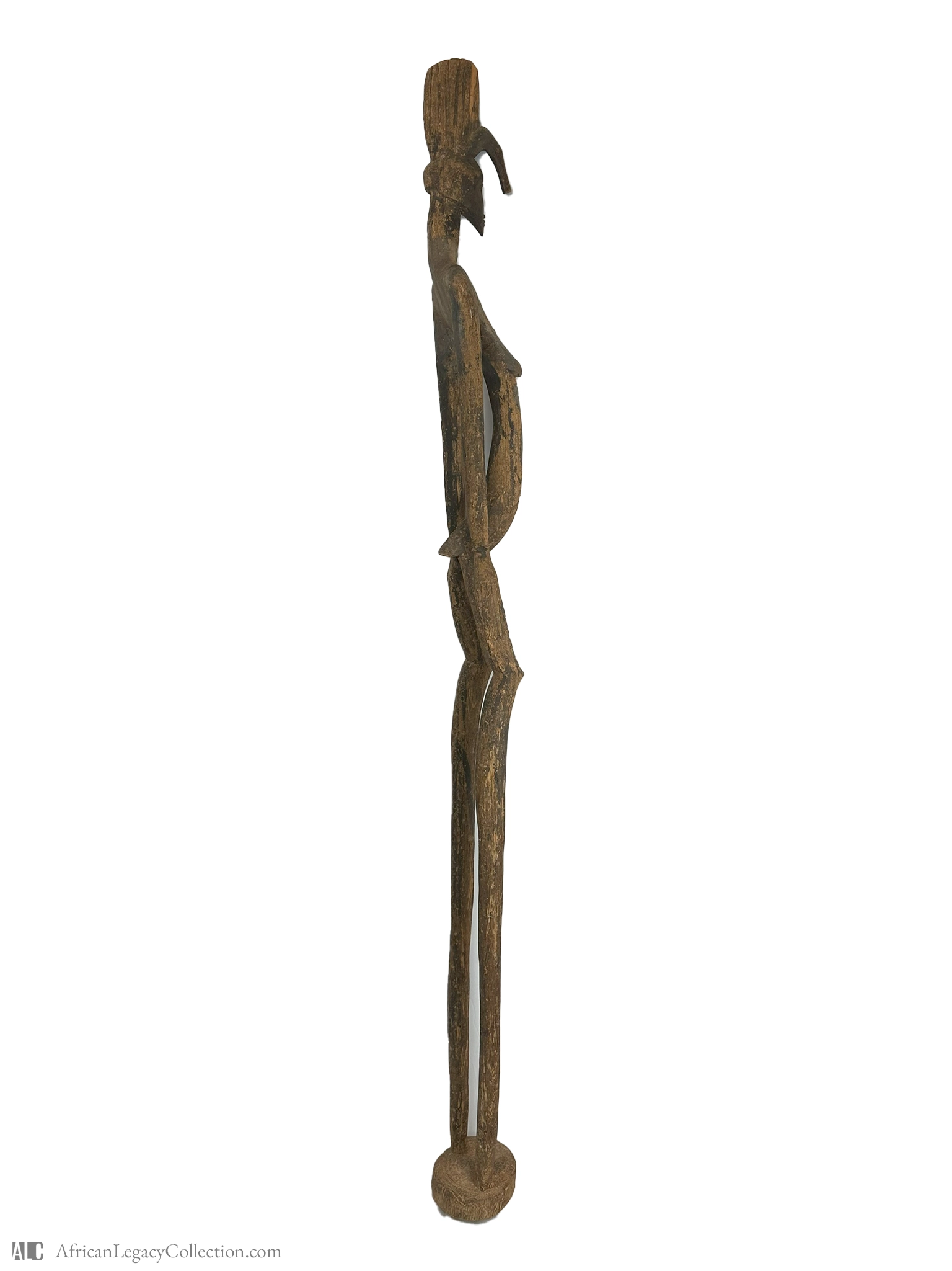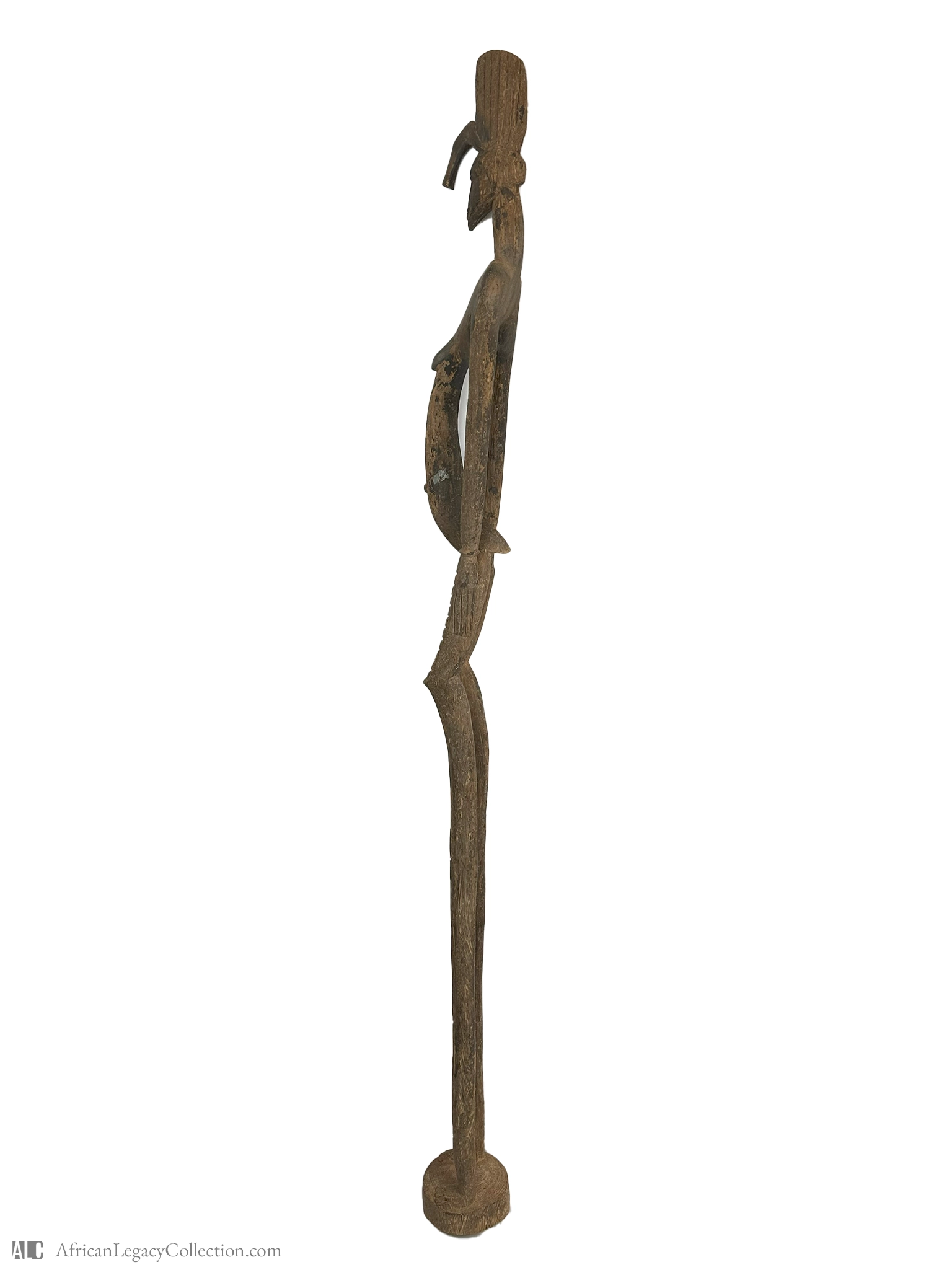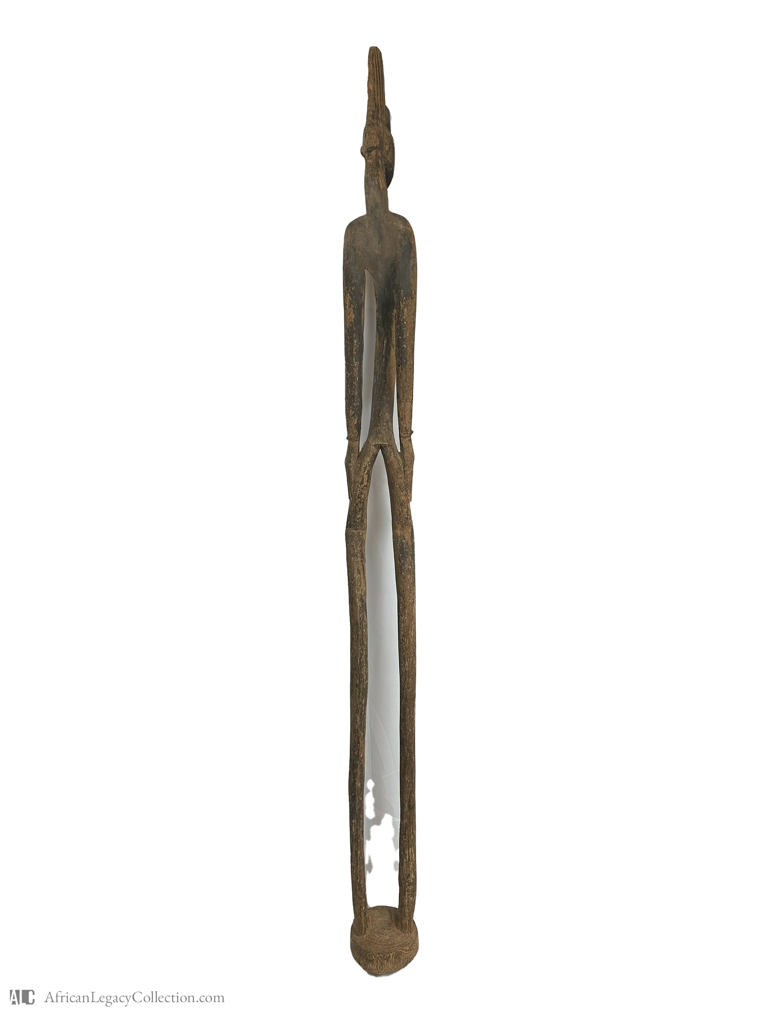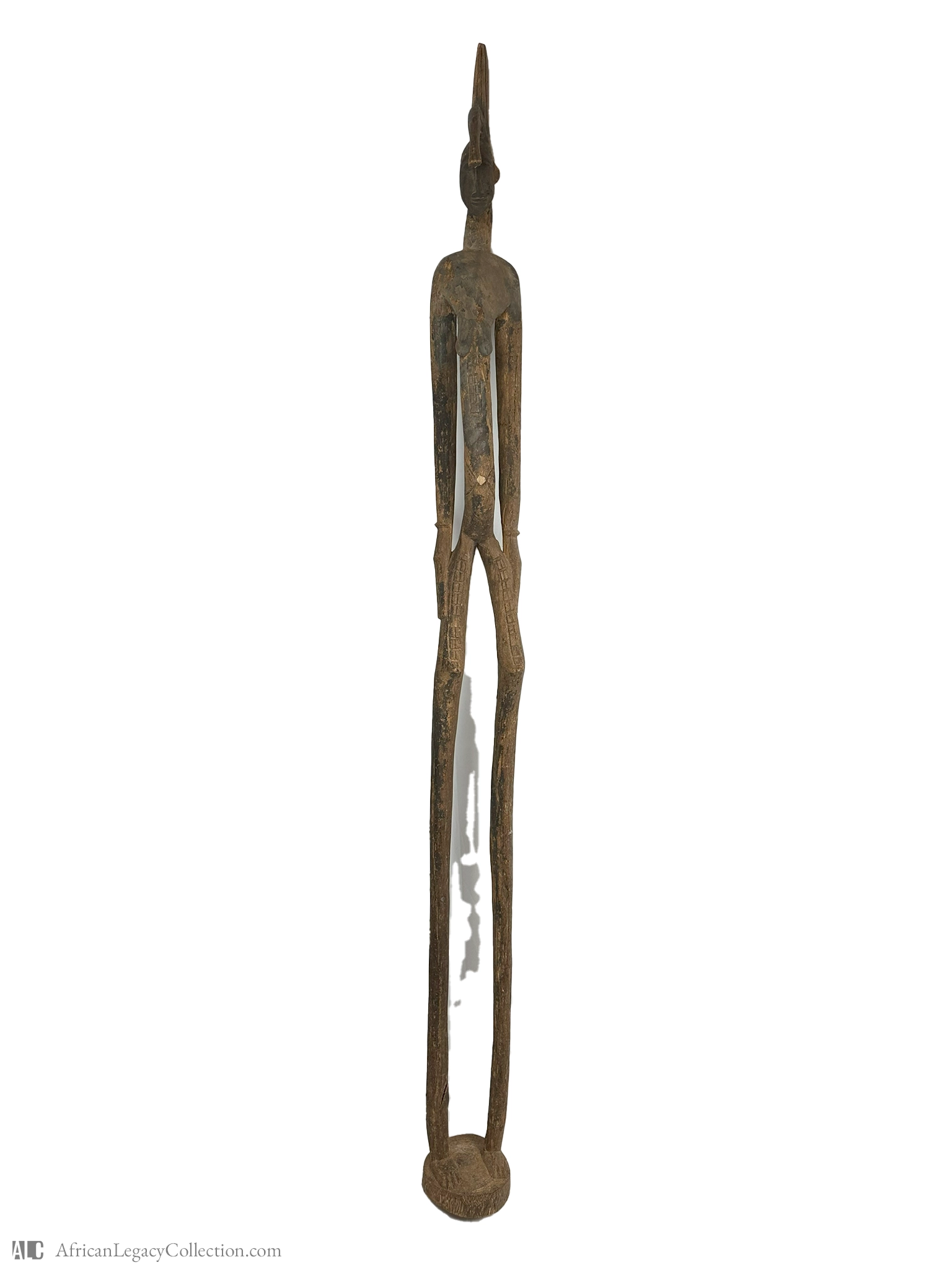 This elongated wooden sculpture is a representation of an ancestral figure, likely originating from the Dogon people of Mali. Such figures typically serve both religious and protective purposes, often used in rituals to connect with the ancestors or as guardians over villages and families.
