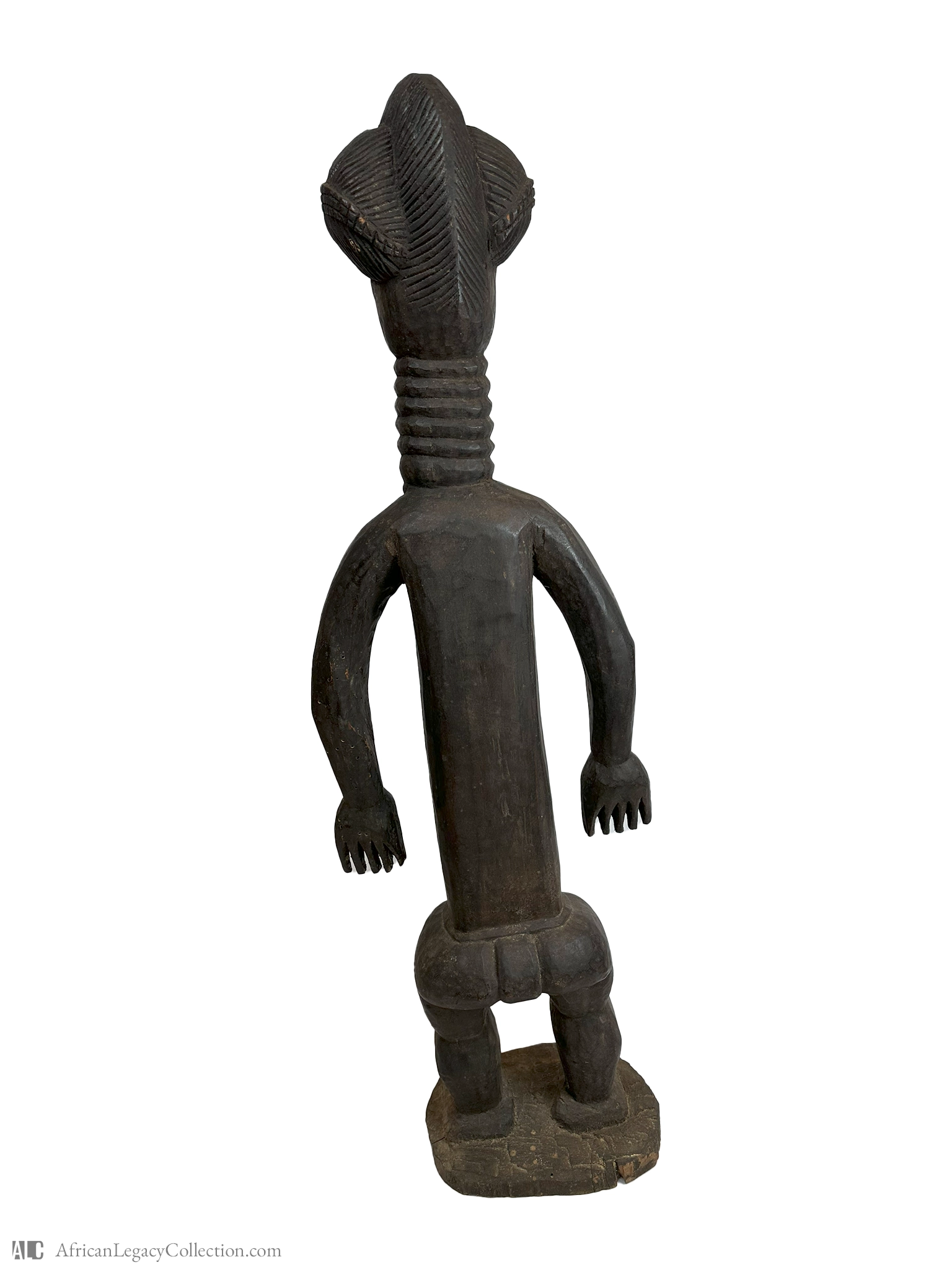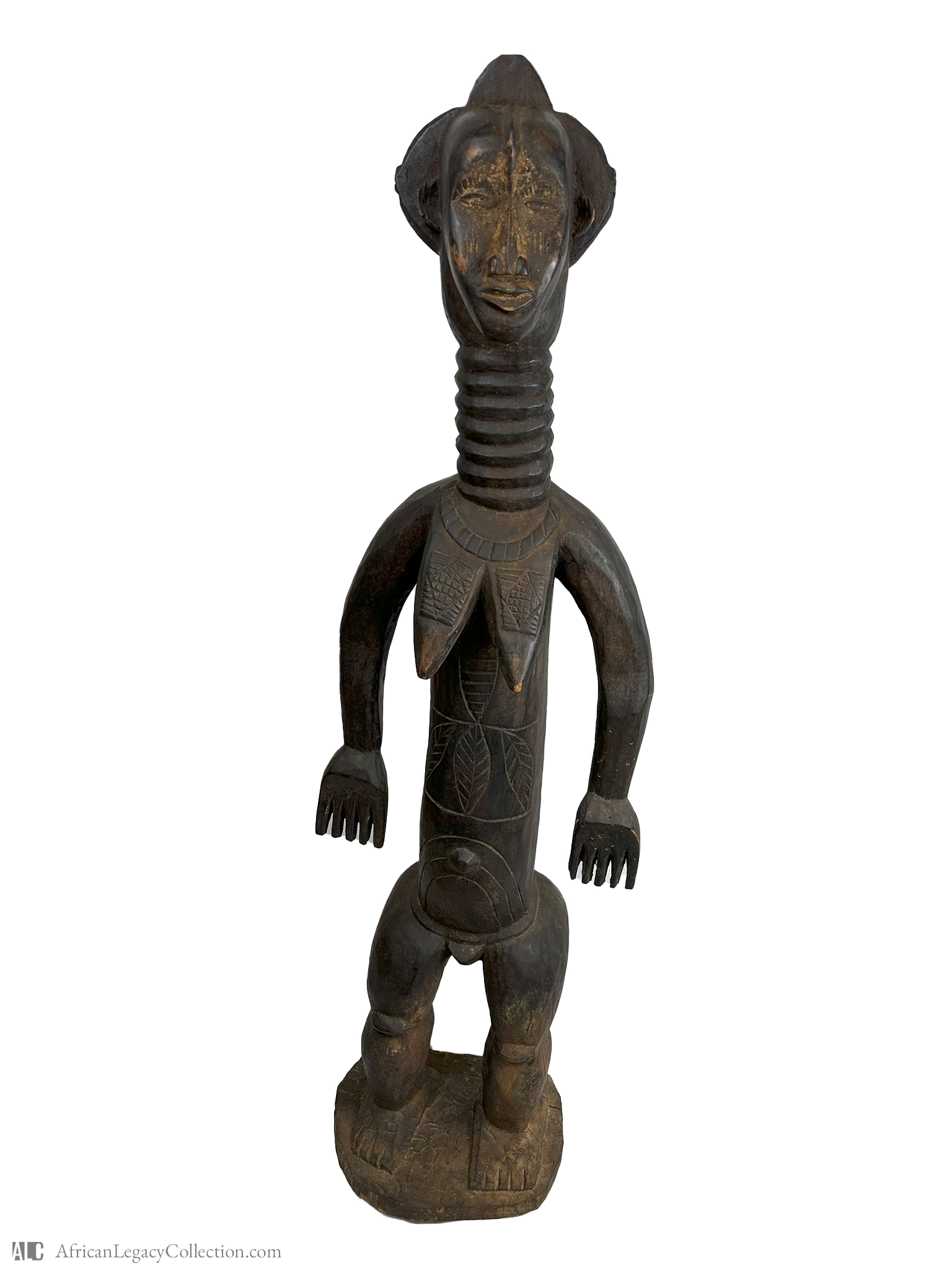 This sculpture likely represents an ancestral figure from Central Africa, possibly linked to a sociocultural group that values lineage and heritage. The elongated neck and body proportions, together with the carved motifs, suggest its use in rituals or as a representation of tribal lineage, reinforcing cultural continuity and social cohesion.