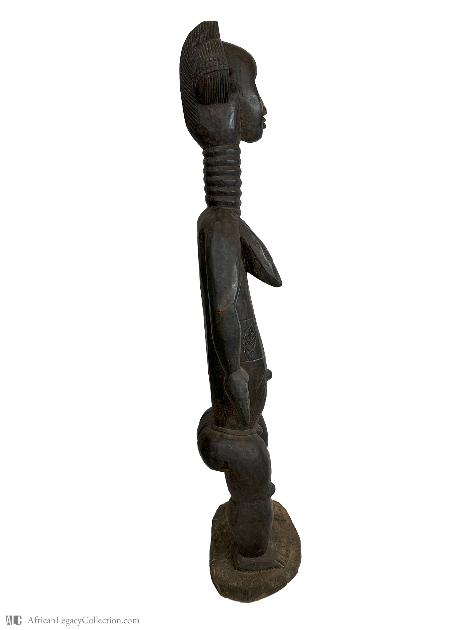 Crafted from wood, the figure displays adept skill in carving techniques, indicated by its detailed and incised designs, possibly using methods like incised striations. Historically, such figures have been significant in communities for their role in ancestor worship and spiritual rituals, serving as a connection between the physical and spiritual worlds.
