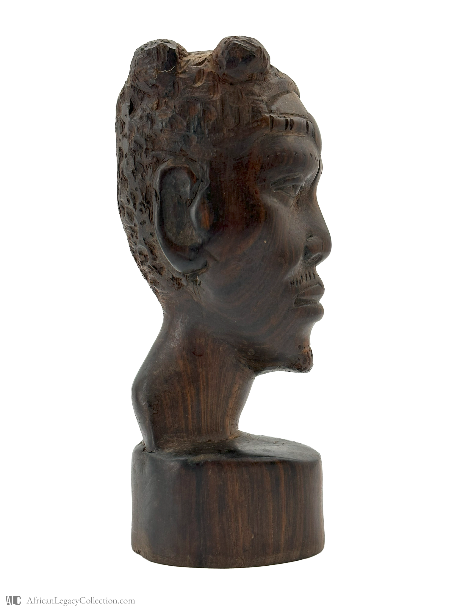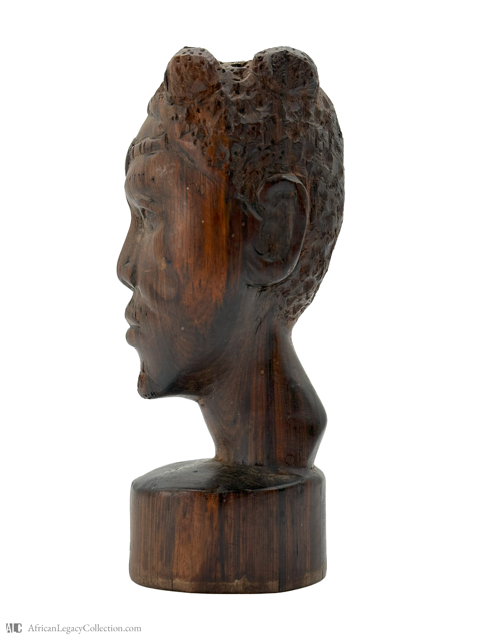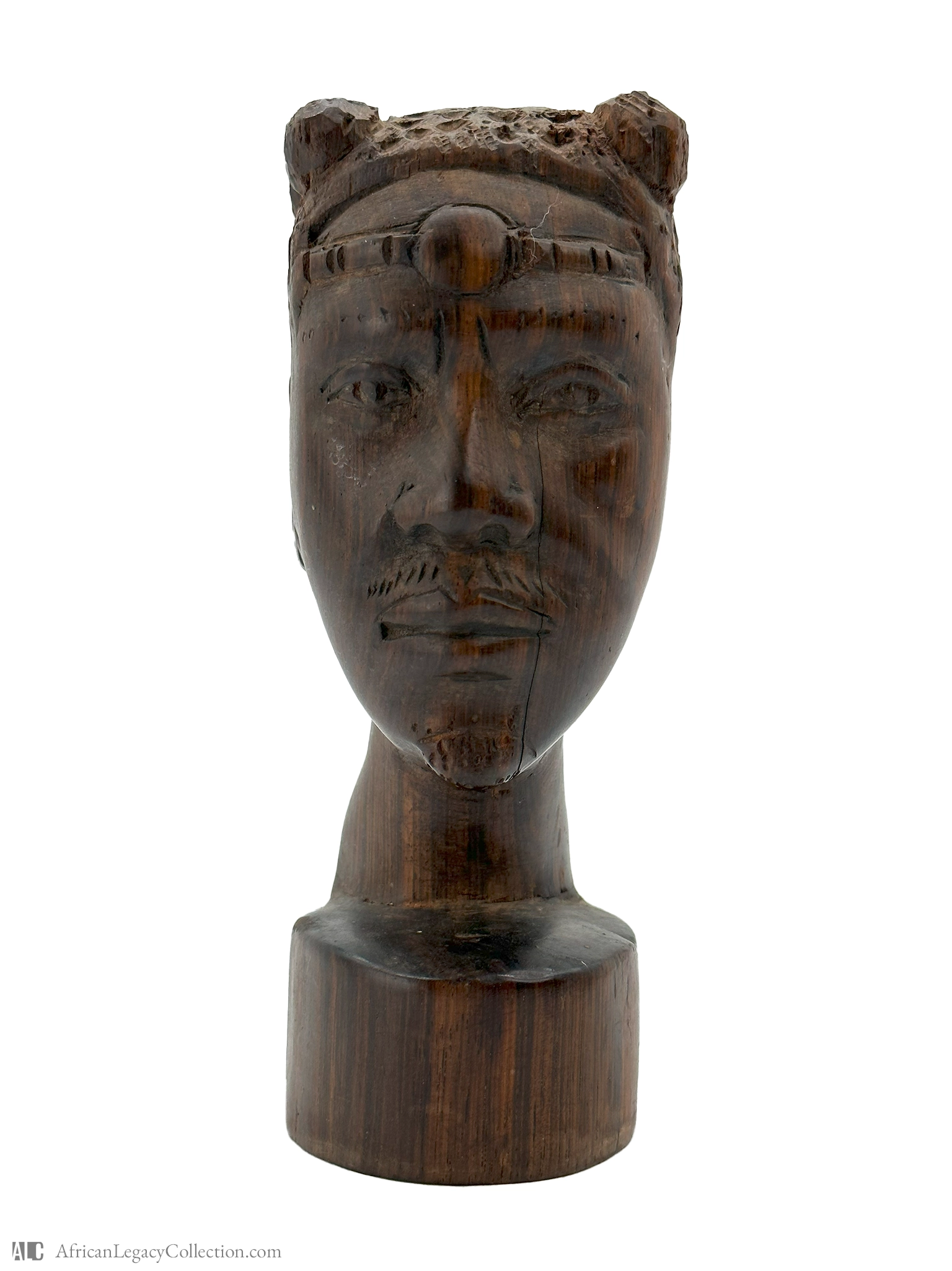 This carved wooden bust likely represents a significant cultural figure, possibly used in rituals or as a decorative piece to honor ancestors. Its stylistic characteristics suggest a probable origin from Central Africa, where traditional crafting techniques emphasize detailed facial features and expressions.