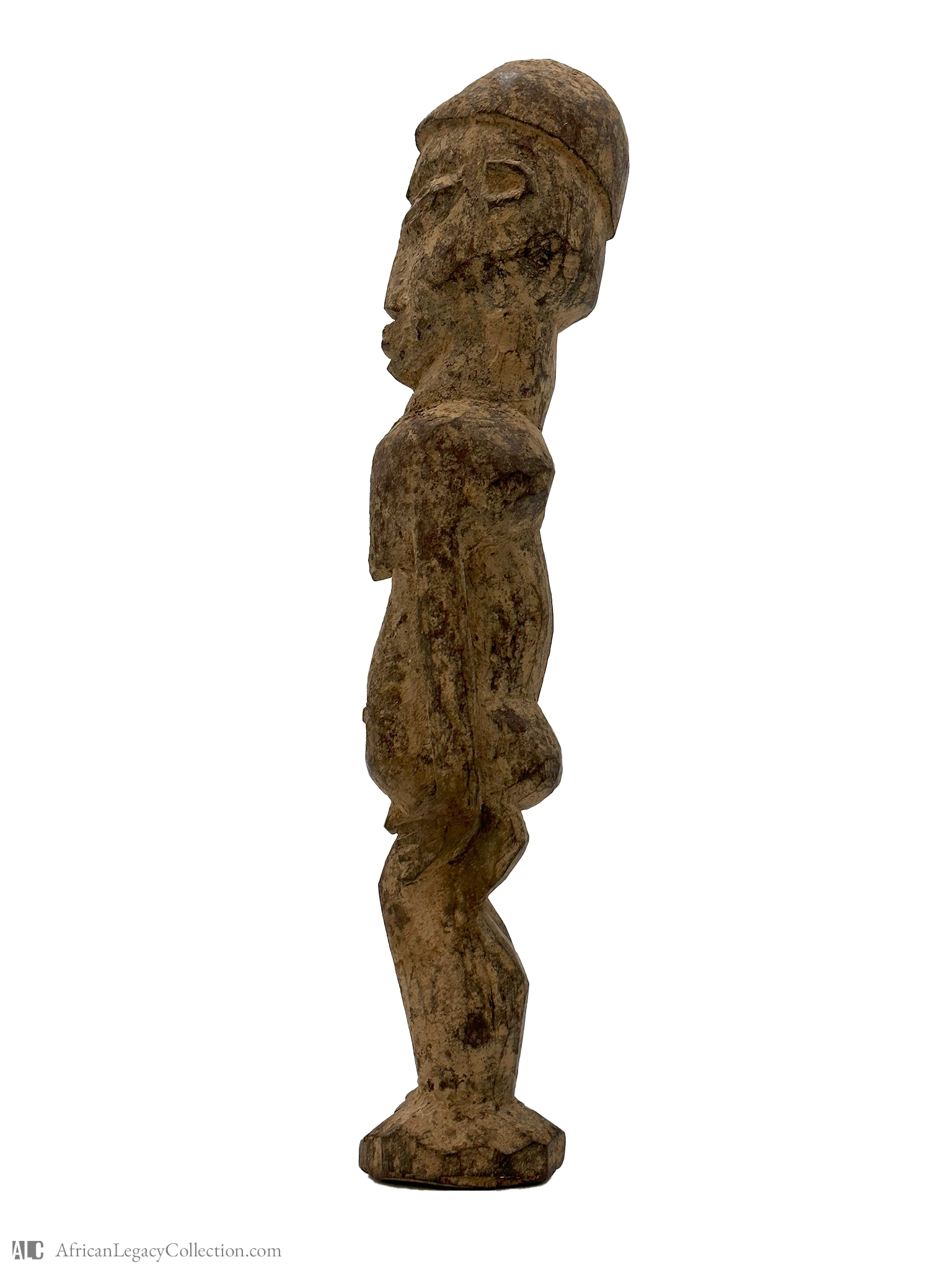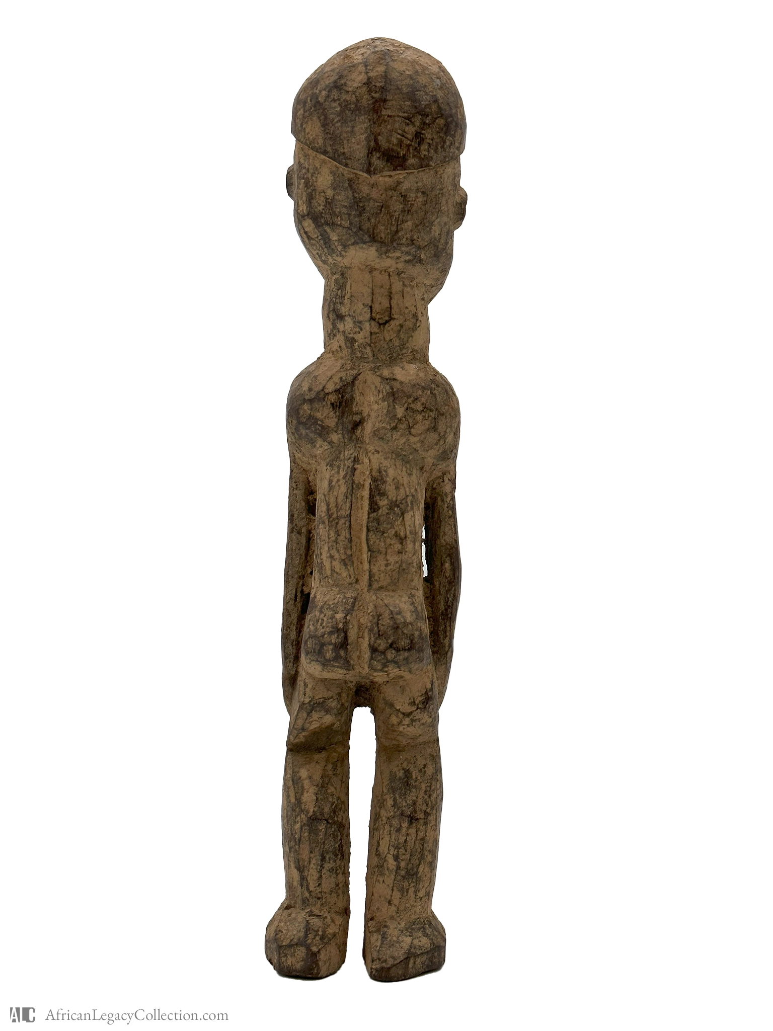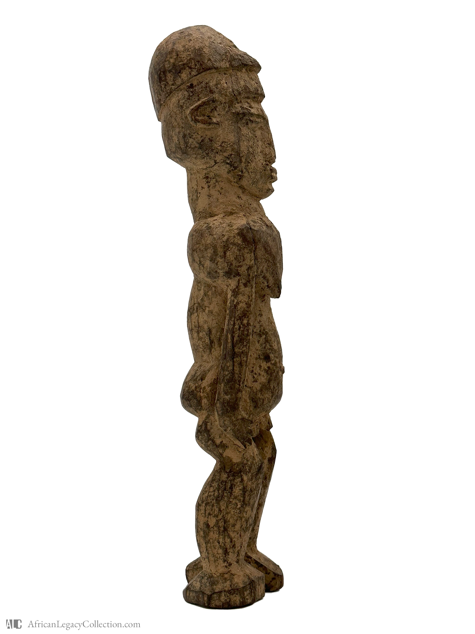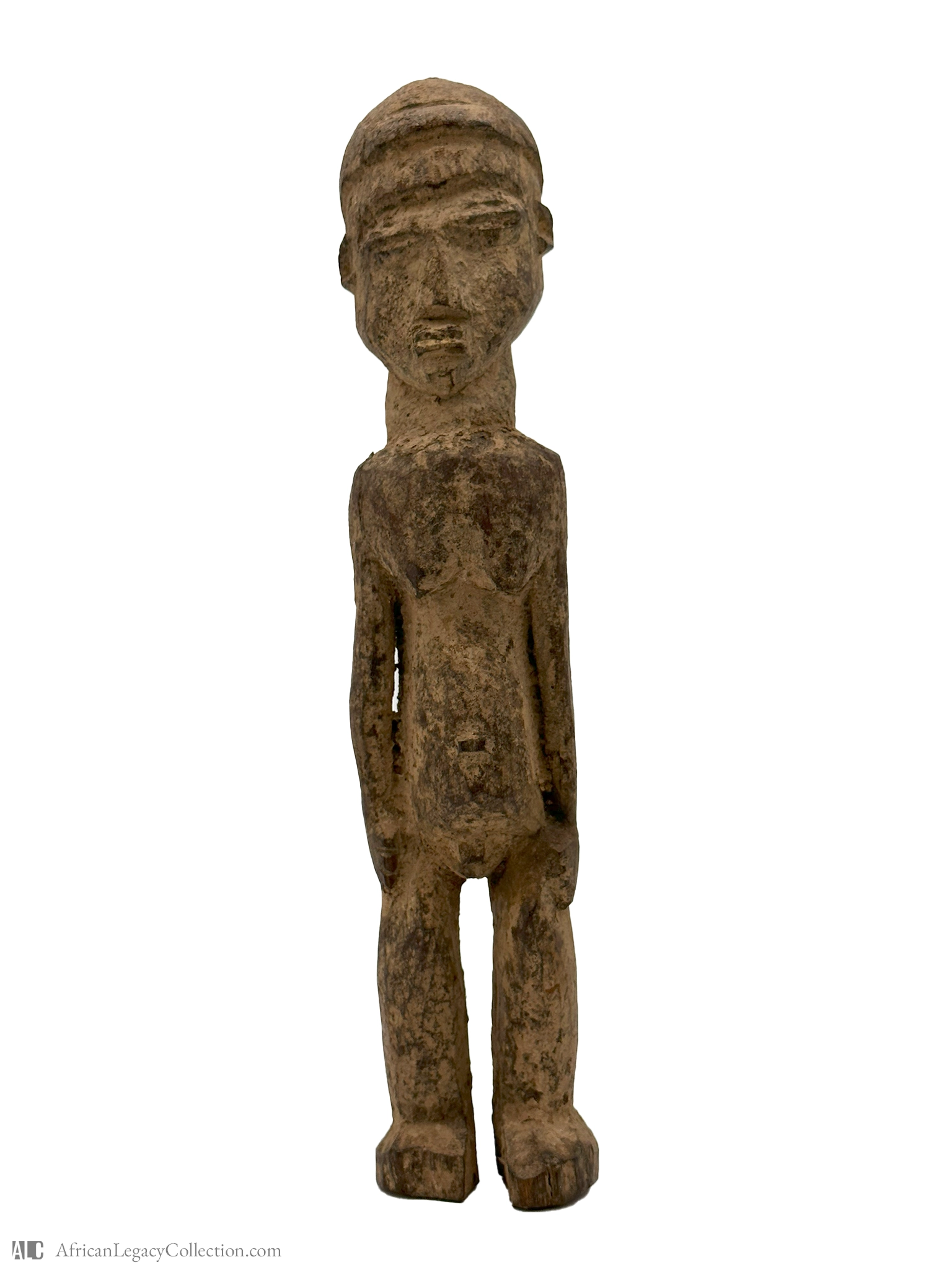 This artifact is a wooden figurative sculpture likely originating from West Africa. Characterized by its anthropomorphic stylization, the sculpture may have served a ritualistic or ancestral purpose within its cultural context. Such figures are often used in ceremonial practices or as representations of spiritual beliefs.