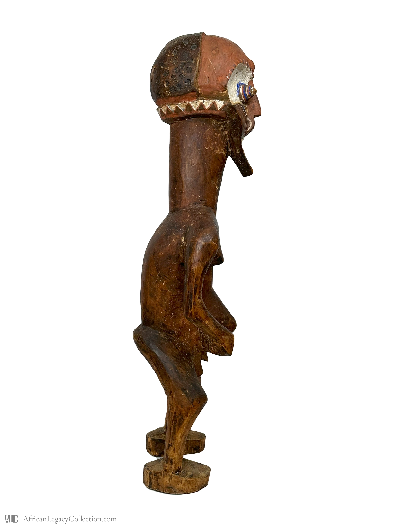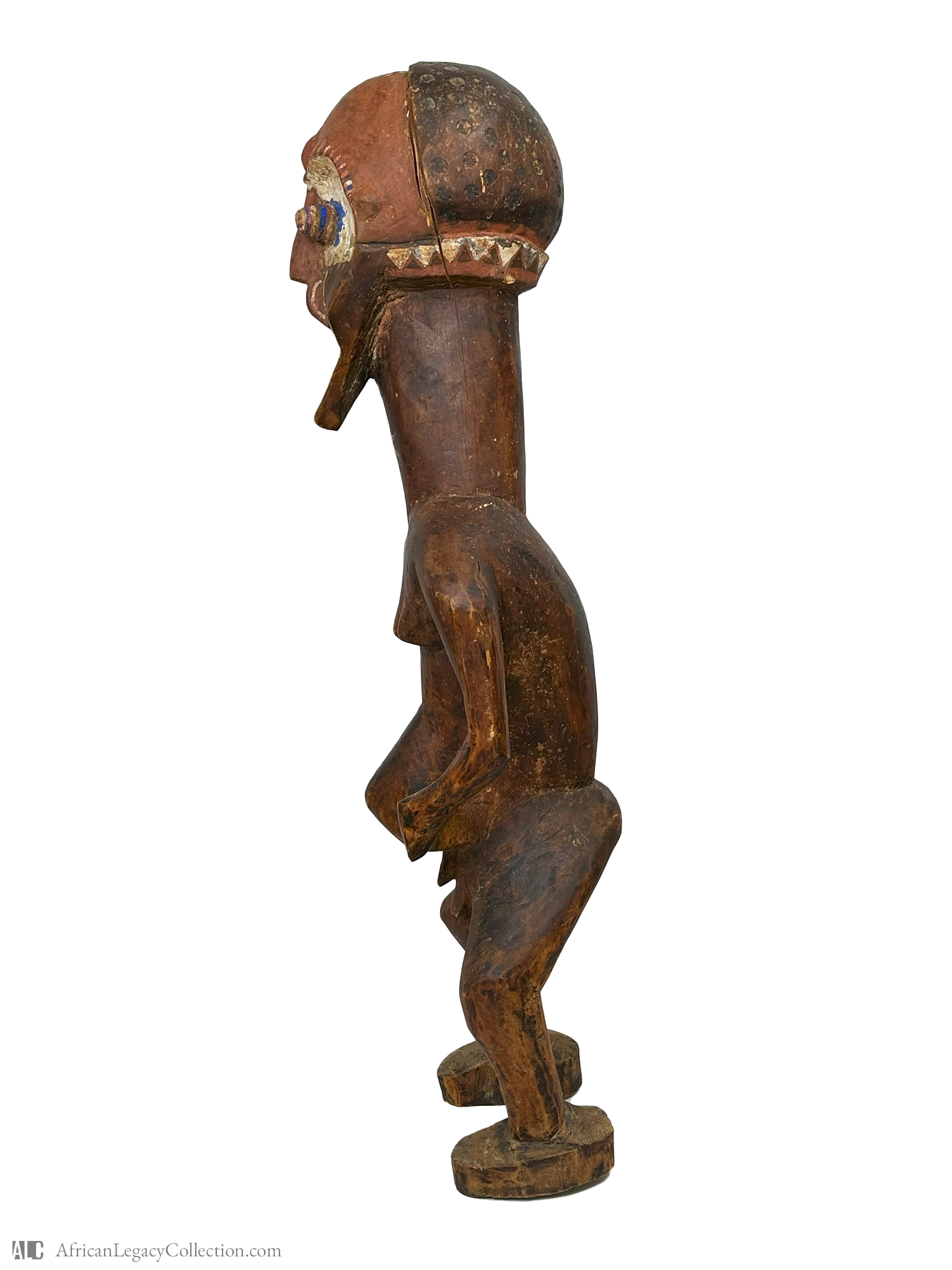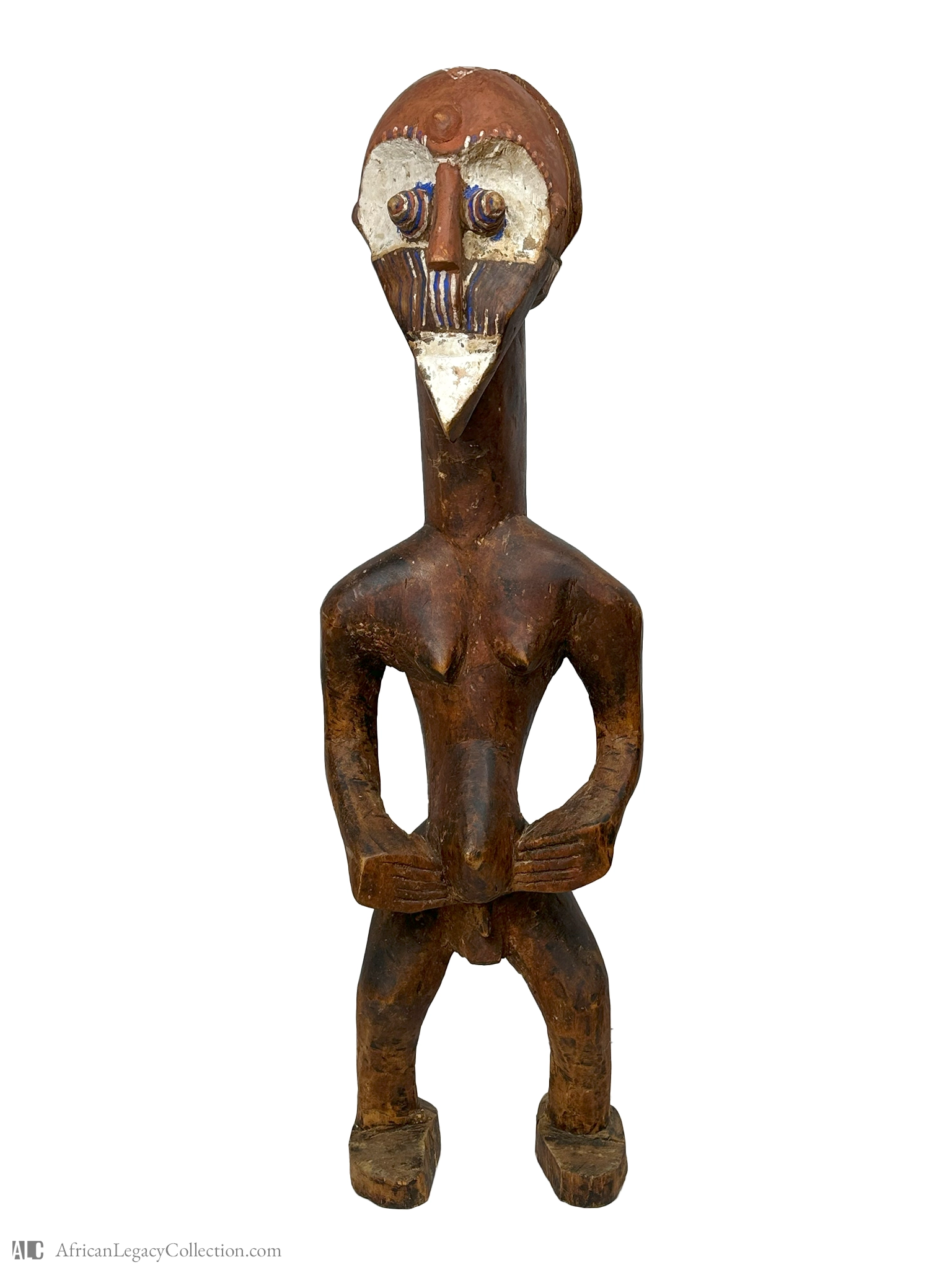 Crafted primarily from wood, the figure demonstrates evidence of polychrome coloring, enhancing its visual and symbolic impact. The use of scarification motifs indicates a connection to identity and ancestral honor, resonating with historical practices of the early to mid-20th century. Such figures were integral to the social and spiritual fabric of the communities that produced them.