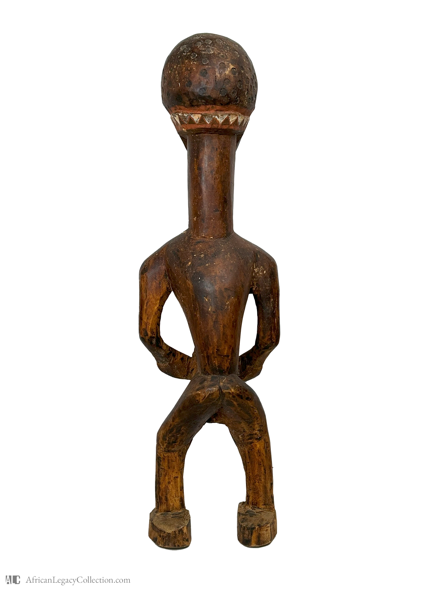 This artifact is a wooden figure likely used for ritualistic purposes, originating from Central Africa. The anthropomorphic design suggests its role in spiritual or ceremonial practices, possibly to invoke protection or fertility. The prominent facial features and stance are characteristic of cultural expressions found within this region.