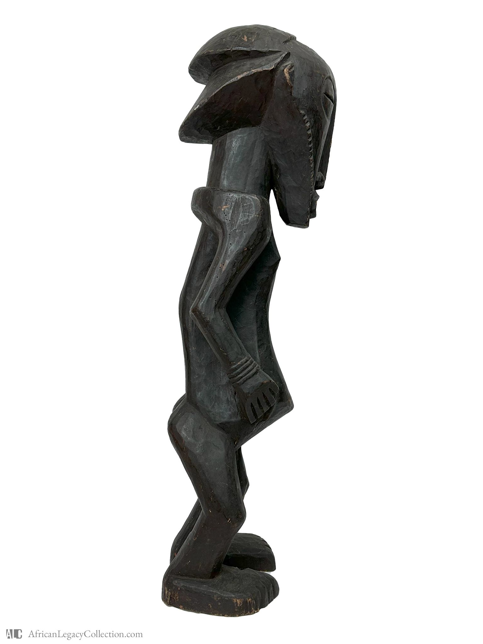 This anthropomorphic statue is a ritual figure likely originating from West Africa. It represents a human form, distinct in its stylized features, which suggests it may have been used in ceremonial or protective contexts. The elongated proportions and specific facial features are indicative of cultural artistry aimed at embodying spiritual or ancestral connections.