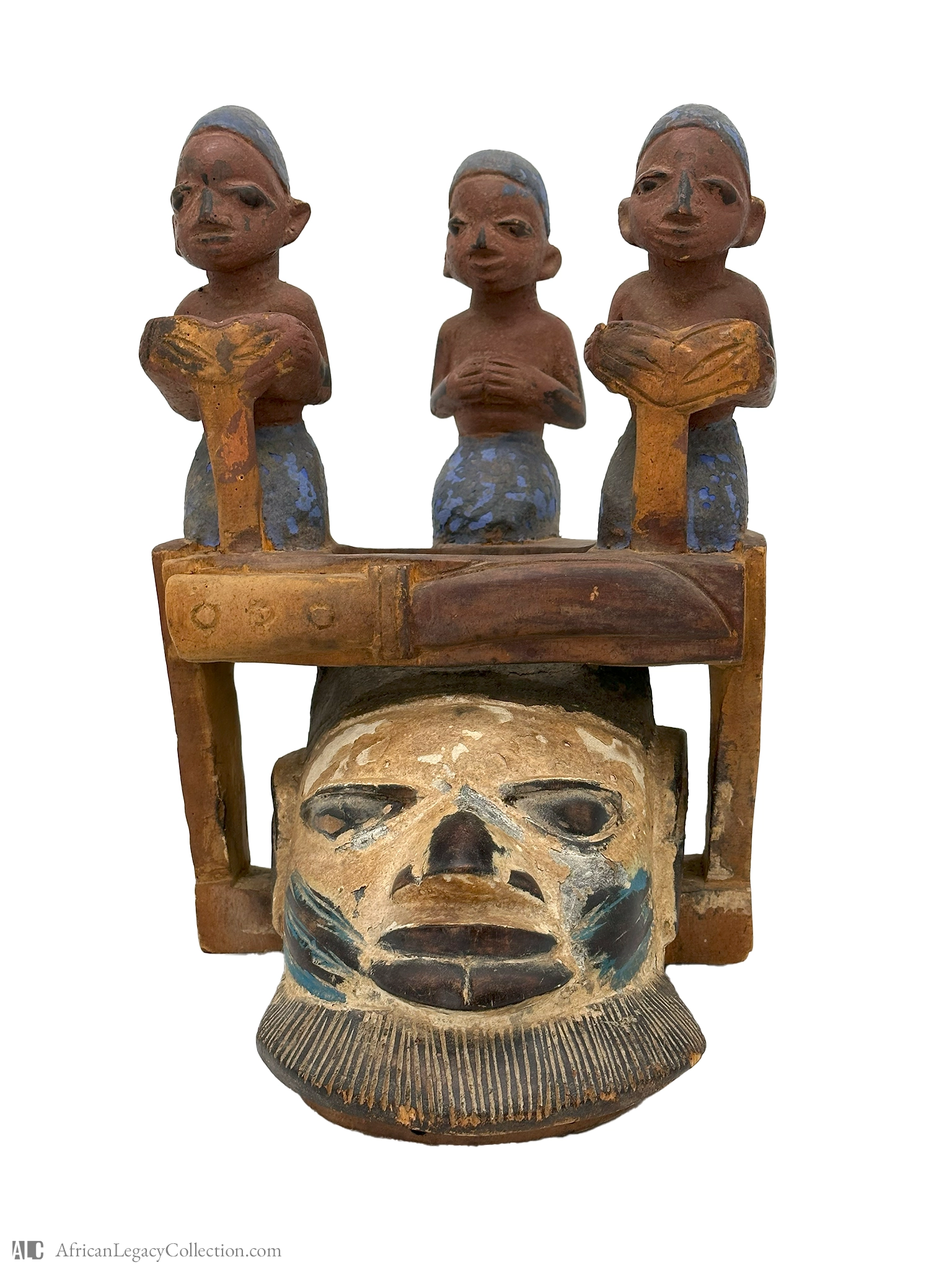 This wooden artifact is a headdress likely originating from West Africa, possibly associated with the Yoruba people. Its primary purpose is ceremonial, used in rituals to connect community members with their ancestors or spiritual entities.