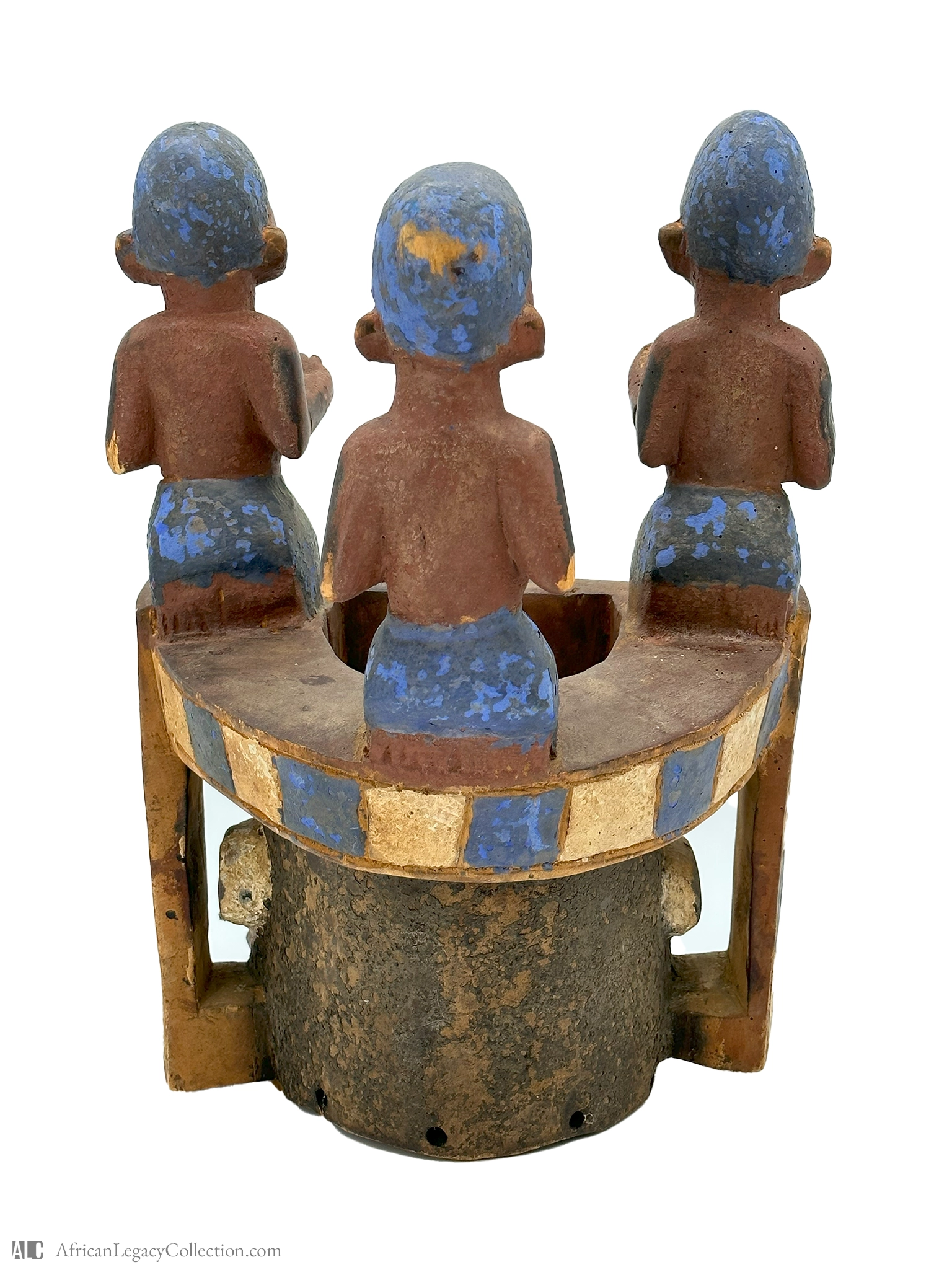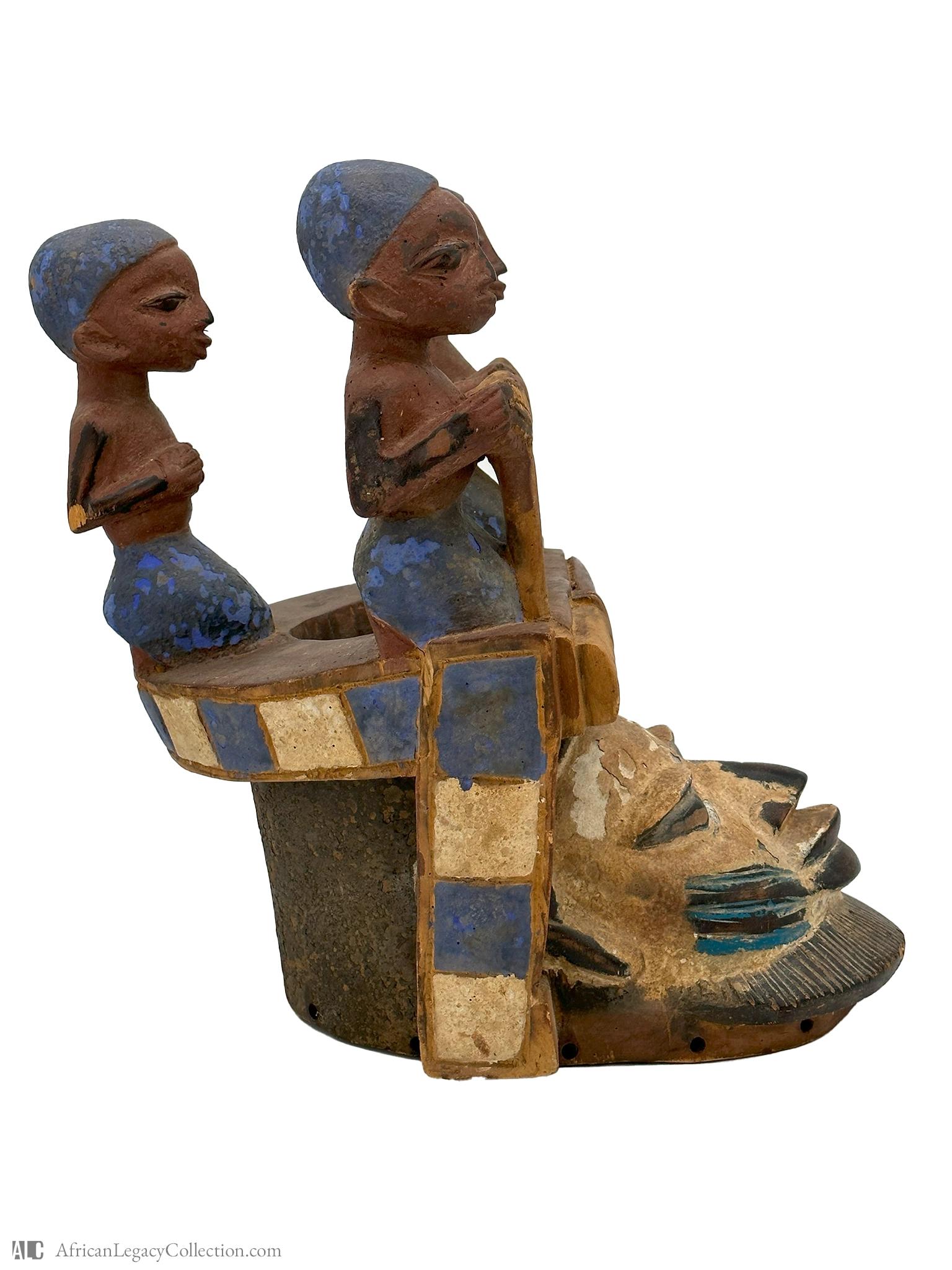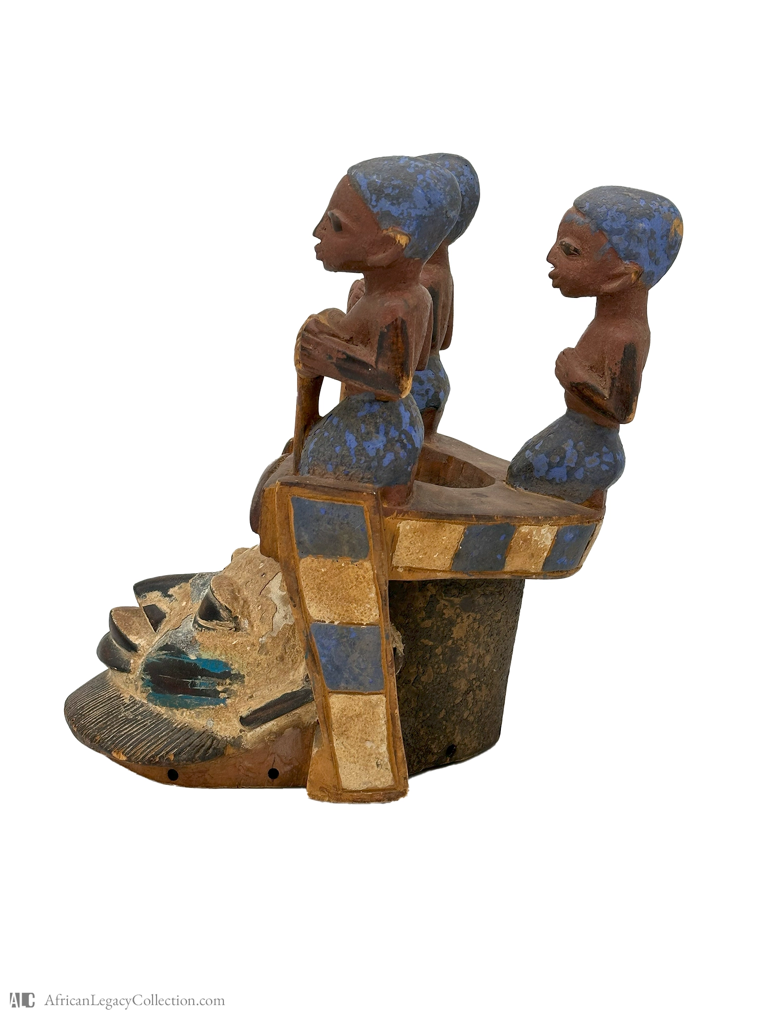 Crafted from wood and adorned with polychrome residues, the piece reflects a sophisticated artistic tradition. The layered paint highlights its significance and use in ceremonial contexts. This headdress embodies the cultural history and social practices of its origin, serving as a vivid testament to the artistry and spiritual life of the society.