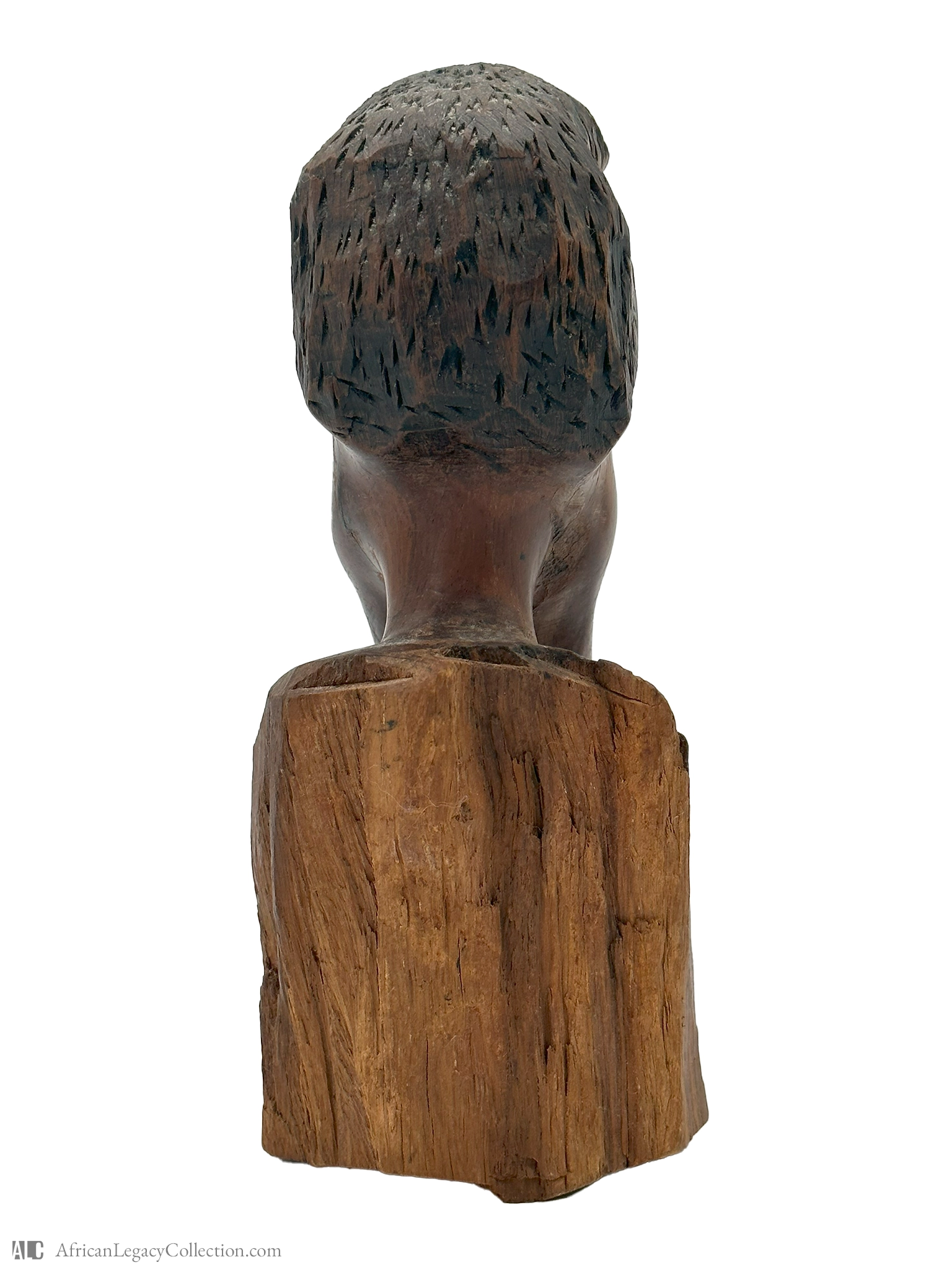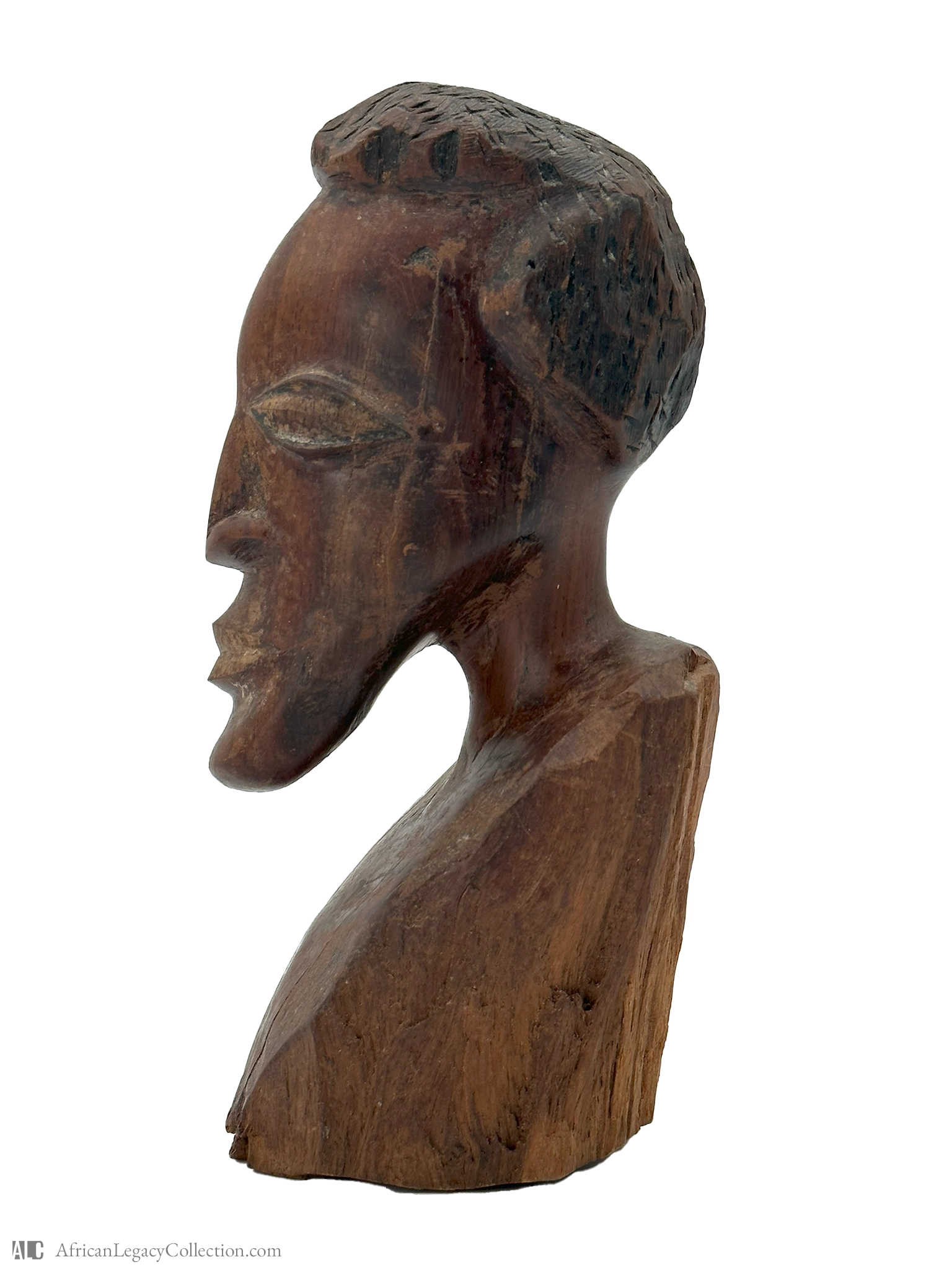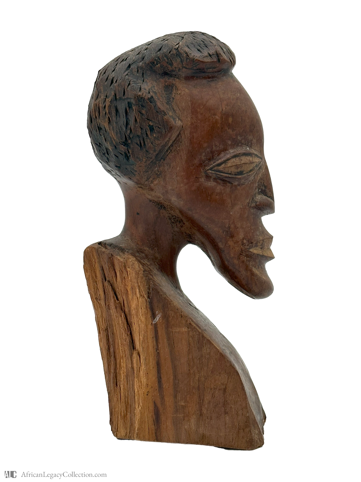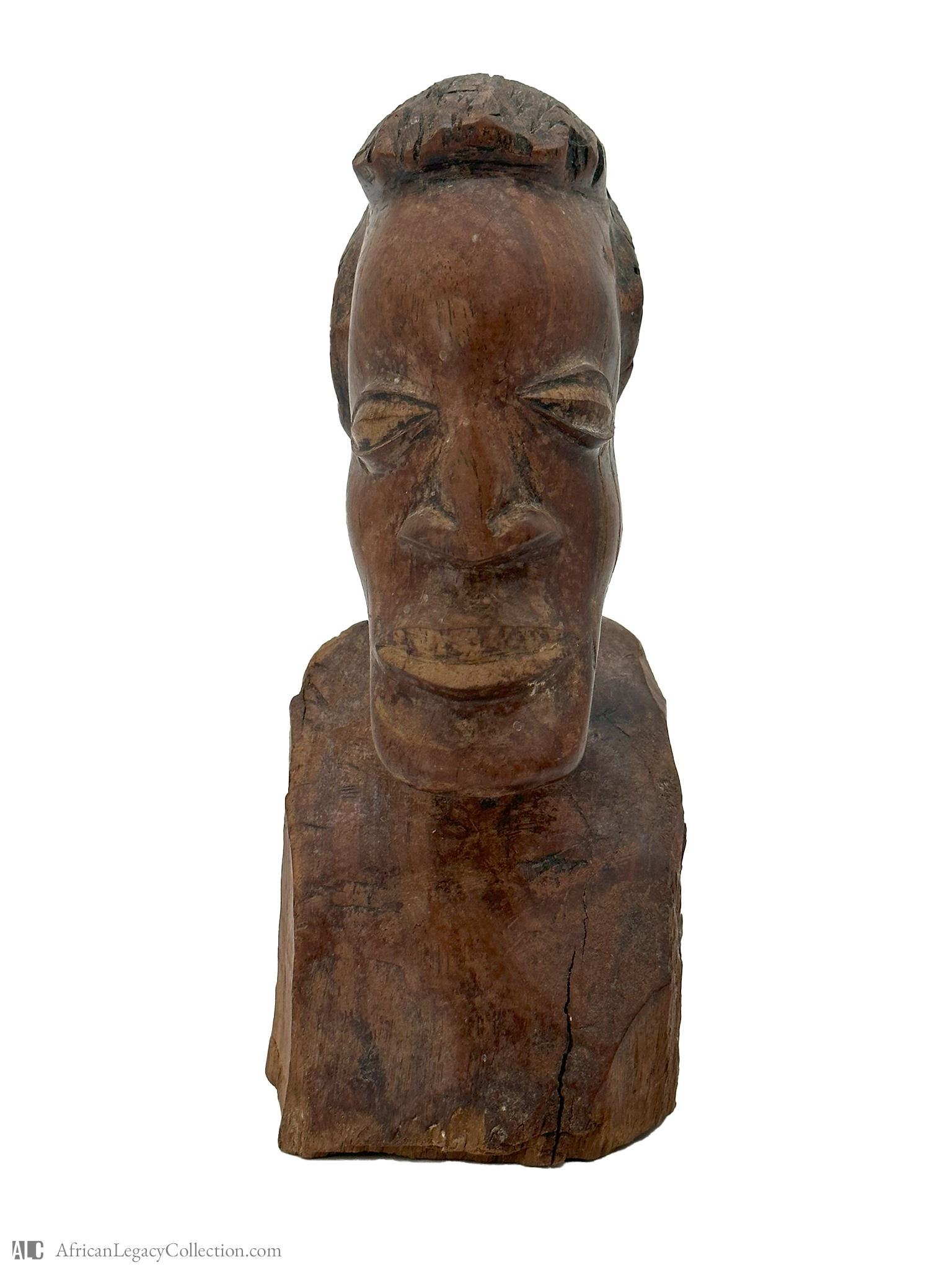 The sculpture is crafted from a single piece of wood, showcasing the characteristic carving techniques of the area. These artifacts often carry cultural significance, embodying ancestral spirits or community values. The use of wood as a material allows for intricate detailing and durability, making it a popular choice for African artisans.