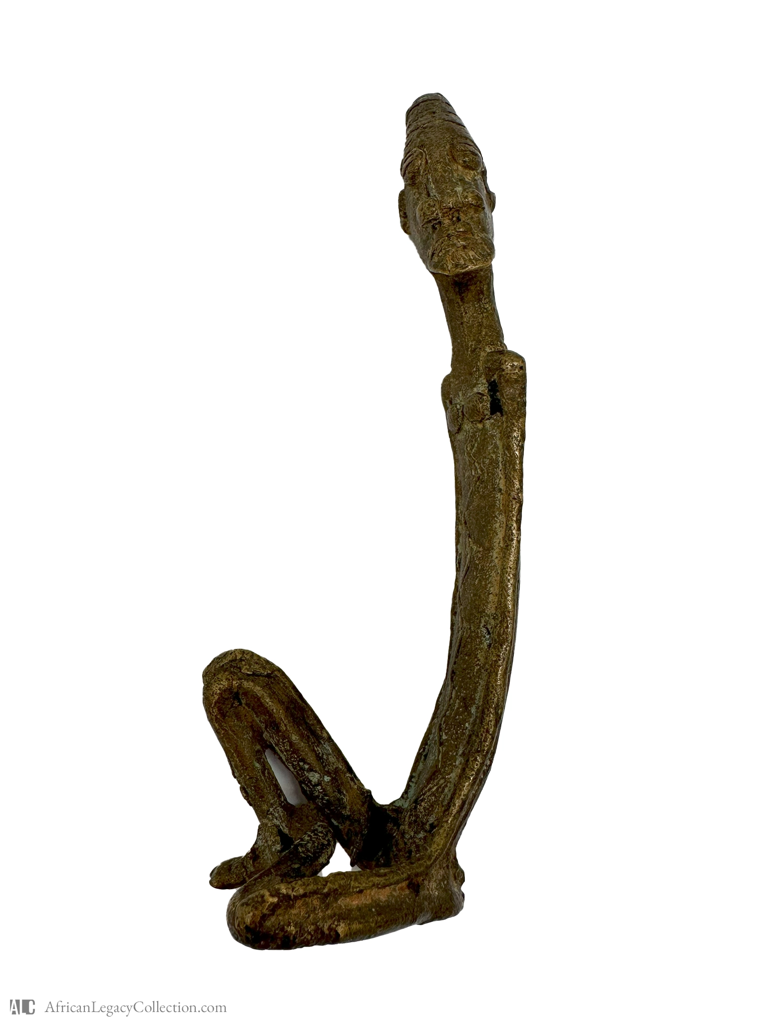 The figure is crafted from bronze using the lost-wax casting technique, a traditional method giving it a smooth finish with intricate details. Its historical context places it within the rich cultural milieu of West African societies, where such objects hold significant cultural and spiritual meaning.