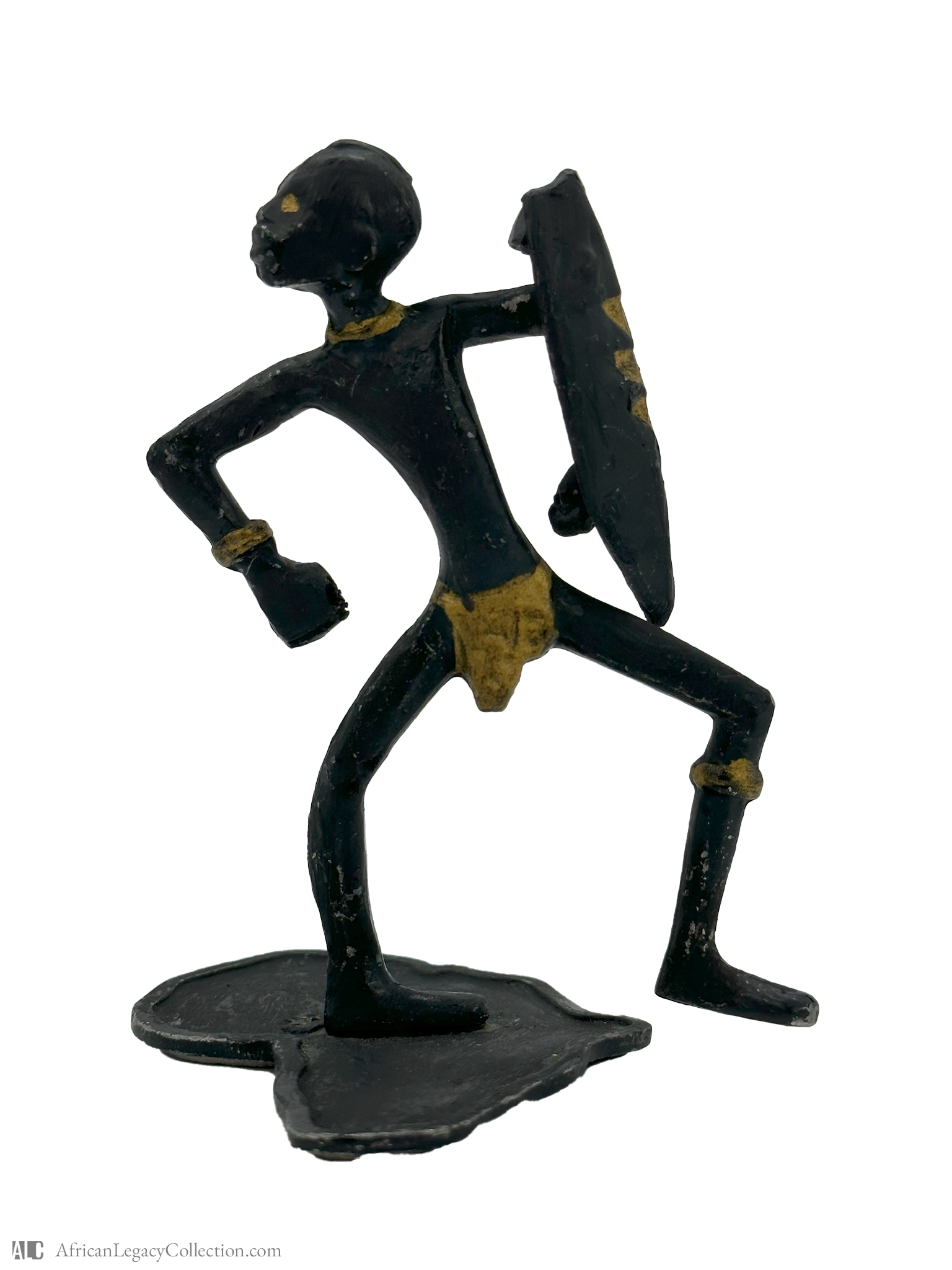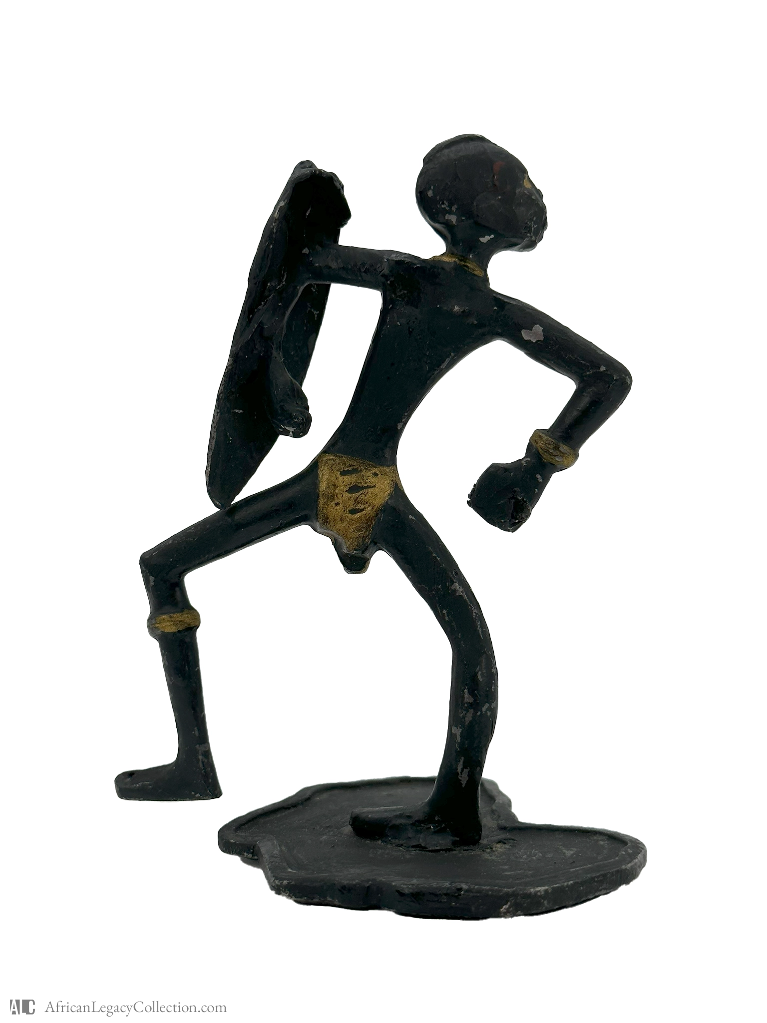 This sculpture is likely a representation of a warrior or guardian figure, crafted primarily for ceremonial or symbolic purposes. Its design suggests origins in West Africa, where such figures often play a role in cultural storytelling and spiritual practices.