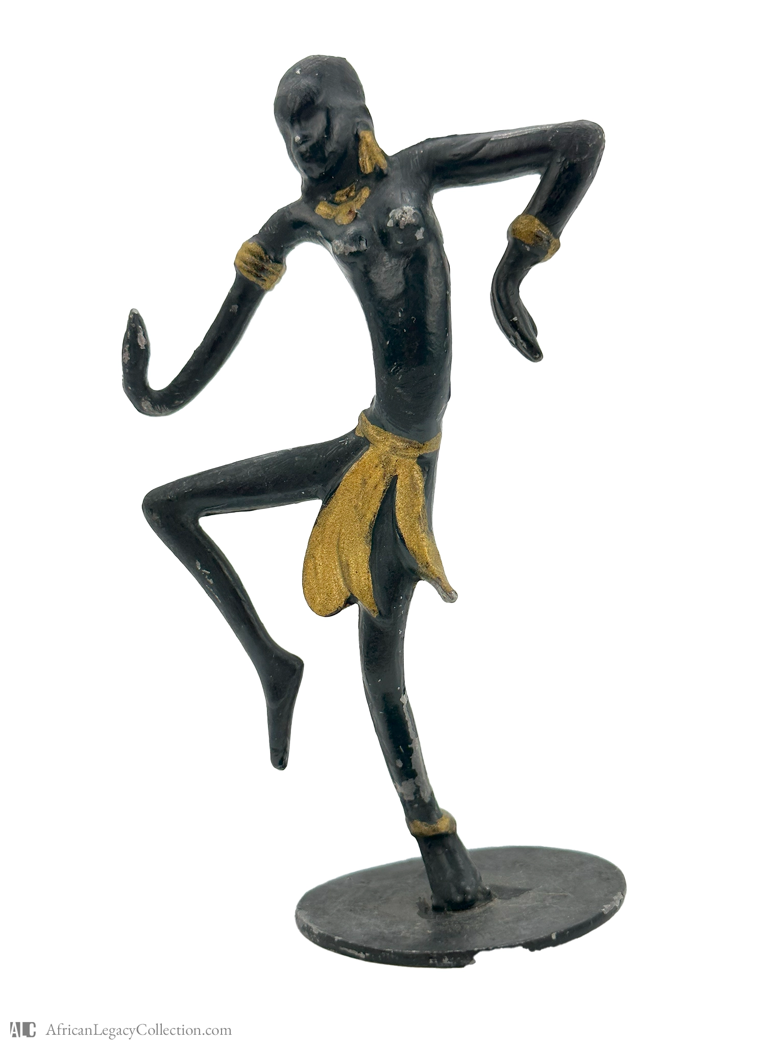 This striking sculpture is an example of African artistry, likely originating from West Africa. It portrays a dancer in dynamic motion, capturing the cultural significance of dance in various African communities. Such figures are often used in ceremonial contexts to symbolize vitality and communal harmony.