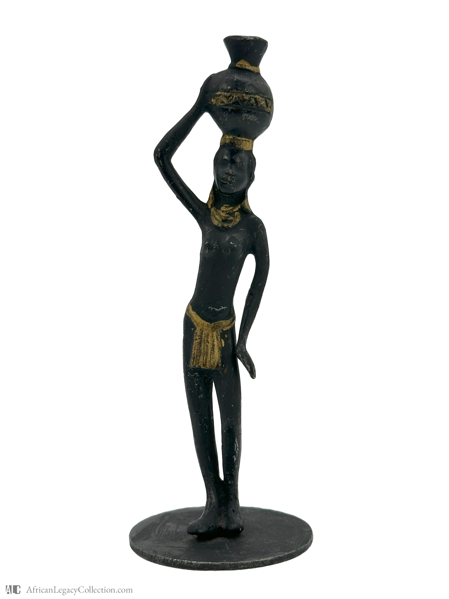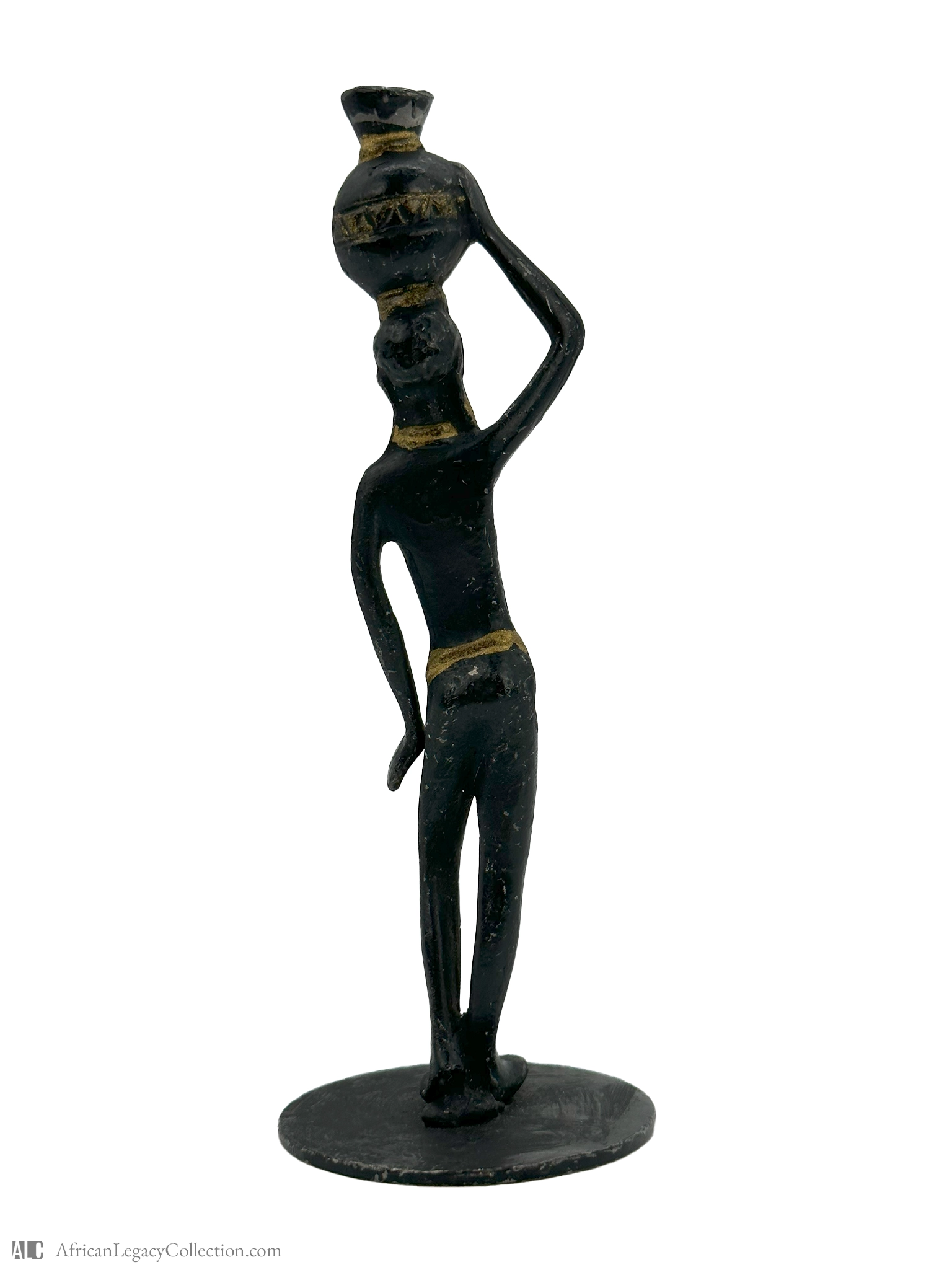 This figurine represents a female carrying a vessel on her head, a common depiction in West African art. The purpose of such figures often centers around themes of daily life and societal roles, reflecting the importance of women in community activities and resource management.