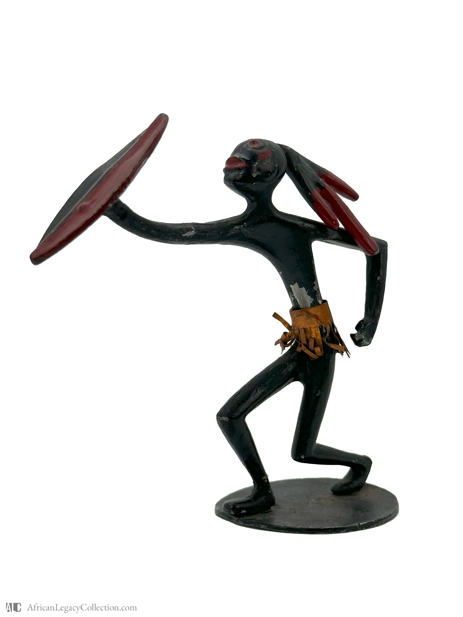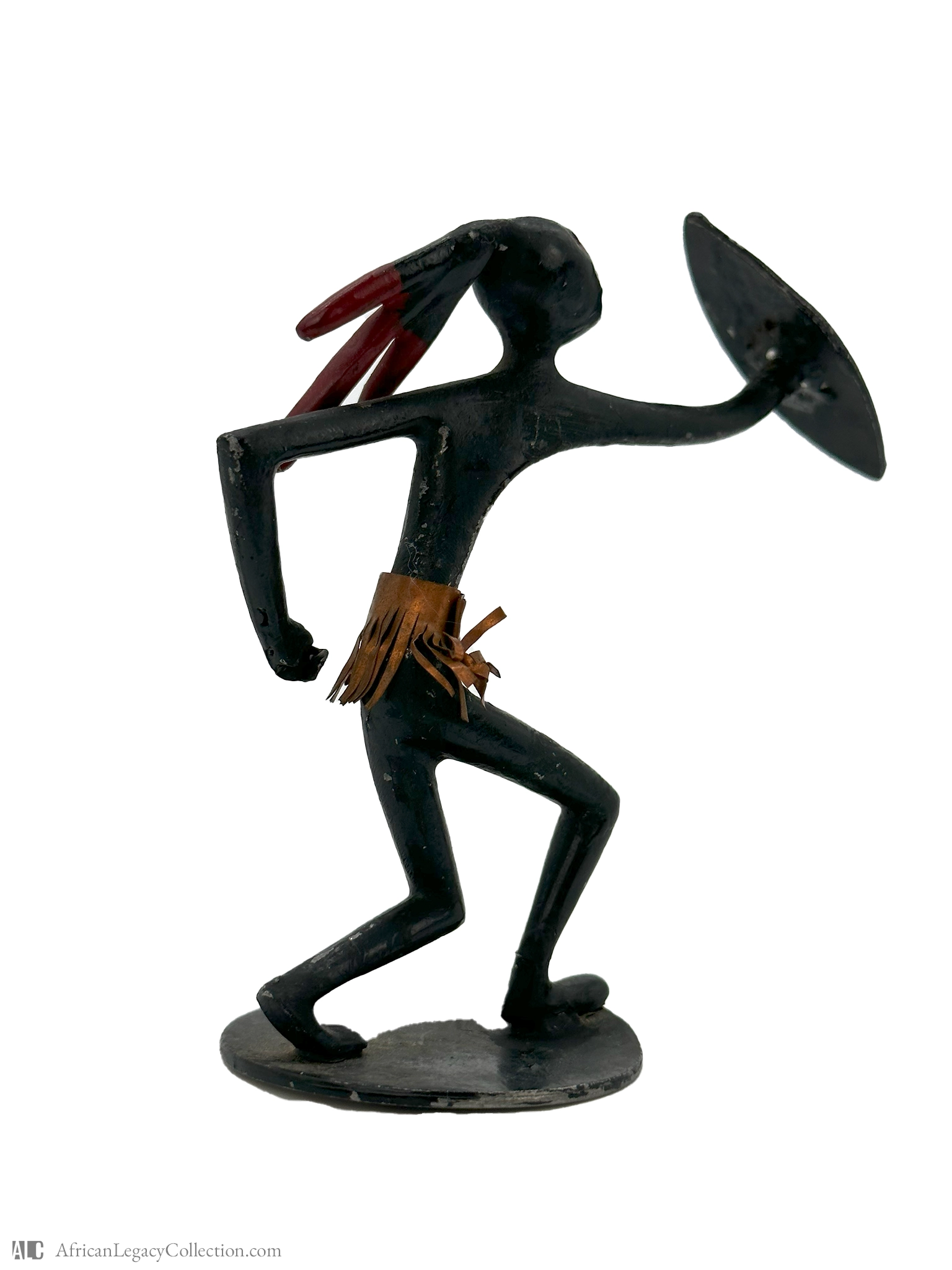 This figure represents an artistic interpretation of a traditional African hunter or warrior, characterized by dynamic movement and wielding a shield. It is likely inspired by cultural practices from West Africa and serves as a symbolic representation of protection or bravery, possibly used in ceremonial or decorative contexts.