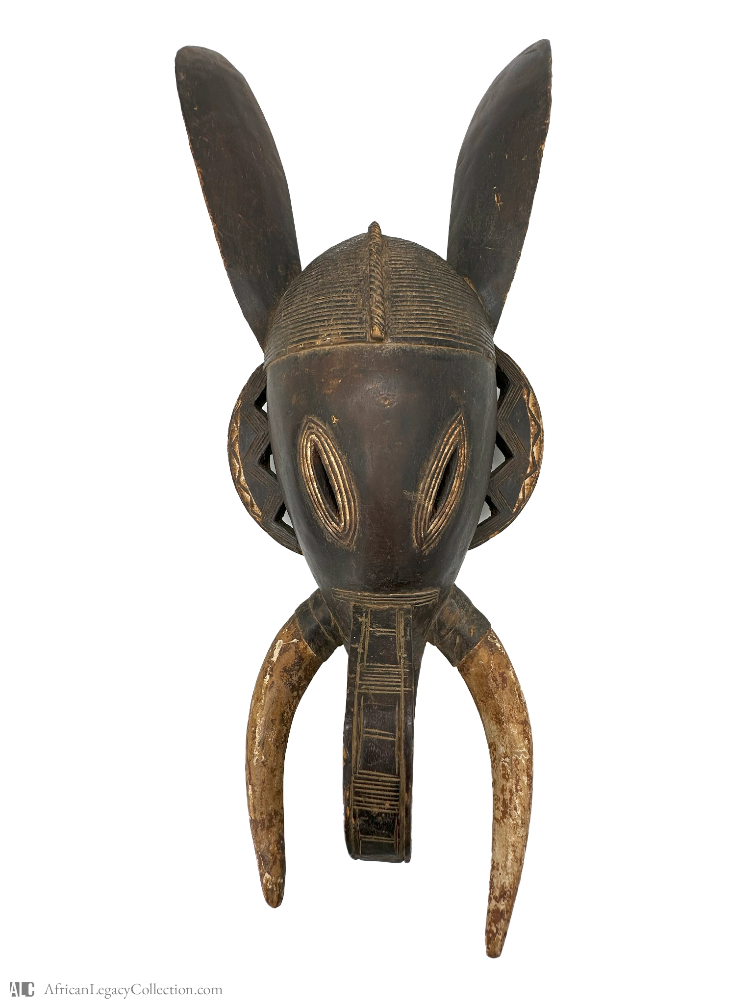 The mask is primarily crafted from wood, accompanied by detailed incised striations that enhance its intricate design. It features a dark patina, indicative of significant age and frequent handling. This style and craftsmanship suggest its creation dates back to a period when these ceremonial uses were prevalent, demonstrating the enduring significance of artistic expression in preserving cultural heritage.