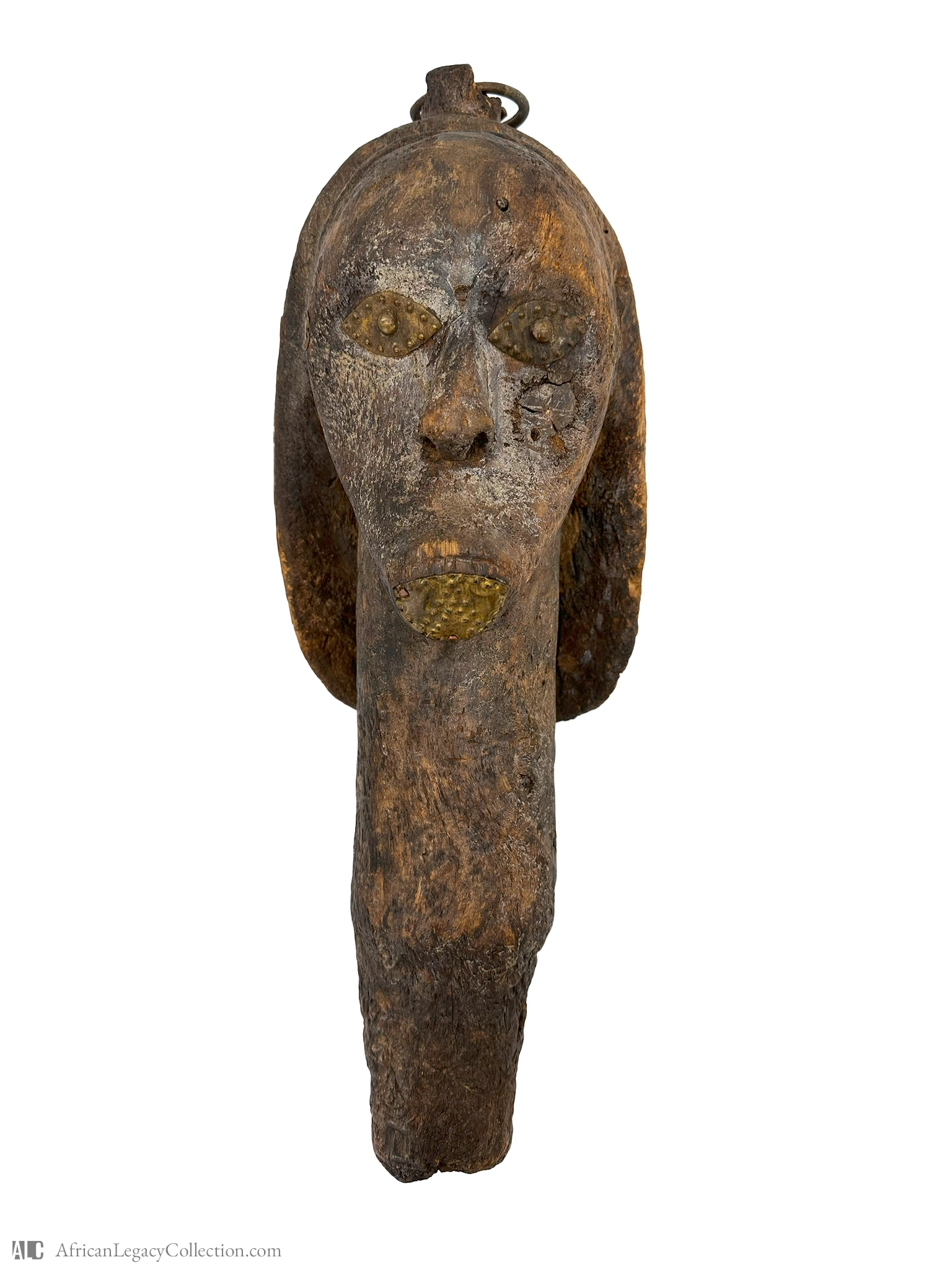 This artifact is likely a ritualistic mask, possibly originating from West Africa. Its anthropomorphic stylization suggests it was used in ceremonies to invoke or represent spiritual entities, playing a significant role in cultural traditions.