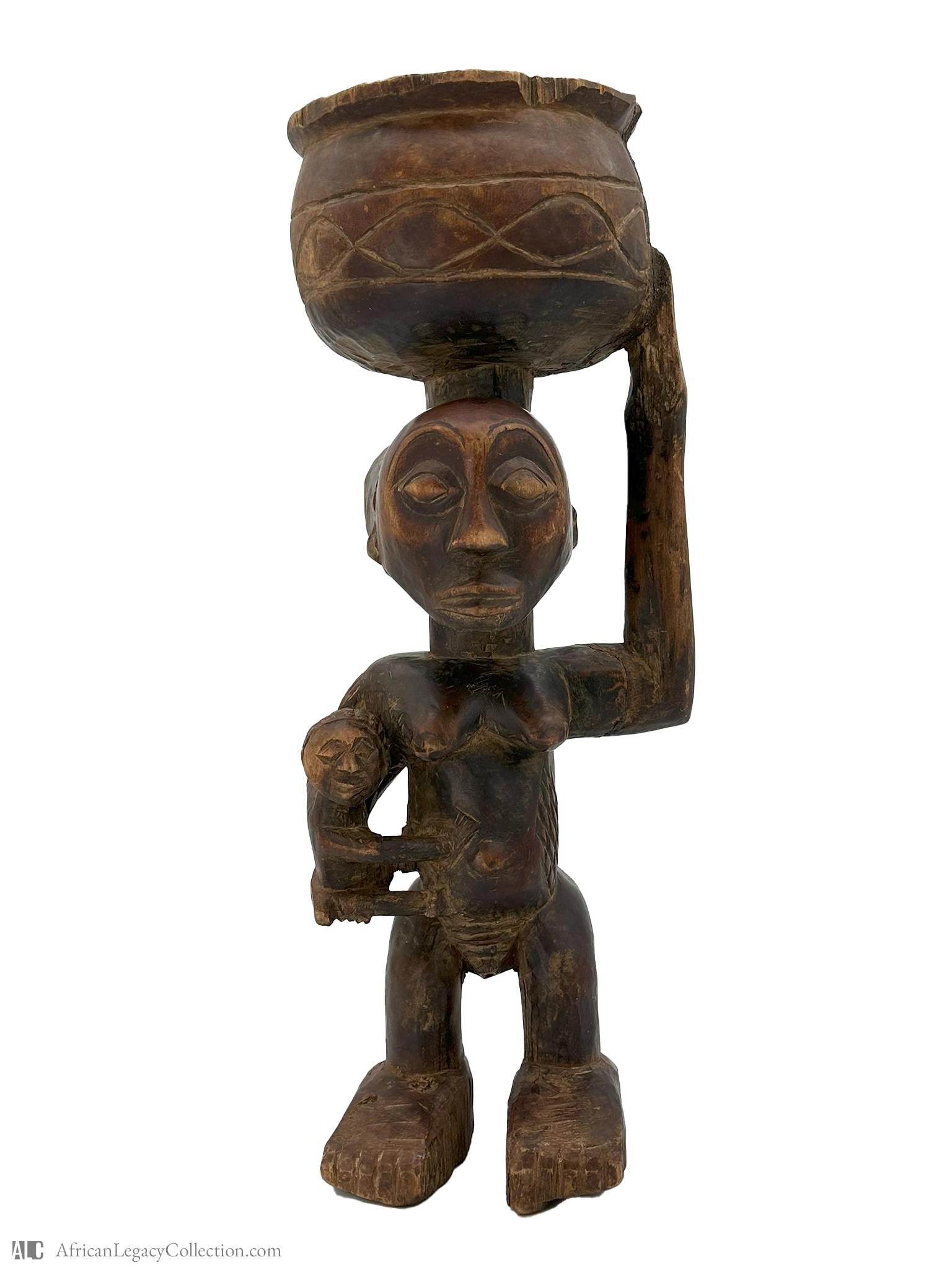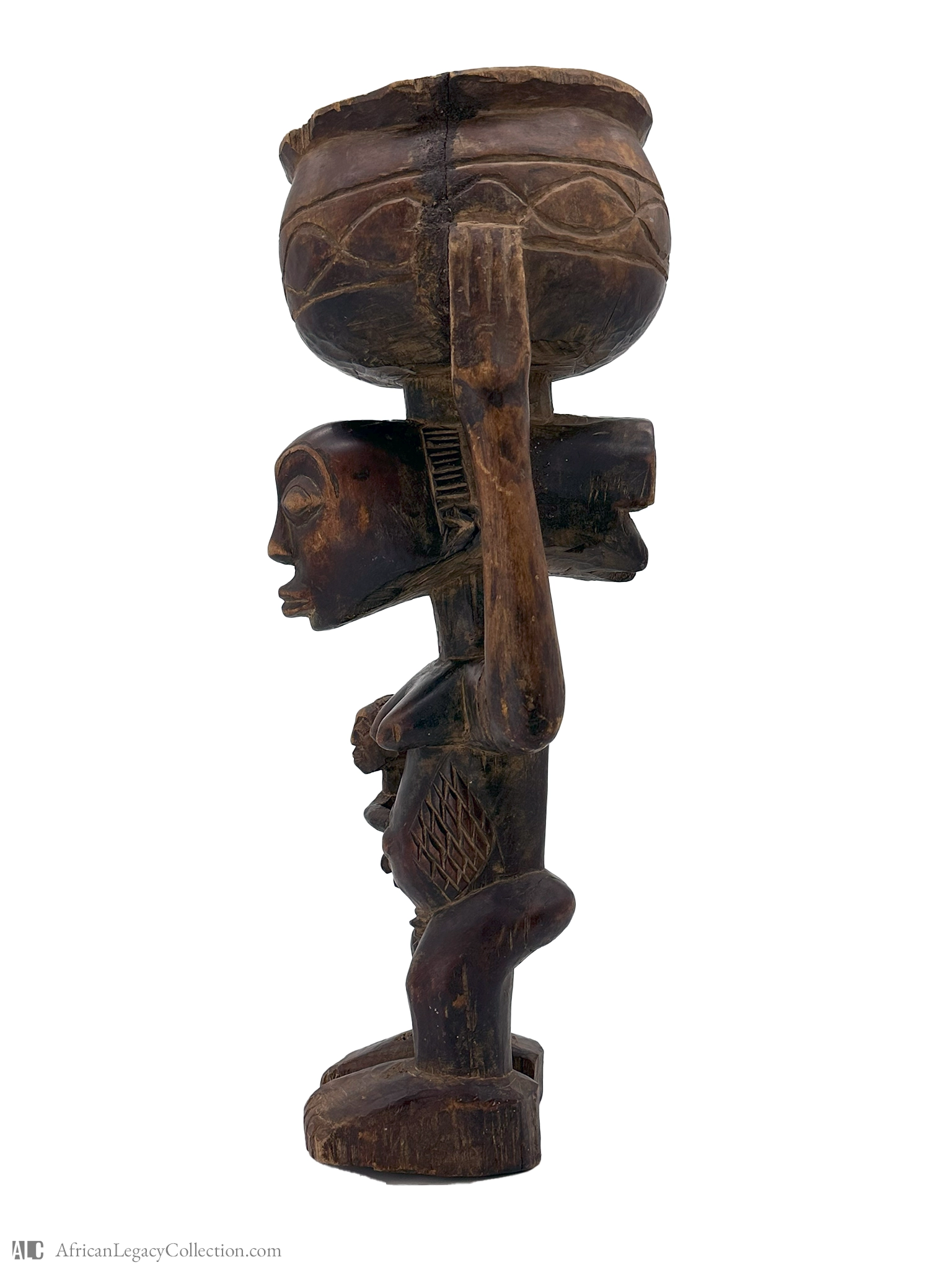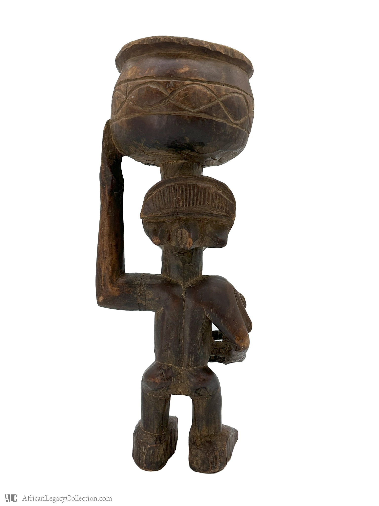 This carved wooden artifact is a figurative sculpture likely originating from Central Africa, possibly used as a ceremonial or ritual vessel. The vessel, held atop the figure’s head, suggests its role in traditional ceremonies, potentially for offering or libation purposes. The anthropomorphic design emphasizes its cultural significance, indicating its use in important community events.