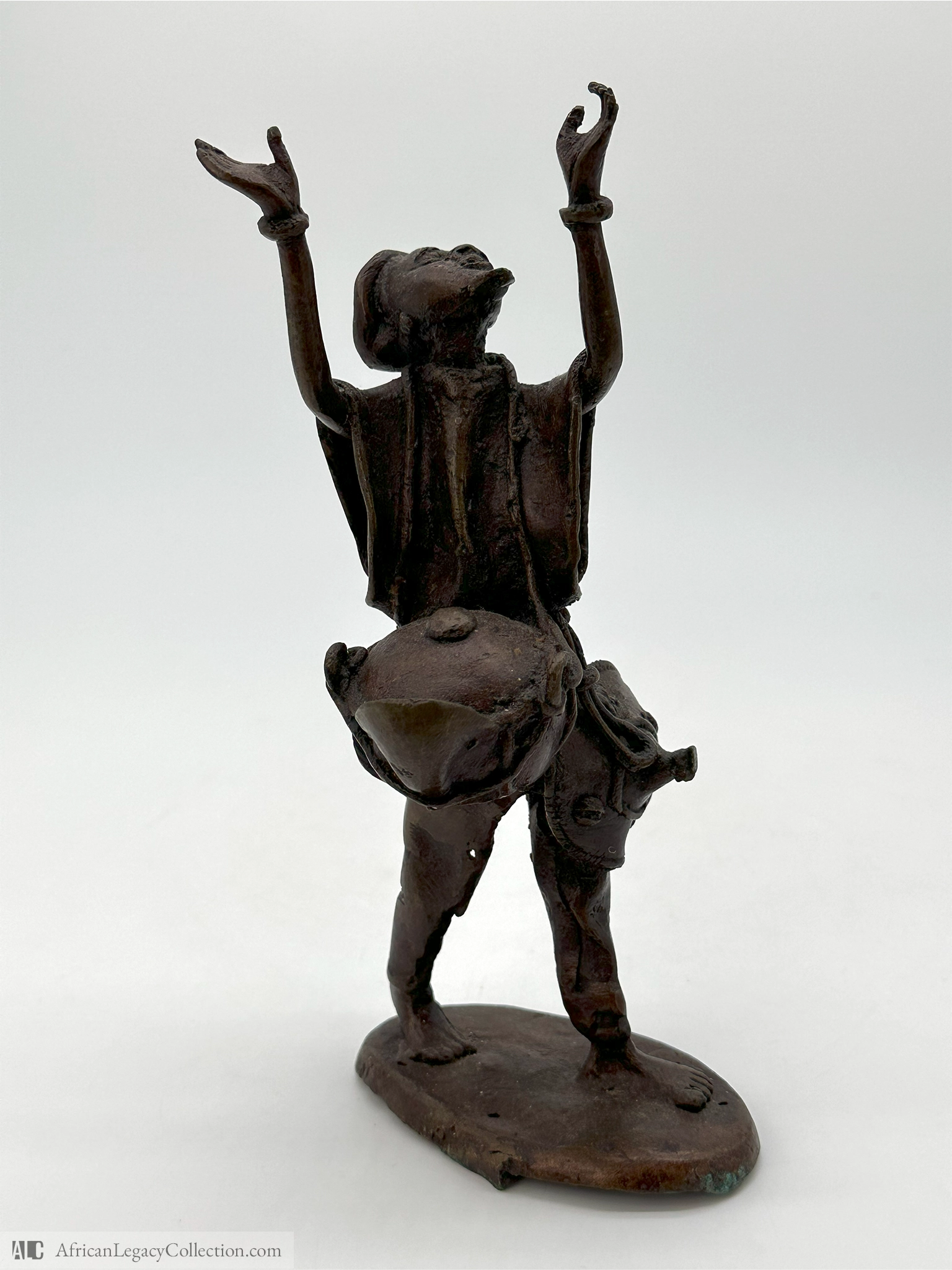This African artifact is a bronze sculpture representing a musician in a dynamic pose, likely originating from the West African region. It serves as a cultural representation, possibly used in rituals or as a decorative piece that honors musical traditions. The figure’s posture and attire suggest a narrative related to celebration or communication with ancestral spirits.