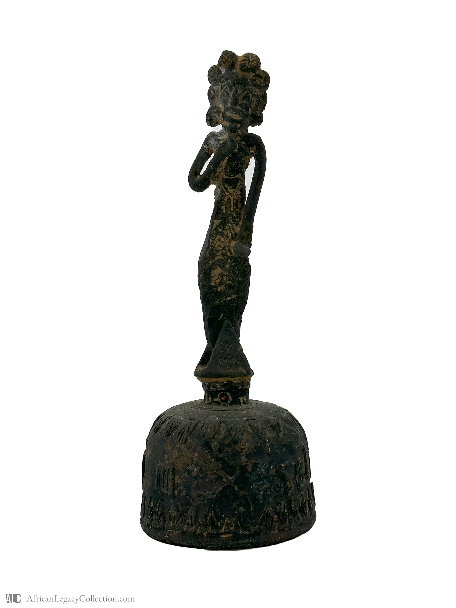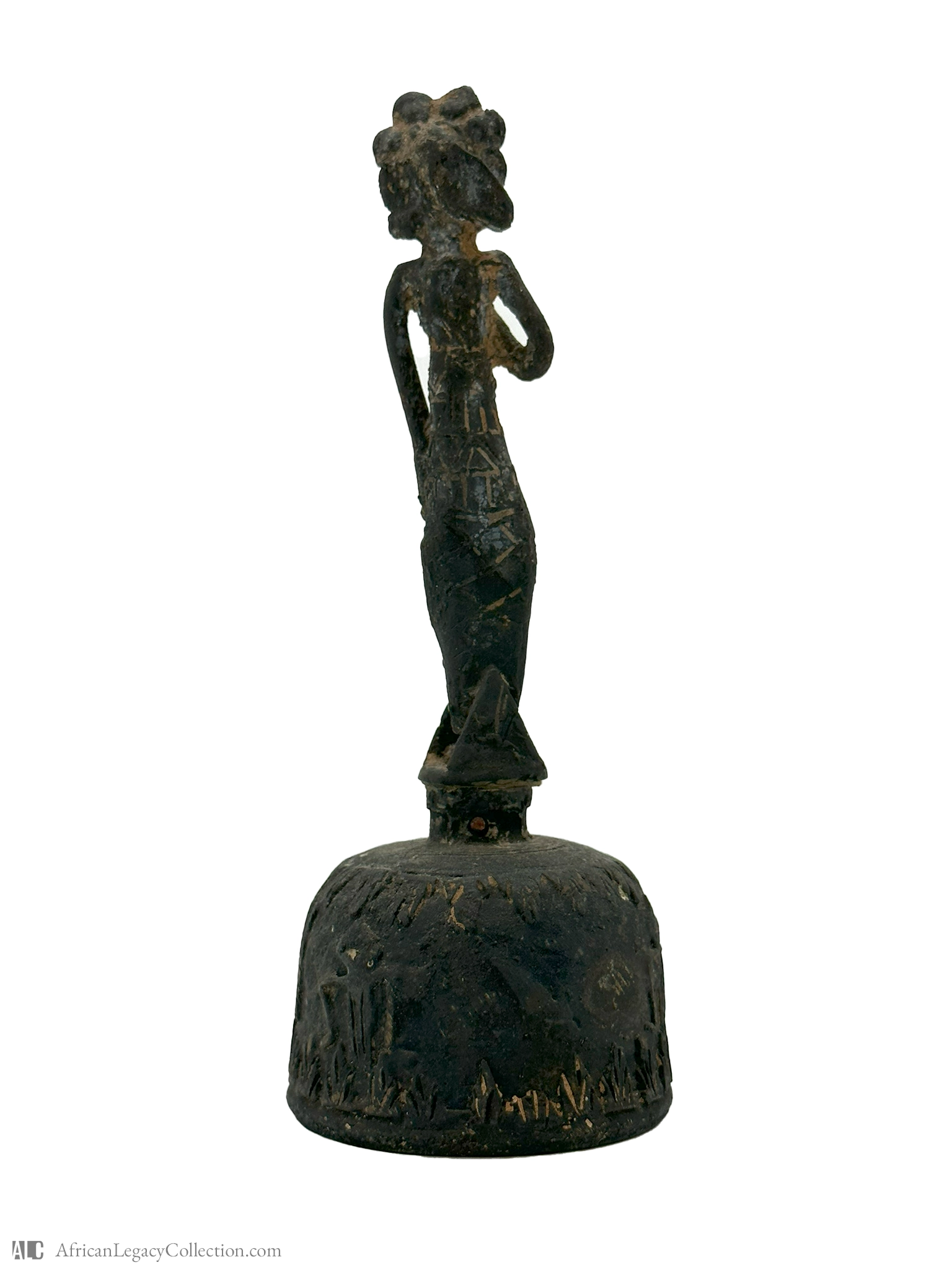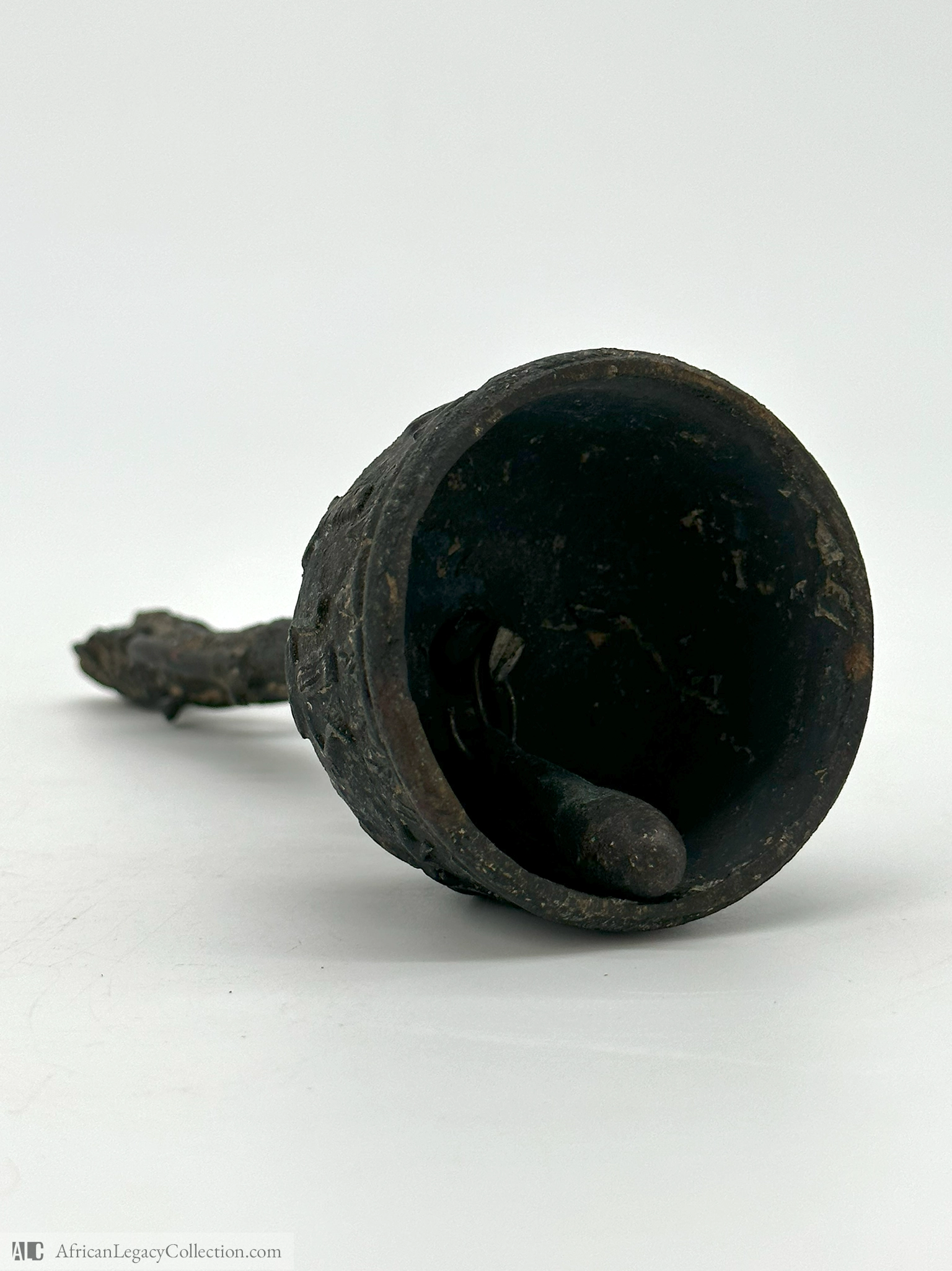 This intricately crafted artifact is an African bronze bell, likely originating from West Africa. It features an anthropomorphic figure, suggesting cultural significance beyond its utilitarian purpose. Such bells were traditionally used in rituals and ceremonies, serving both musical and symbolic roles in community gatherings.