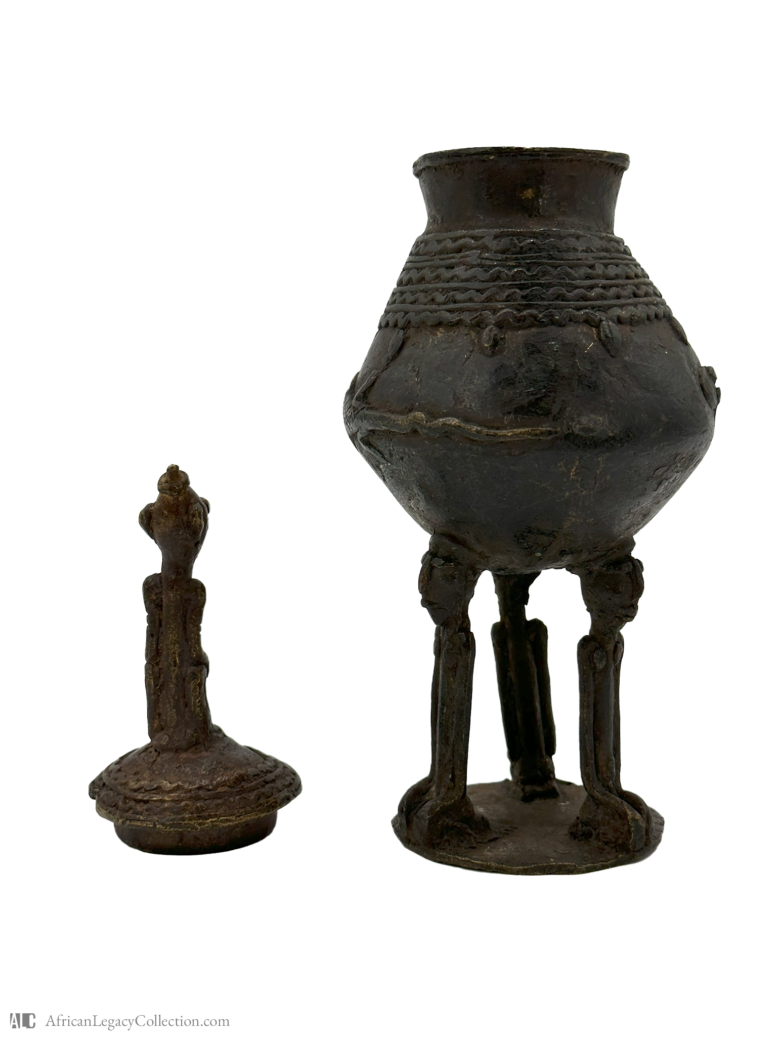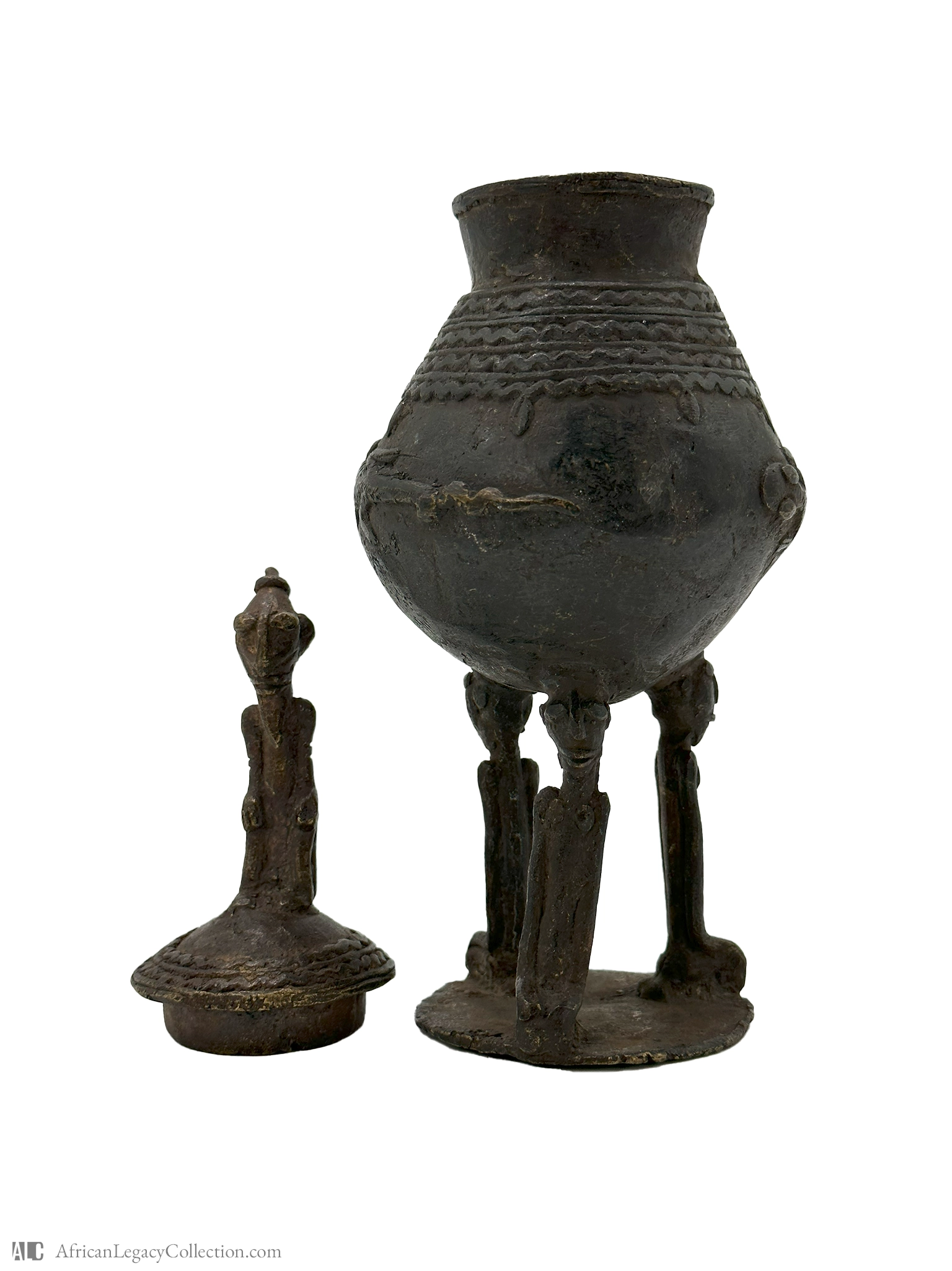 Crafted using the lost-wax casting technique, the vessel features intricate anthropomorphic motifs, indicative of its cultural significance. The historical context of such artifacts places it within societies where metalwork played a vital role in cultural expression and spiritual practices. This vessel, with its detailed craftsmanship, underscores the artisan’s skill and the item’s importance in ritualistic traditions.
