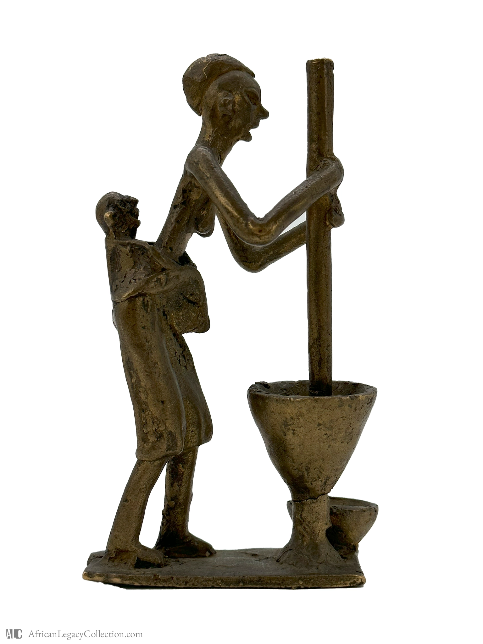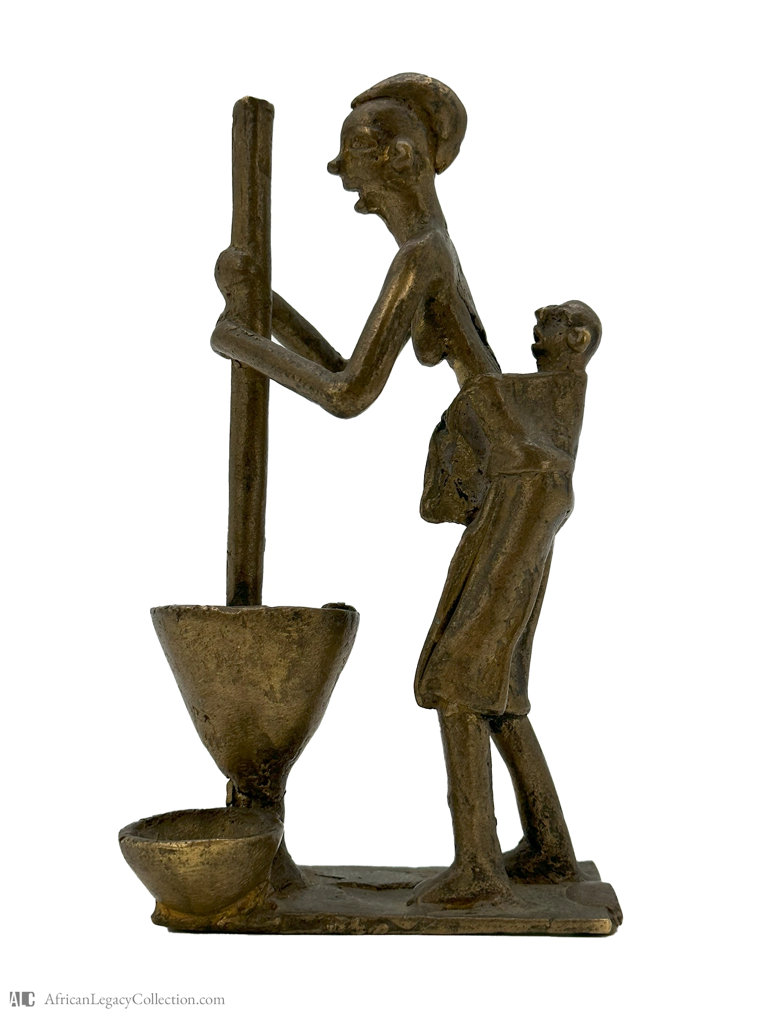 This bronze sculpture represents a woman engaged in a domestic activity, likely originating from West Africa, capturing everyday life within the community. The inclusion of a child carried on her back highlights themes of motherhood and family within cultural contexts.