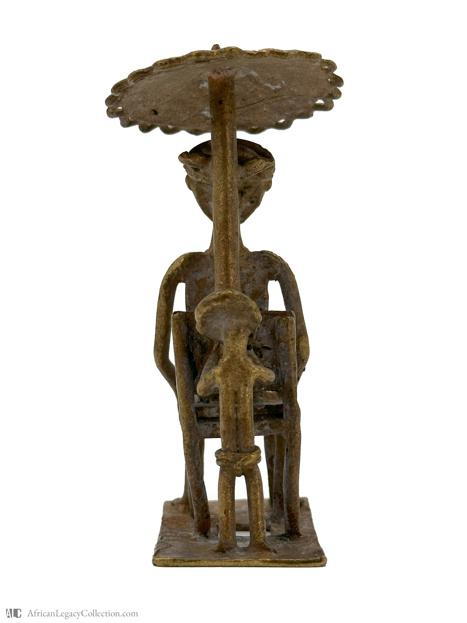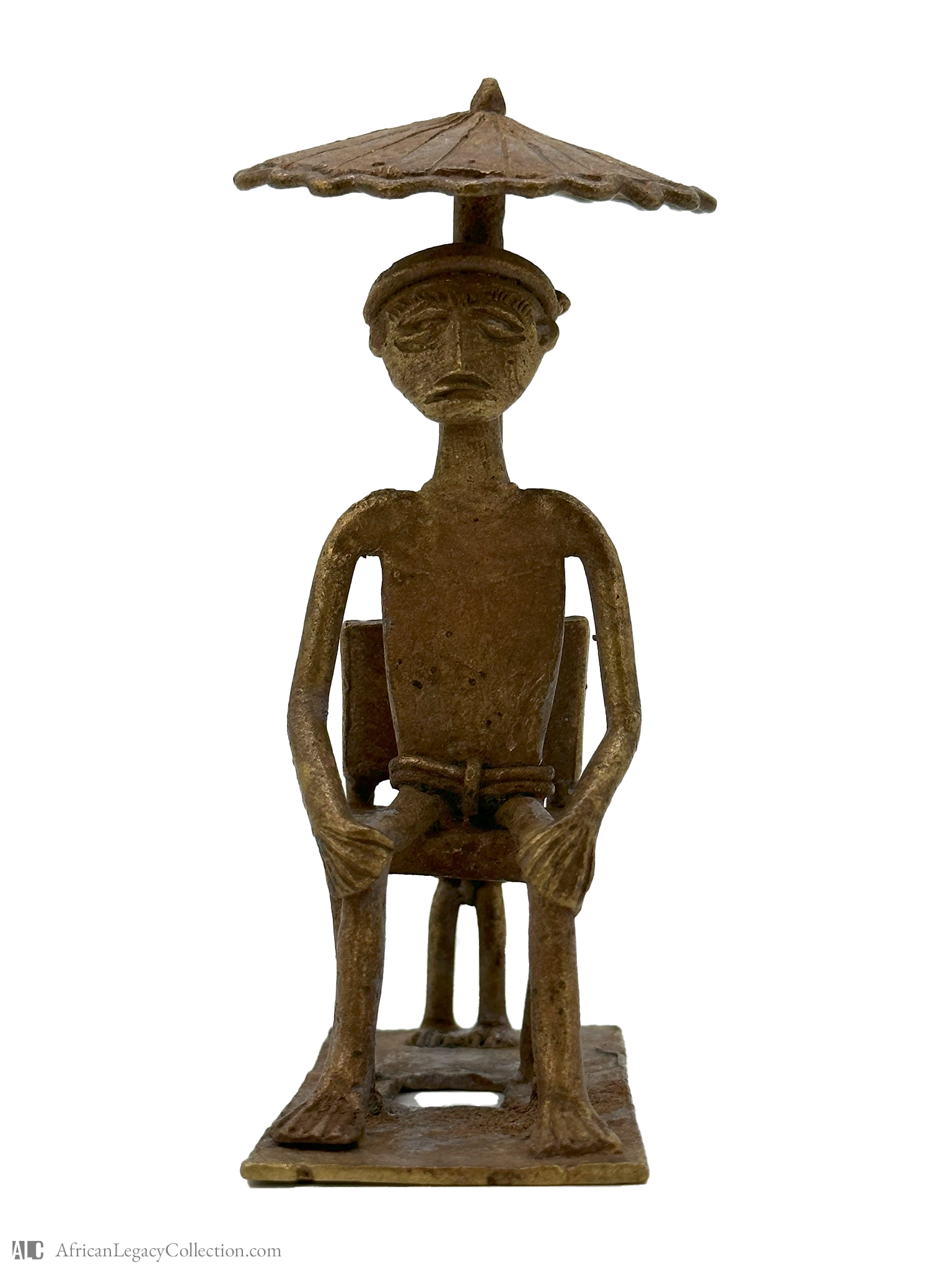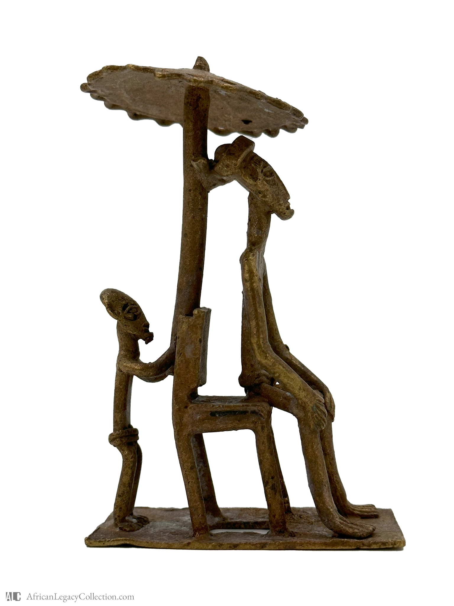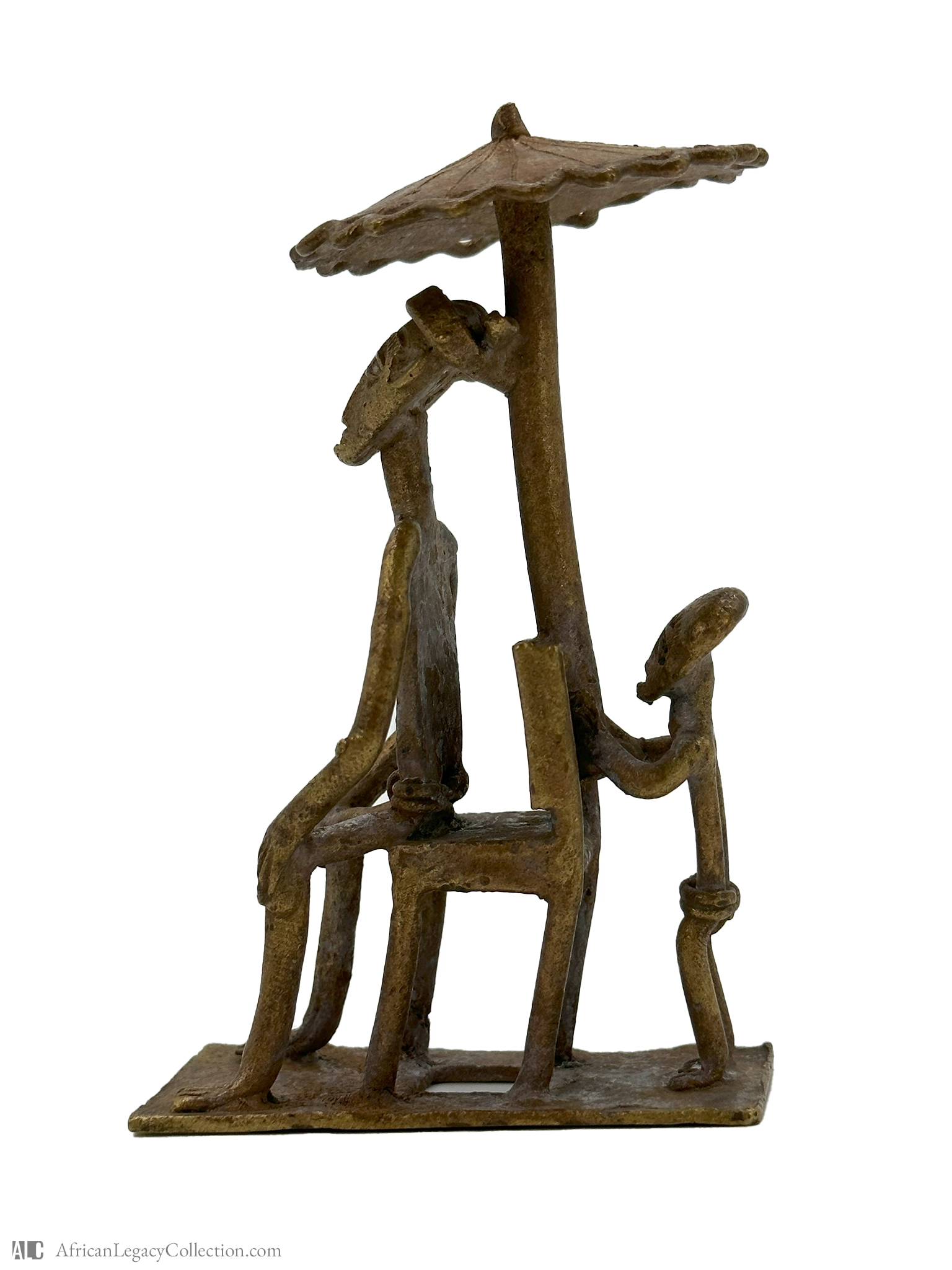This bronze sculpture likely originates from West Africa and depicts a seated figure under an umbrella, attended by a smaller figure. It likely serves a symbolic or ritualistic purpose, reflecting hierarchical social relations within a community.