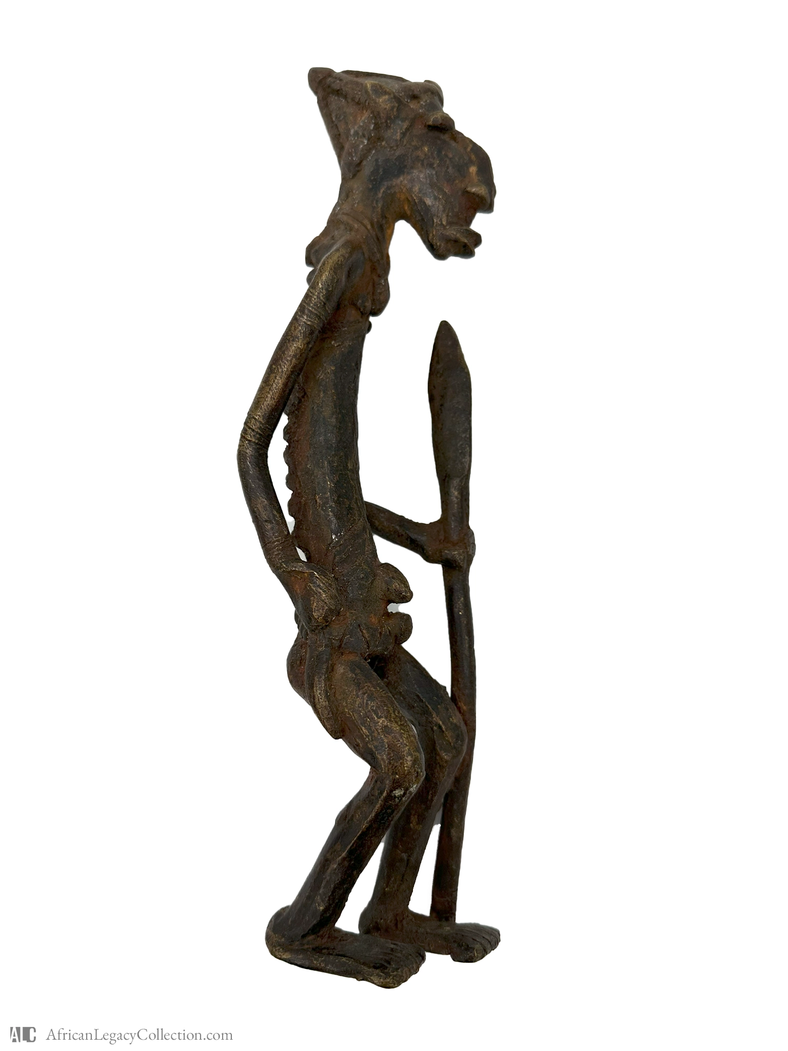 This bronze figure likely originates from West Africa and appears to represent a warrior or hunter, indicated by its stance and the evident spear. Such figures are often used in ceremonial contexts or as representations of ancestral spirits, playing a role in cultural storytelling and traditions.