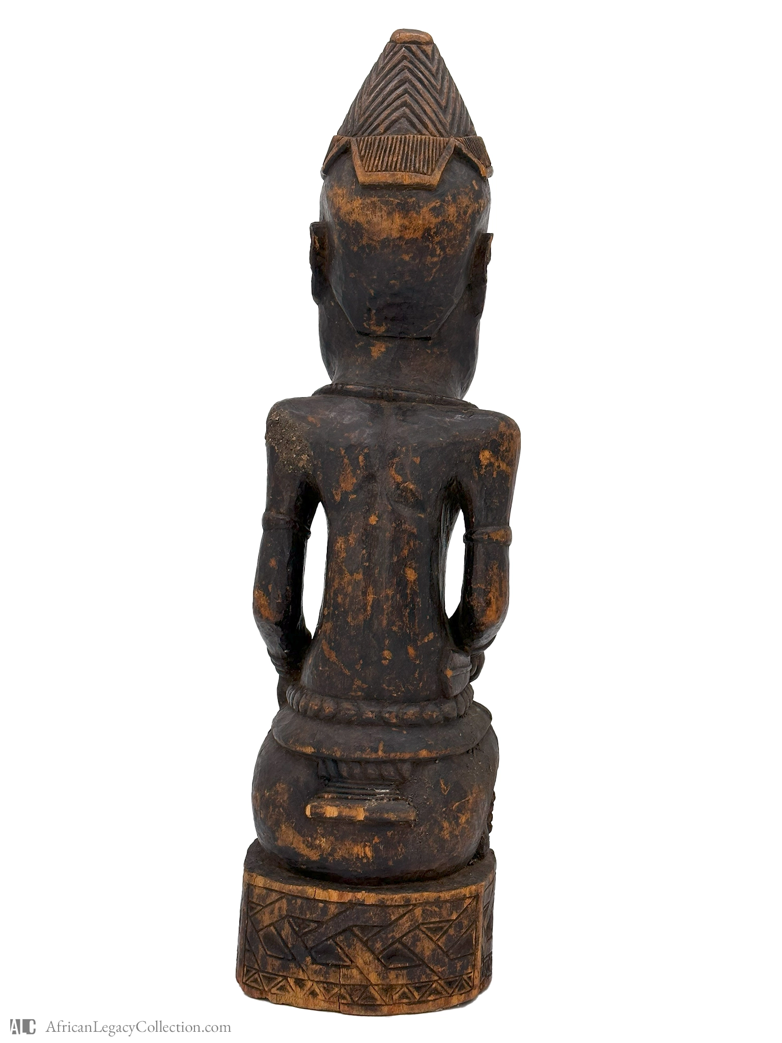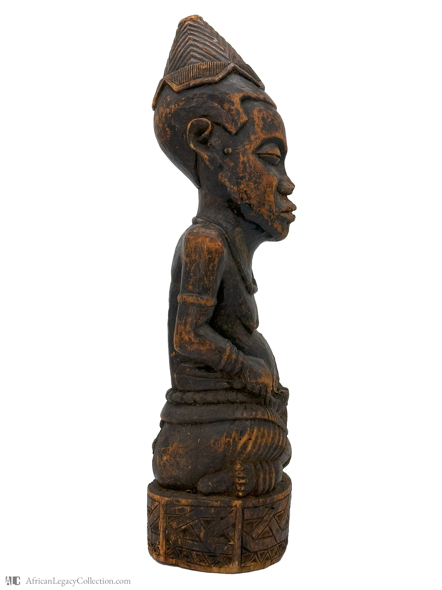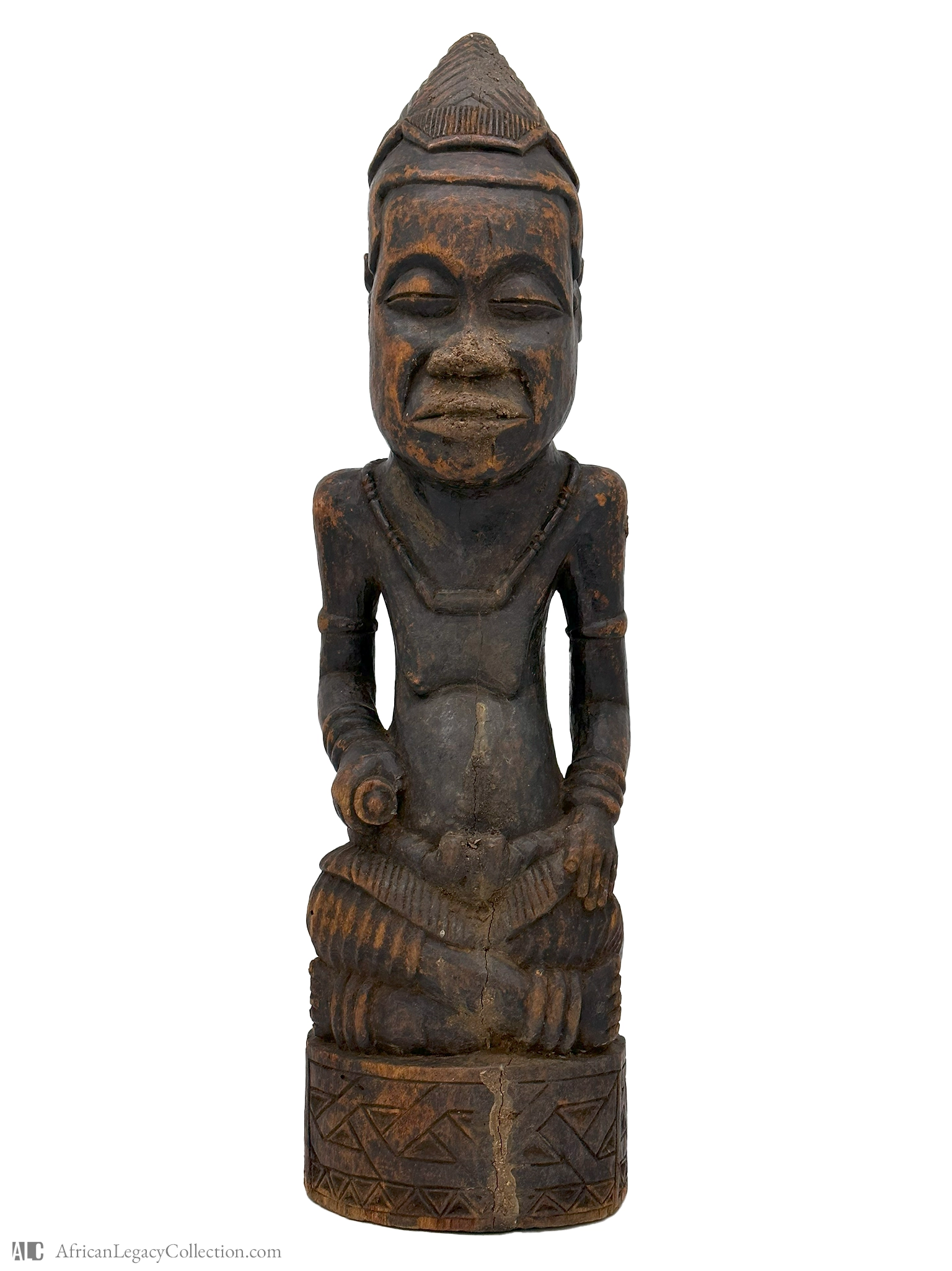 This figure is a representation of an ancestor or spiritual entity originating from Central Africa, likely created by the Yoruba people. It was primarily used in ceremonial practices or as a focal point in a shrine, linking the community to ancestral spirits or deities.