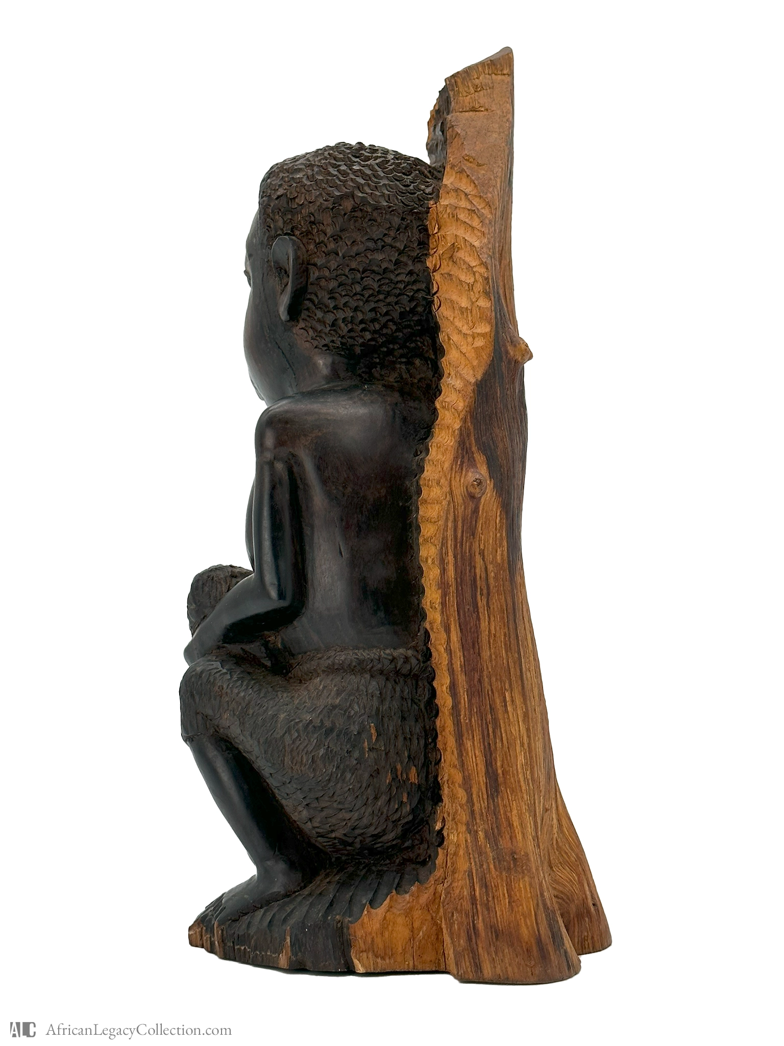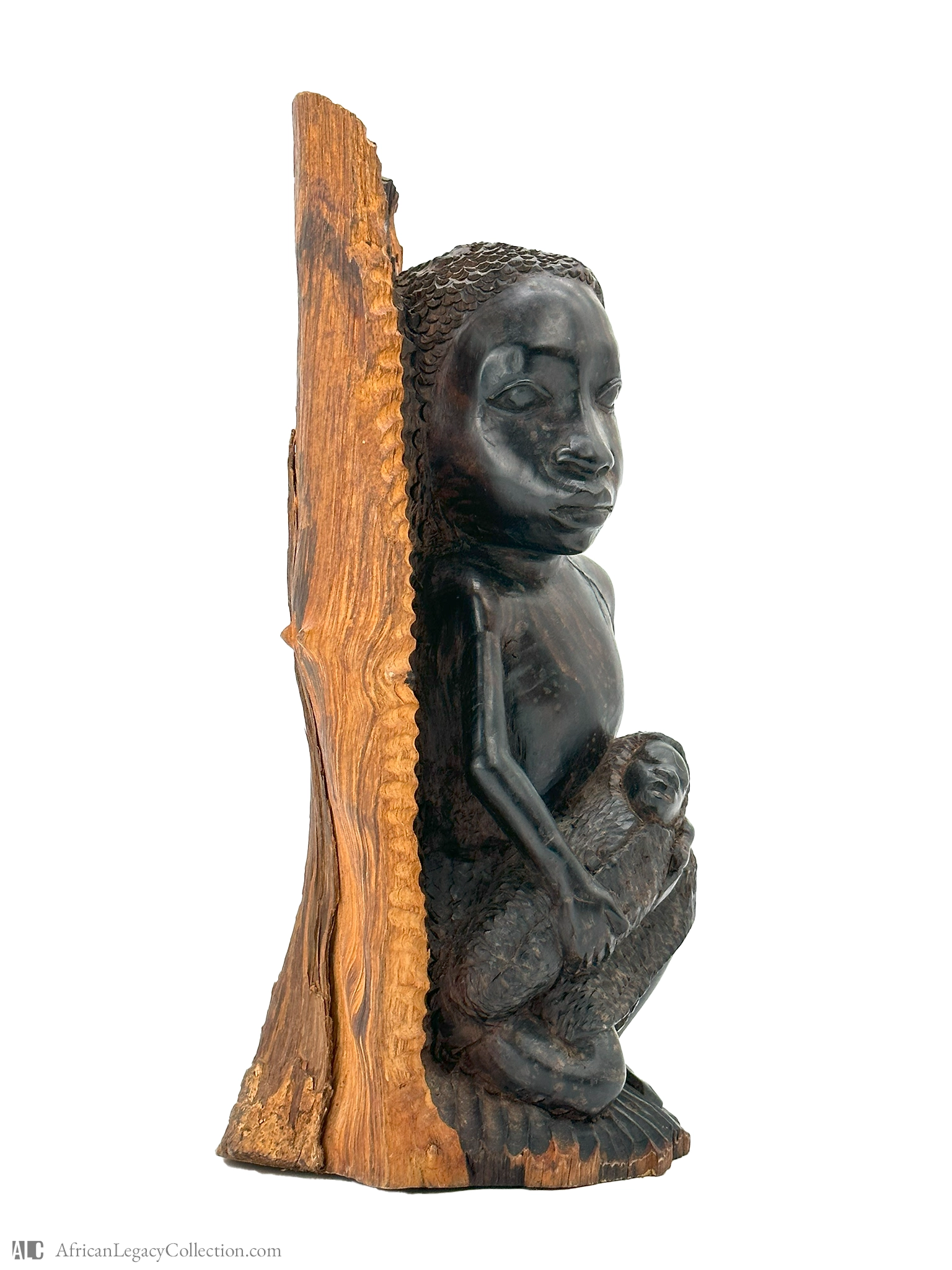 This African sculpture features an anthropomorphic figure cradling an animal, likely symbolizing protection or kinship, common in traditional art from Central Africa. These artifacts often serve as cultural representations or spiritual guardians.