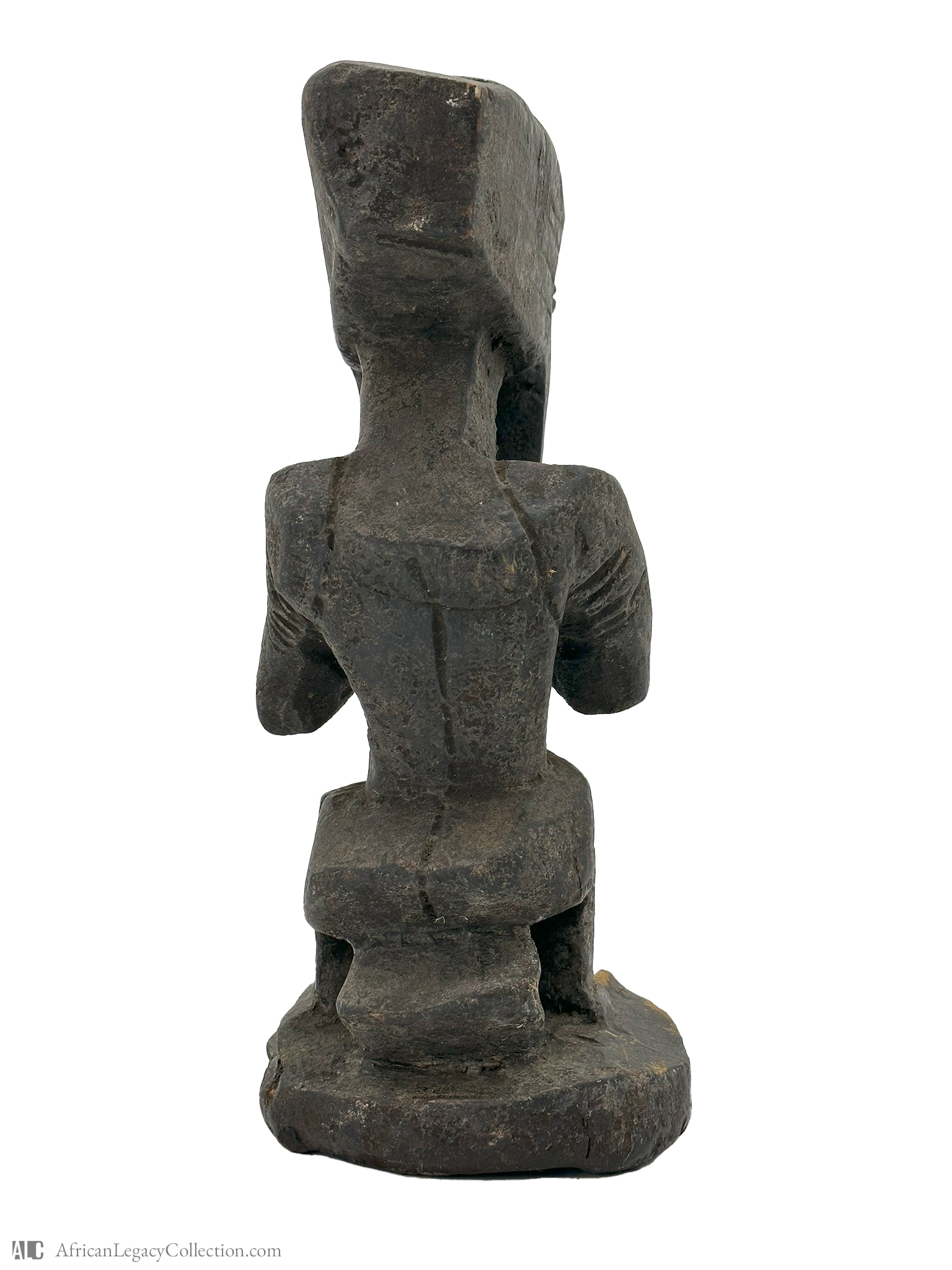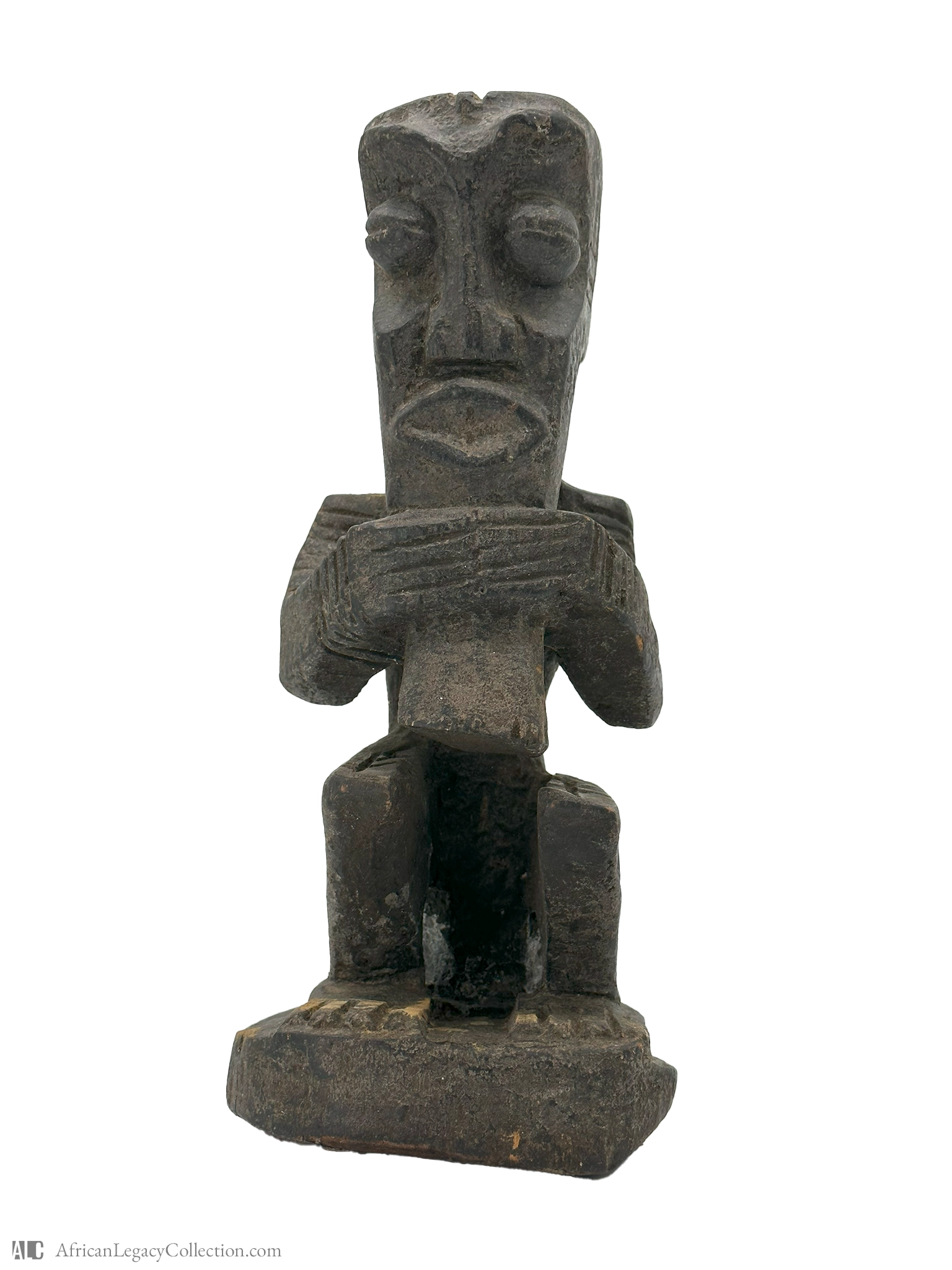 This wooden sculpture likely originates from West Africa, representing a seated human figure. Its posture and form suggest it may have had a ritualistic or symbolic purpose, potentially relating to ancestor veneration or other ceremonial roles within the community.