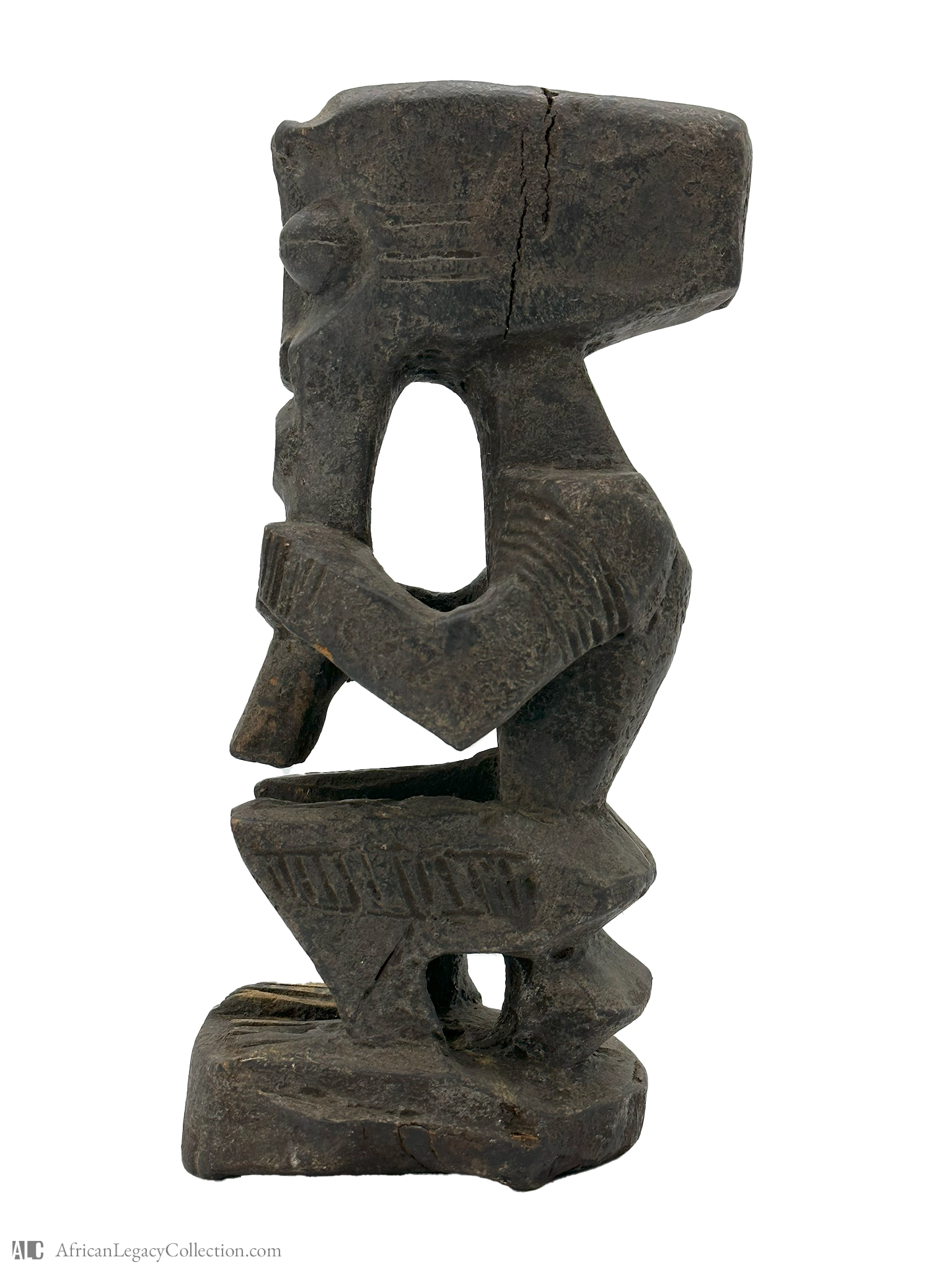 The sculpture is crafted from wood, showcasing artisanal techniques with prominent incised striations. These markings, along with its overall form, indicate a historical context possibly dating back to traditional African societies where such artifacts played roles in cultural or religious practices. The piece exemplifies the skillful craftsmanship and deep cultural significance attributed to African art.