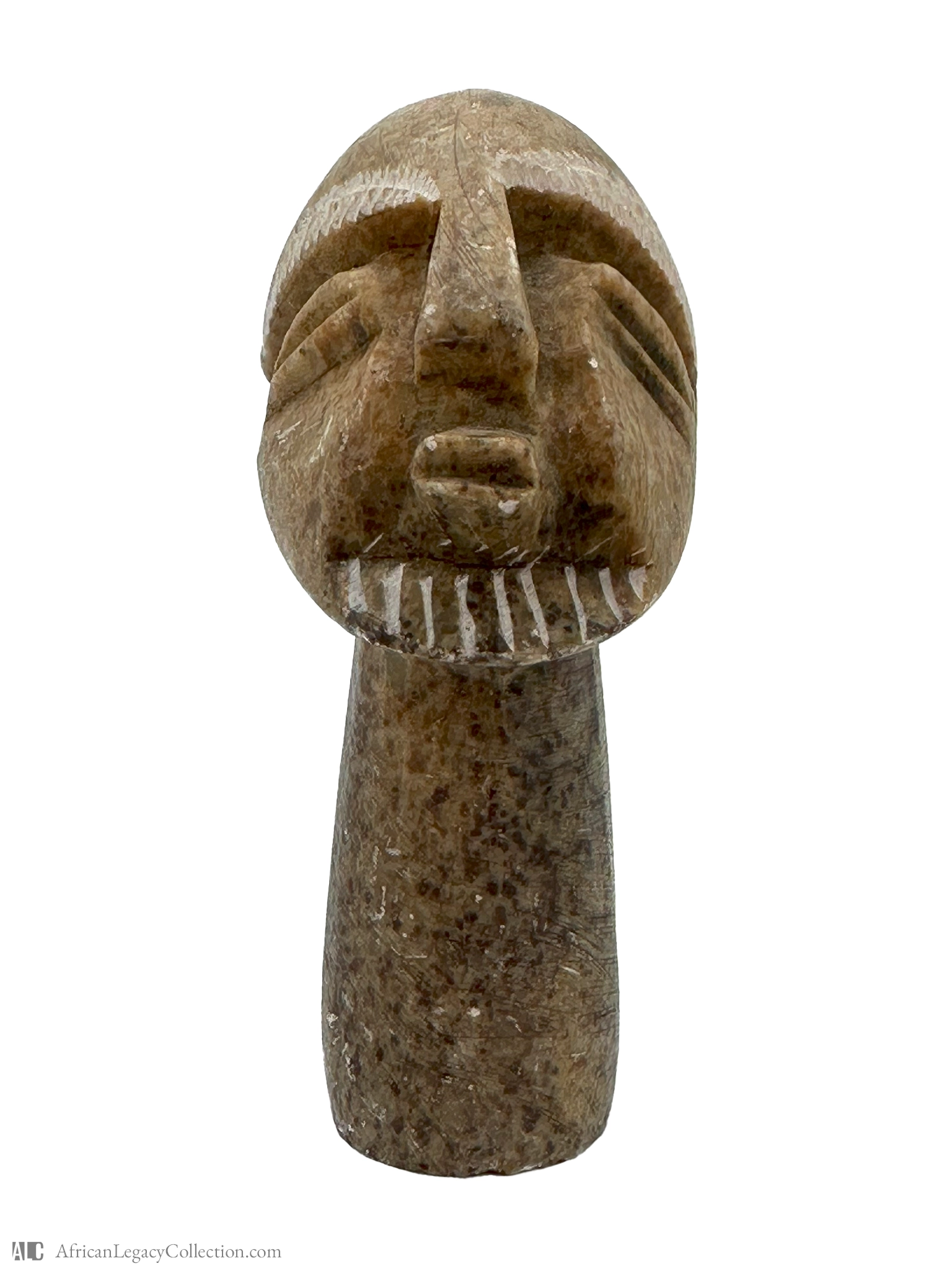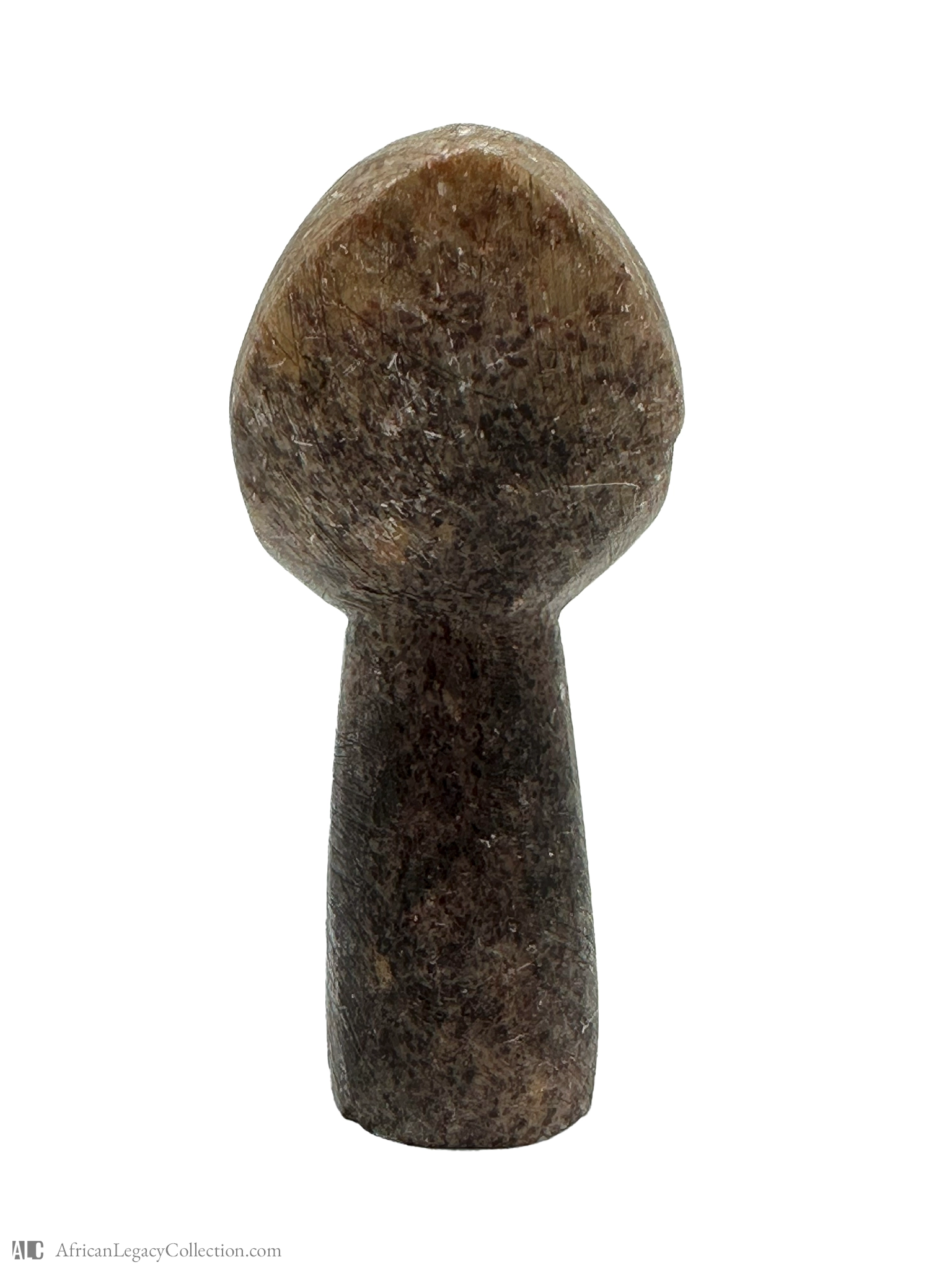 This stone sculpture represents an ancestor figure, often utilized in spiritual rituals or as a symbol of reverence. Originating from the West African region, such pieces are integral in connecting the physical to the spiritual, serving as conduits during religious ceremonies or community events.