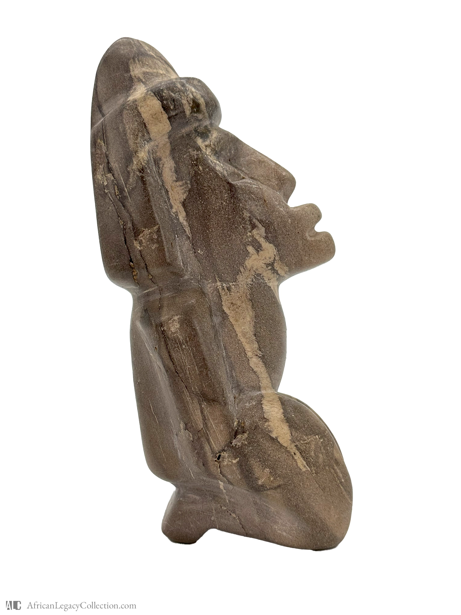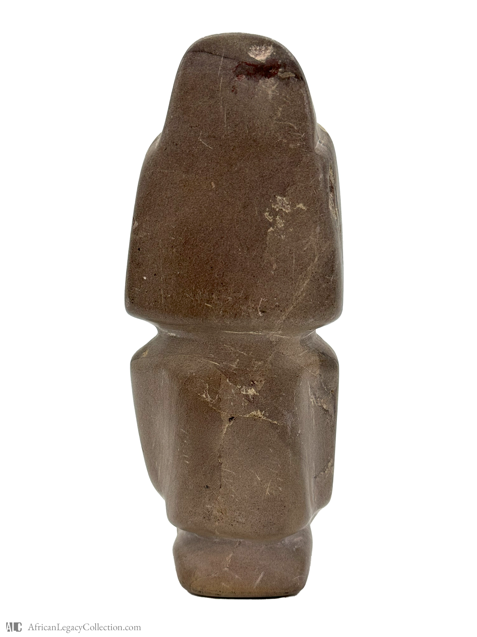 This artifact is a figurative sculpture, likely originating from West Africa. It represents an anthropomorphic figure, suggesting its use in ritual or ceremonial contexts. The stylized features and pose imply cultural significance, possibly serving as a devotional object or symbol within a community.
