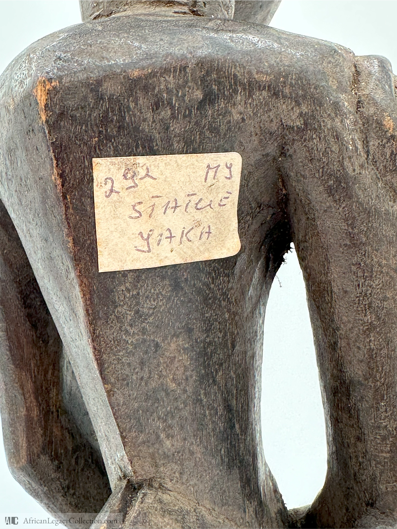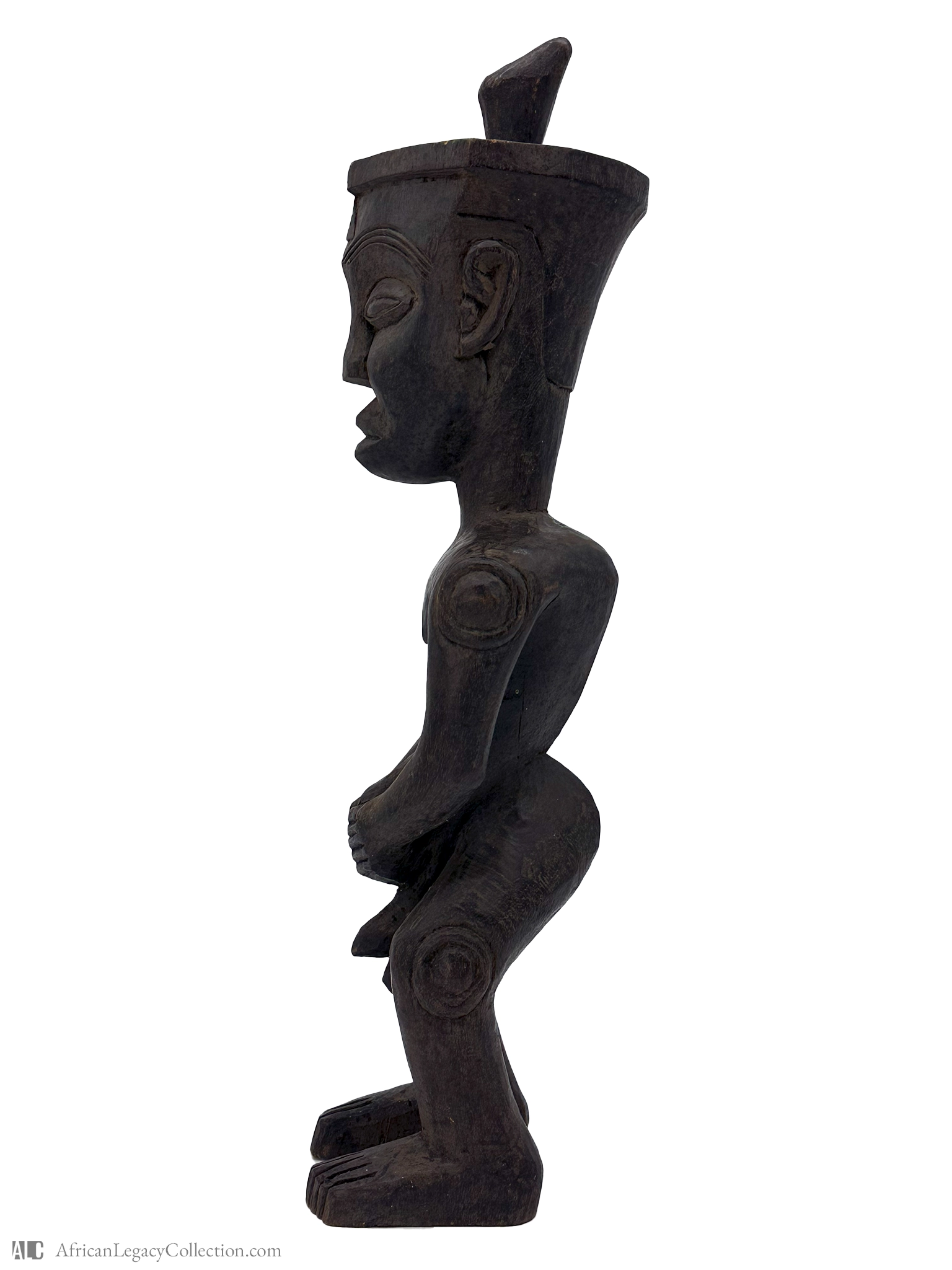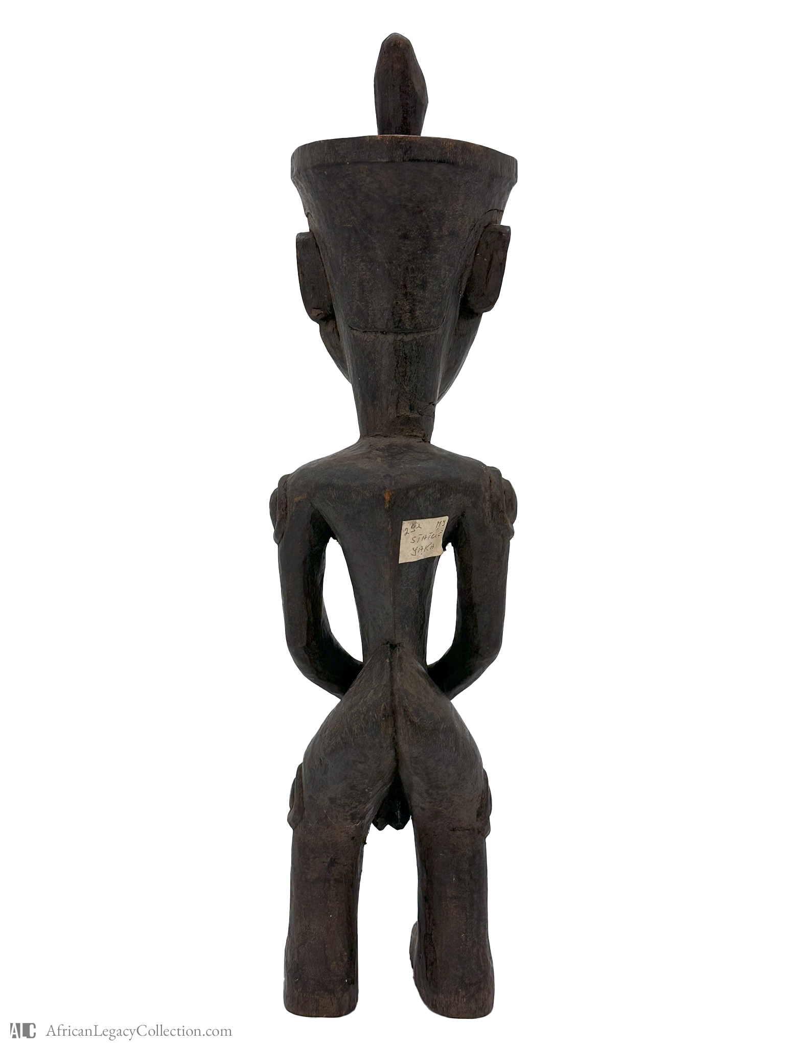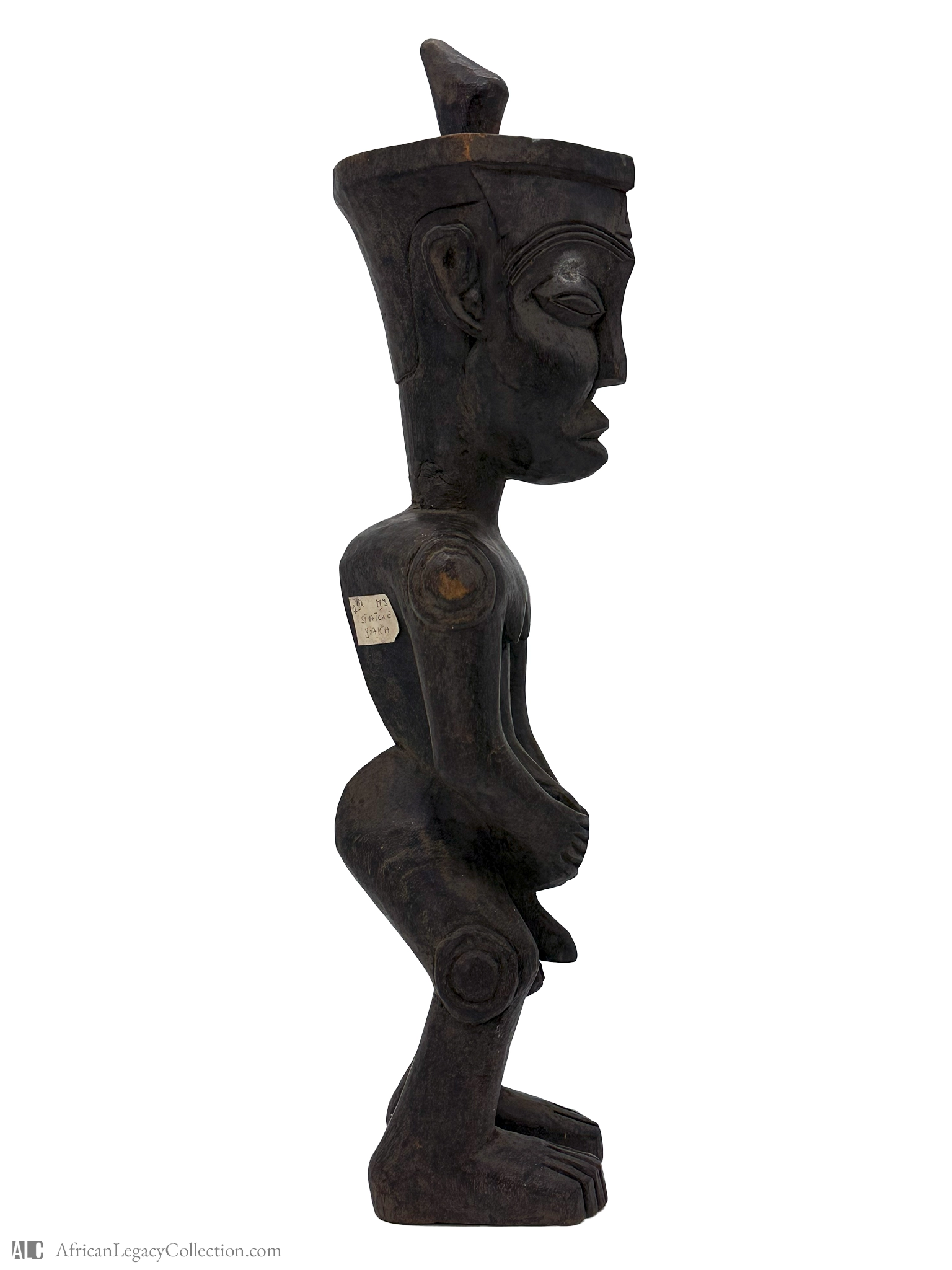 Crafted from hardwood, the statue exhibits intricate detailing possibly achieved through techniques such as incised striations. Its design reflects the historical cultural practices of Central African societies. Such figures are significant as they embody the artistic expression and spiritual beliefs of the people.