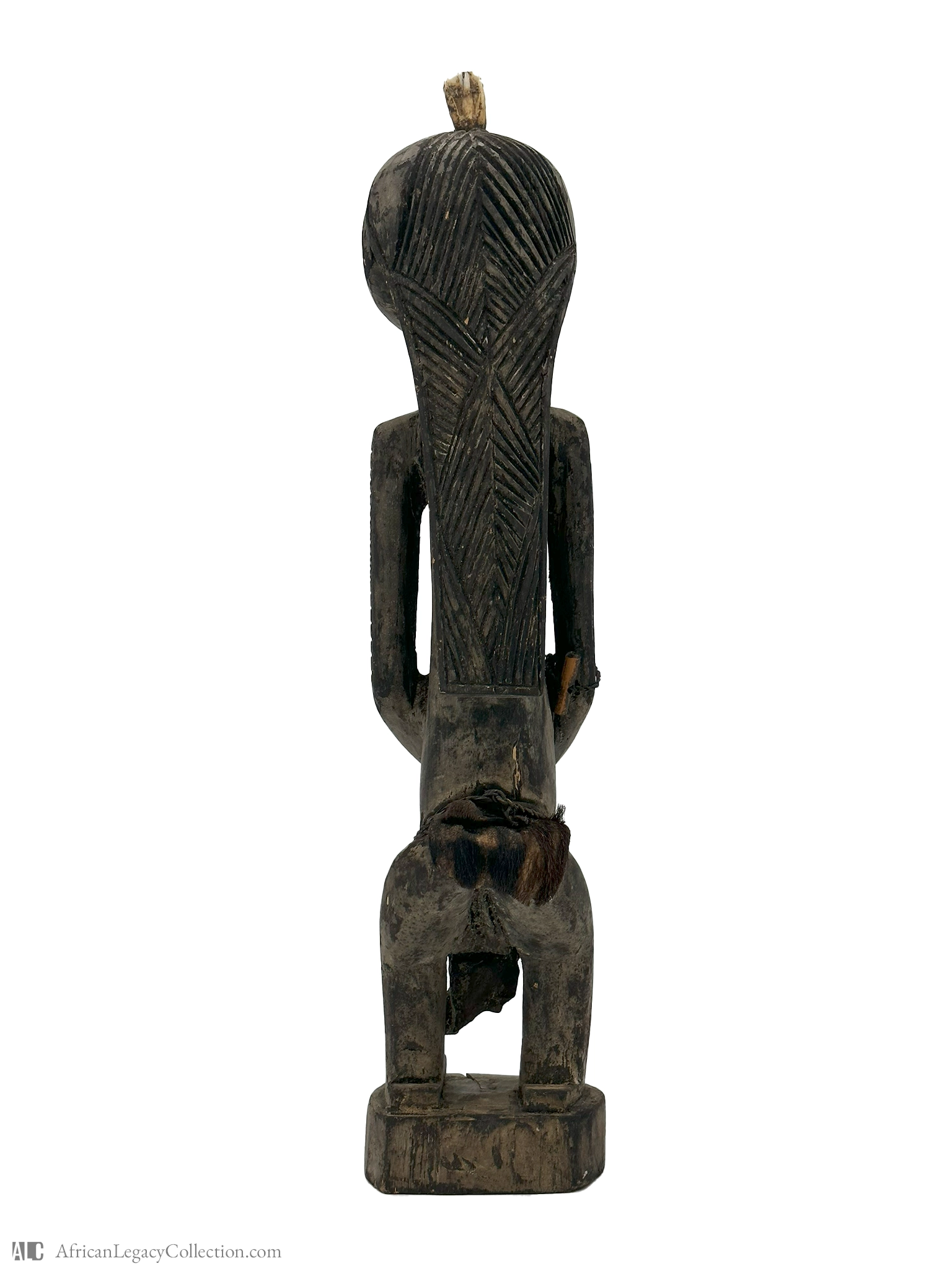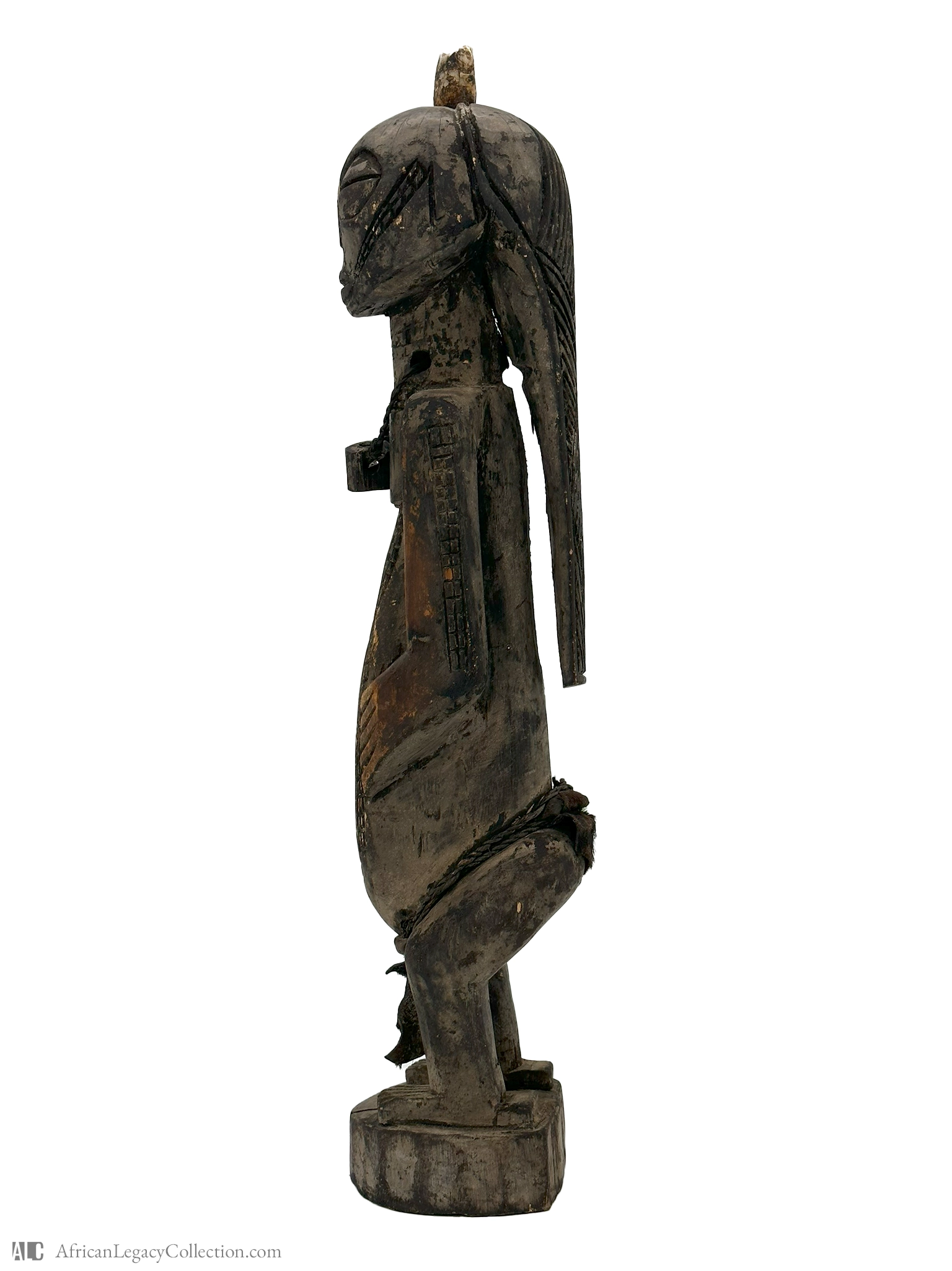 Carved from wood, this piece exhibits detailed incised striations and scarification motifs typical of Dogon artistry. These figures have historical significance, representing beliefs about ancestry and the afterlife within the Dogon culture. Their artistic style and symbolic roles are significant influences in the study of African art and anthropology.
