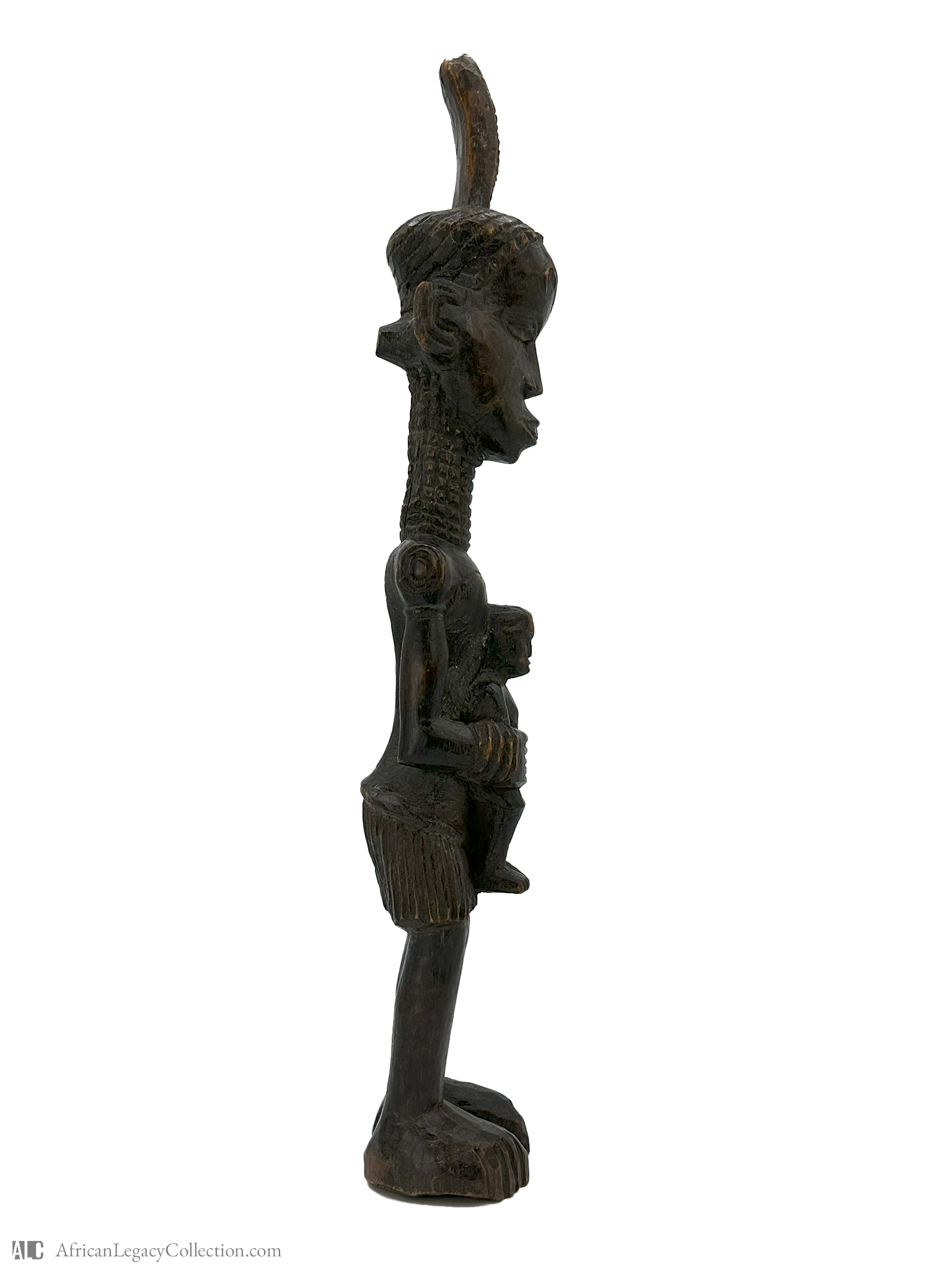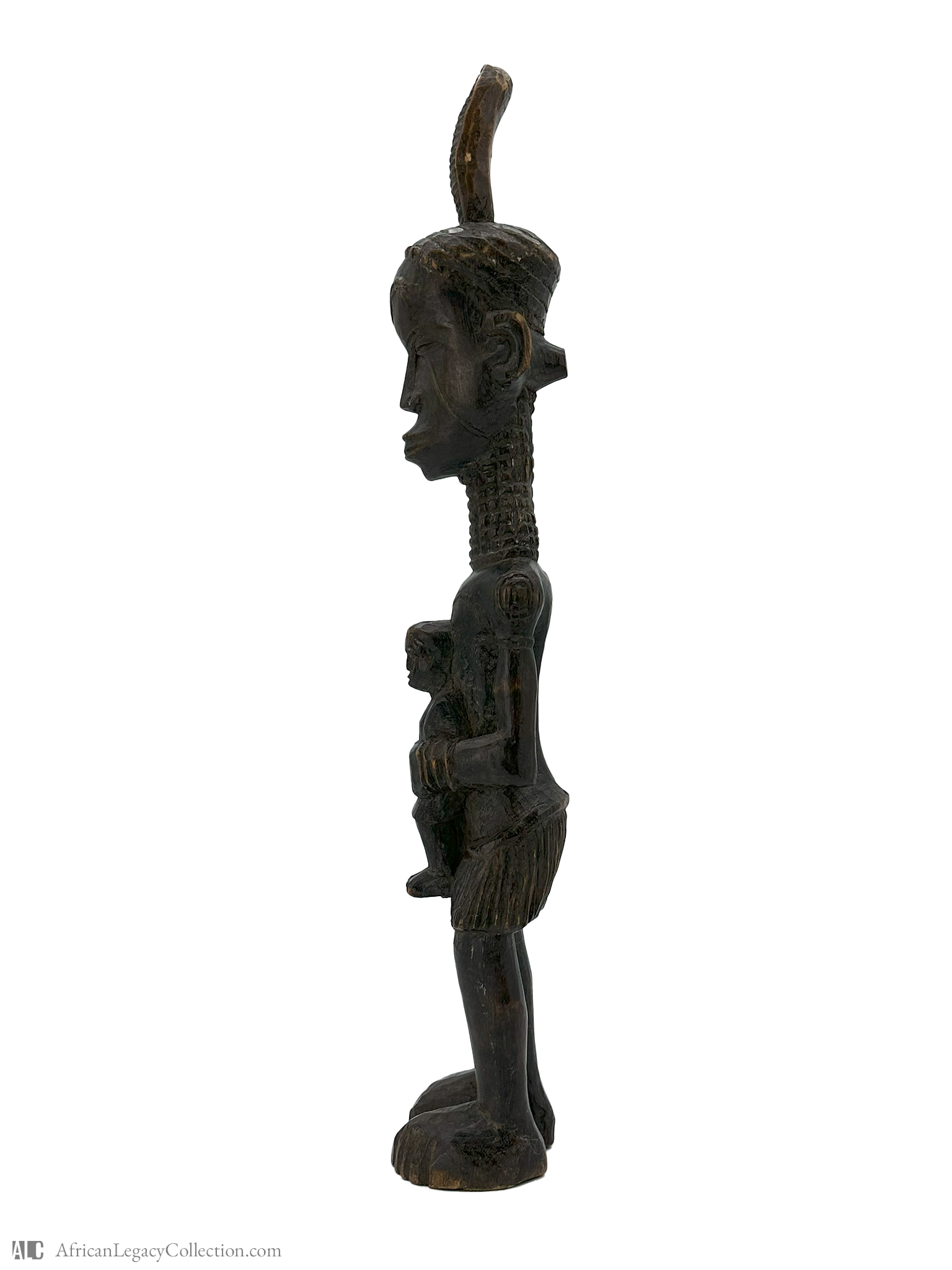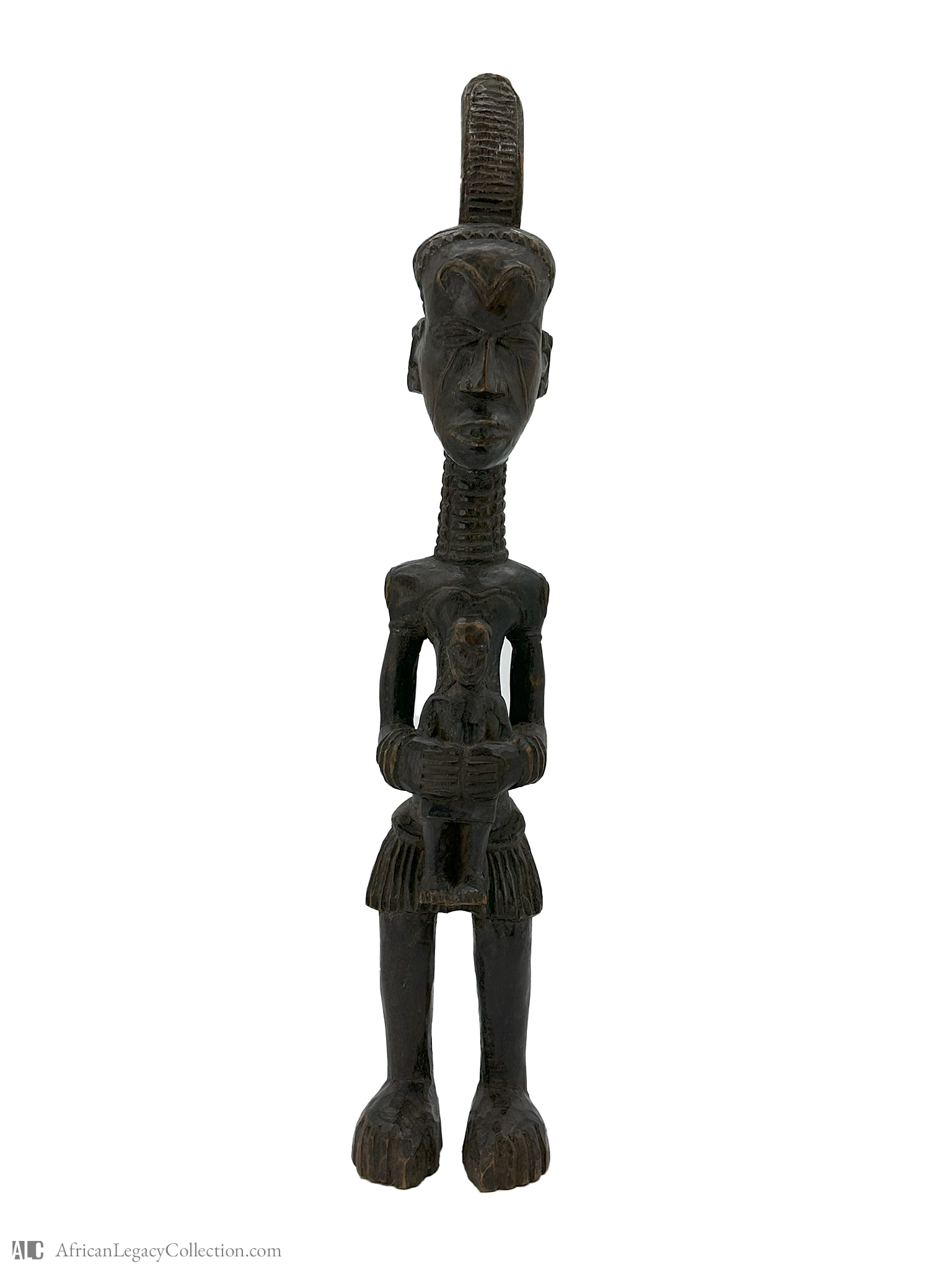 This wooden sculpture is a figurative representation of a mother and child, typical of African ancestral figures. It most likely originates from West Africa, reflecting the cultural significance of motherhood. These statues are often used in rituals to honor ancestors and invoke protection and fertility.
