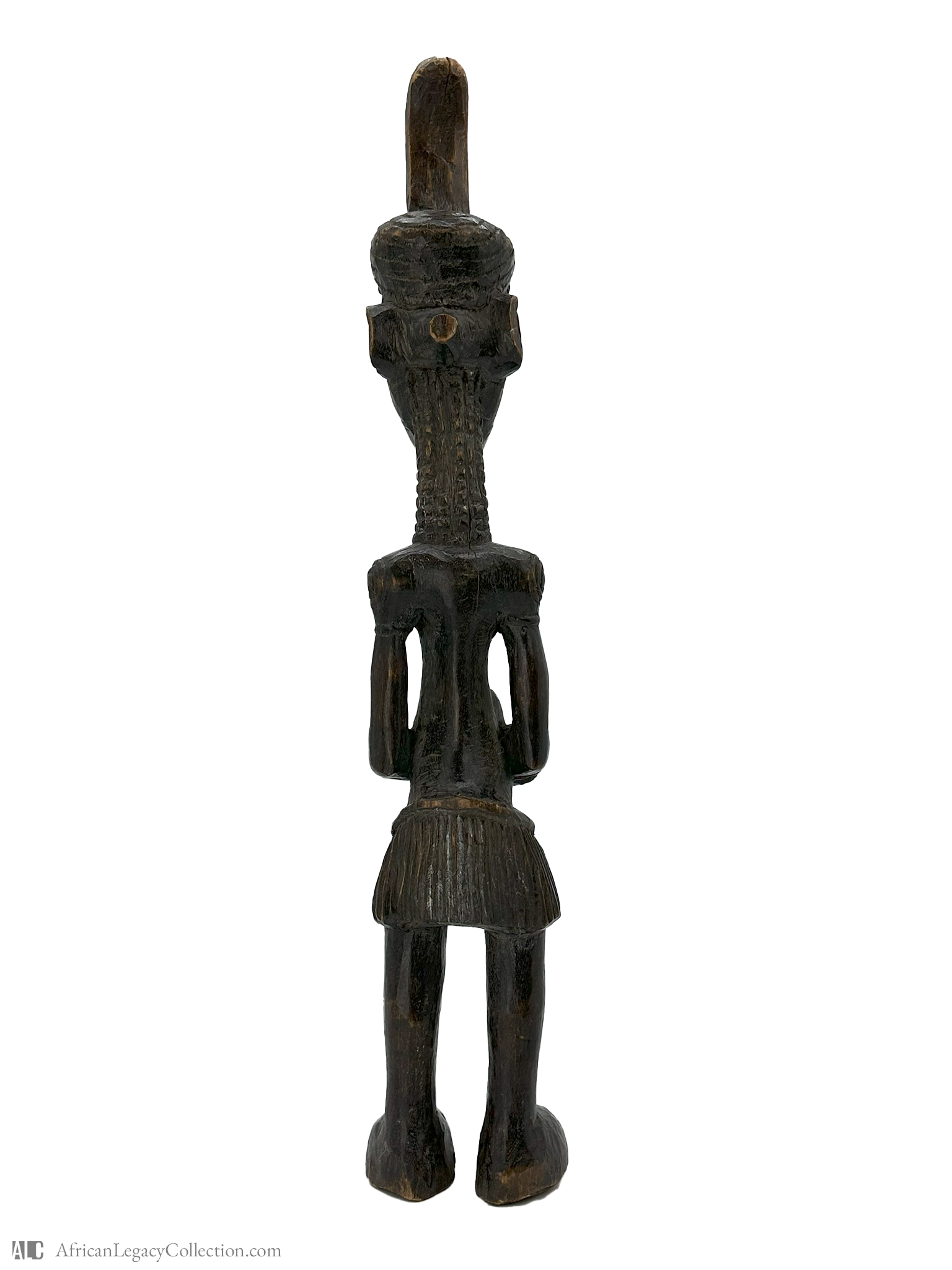 Crafted using traditional carving techniques, the piece exhibits notable scarification motifs, adding to its cultural authenticity. The historical context ties to community rituals and religious practices, where such figures play an integral role. The smooth patina suggests age and handling, enhancing its reverence and historic significance.