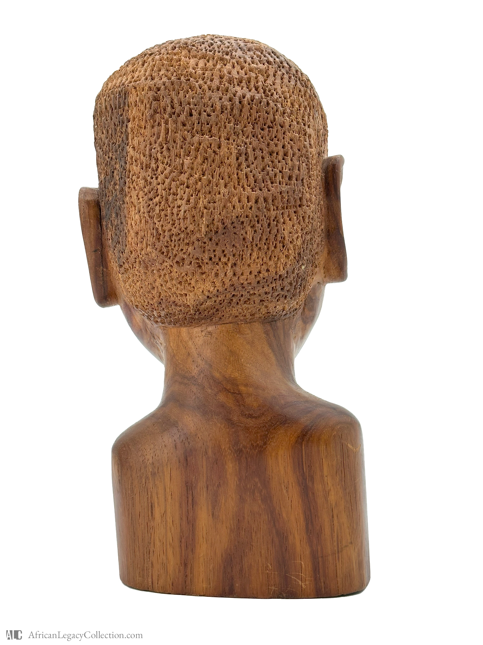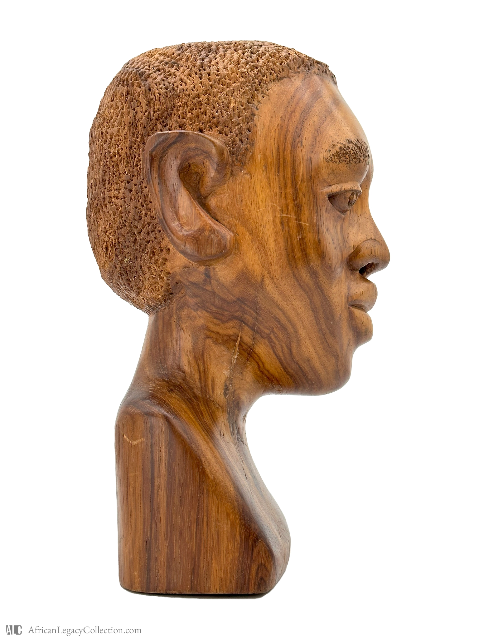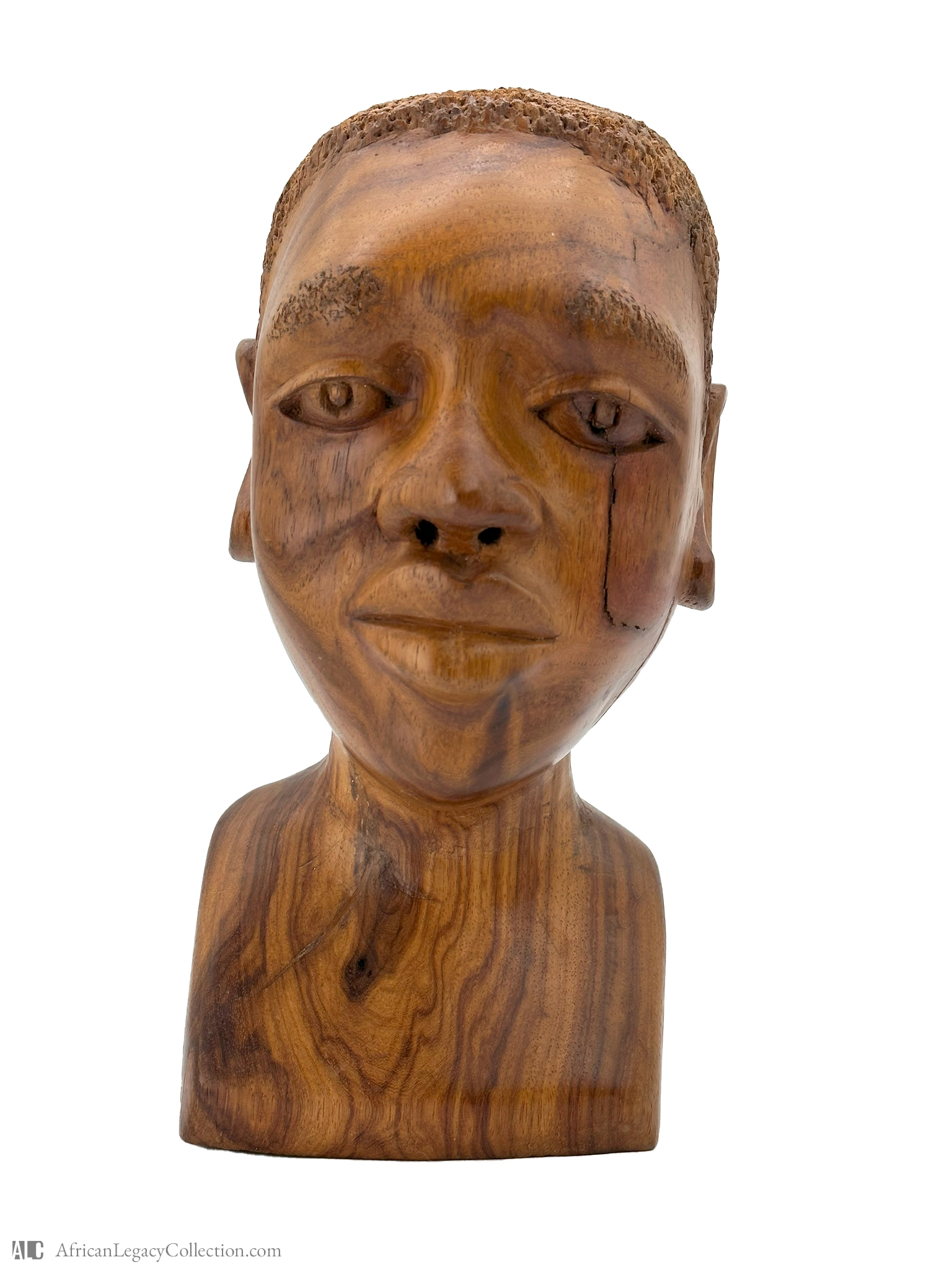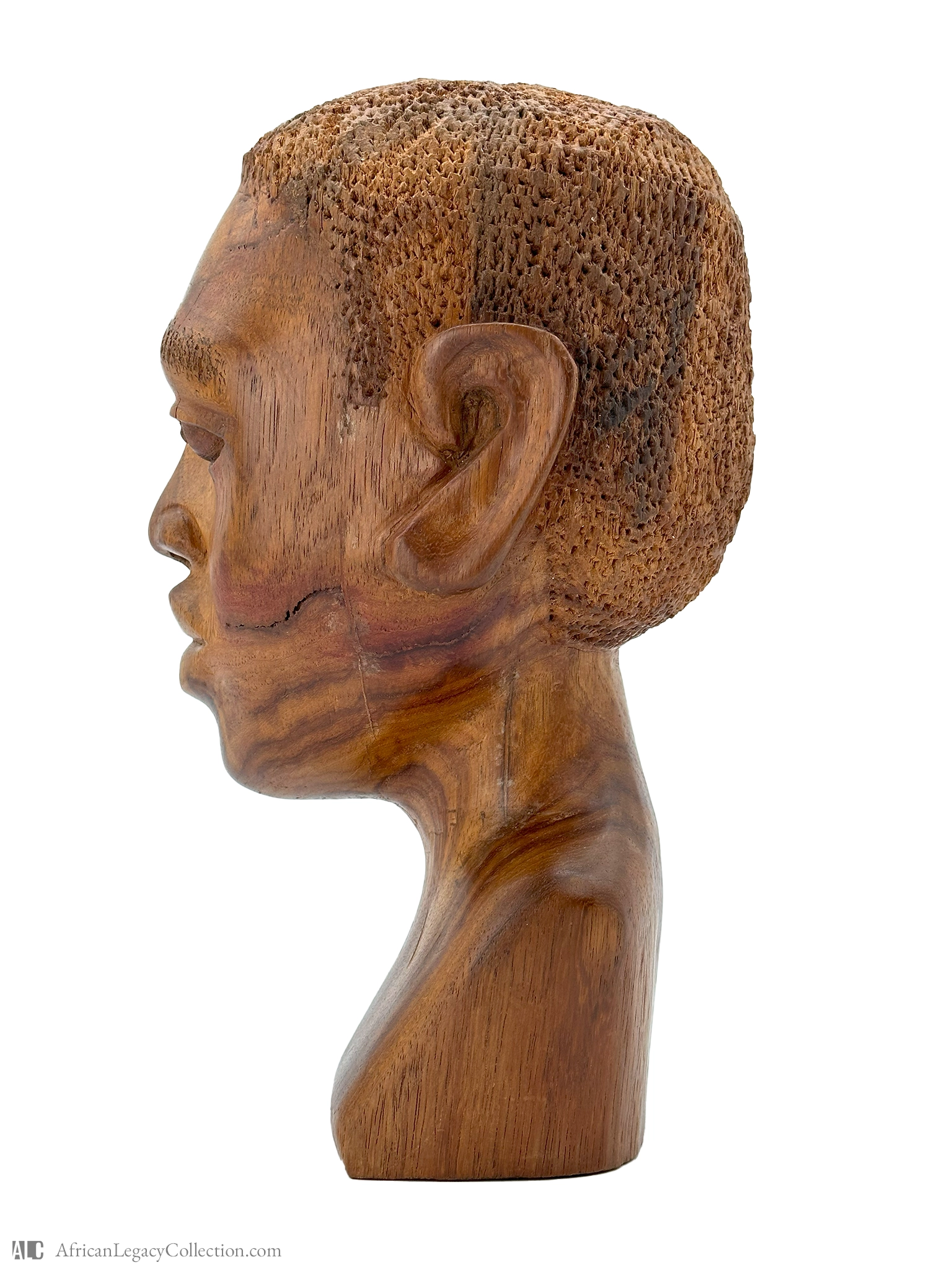 This intricately carved wooden head likely originates from West Africa, serving as a symbolic representation used in cultural or ceremonial contexts. The expressive facial features suggest its role in storytelling or as a tribute to ancestral figures.