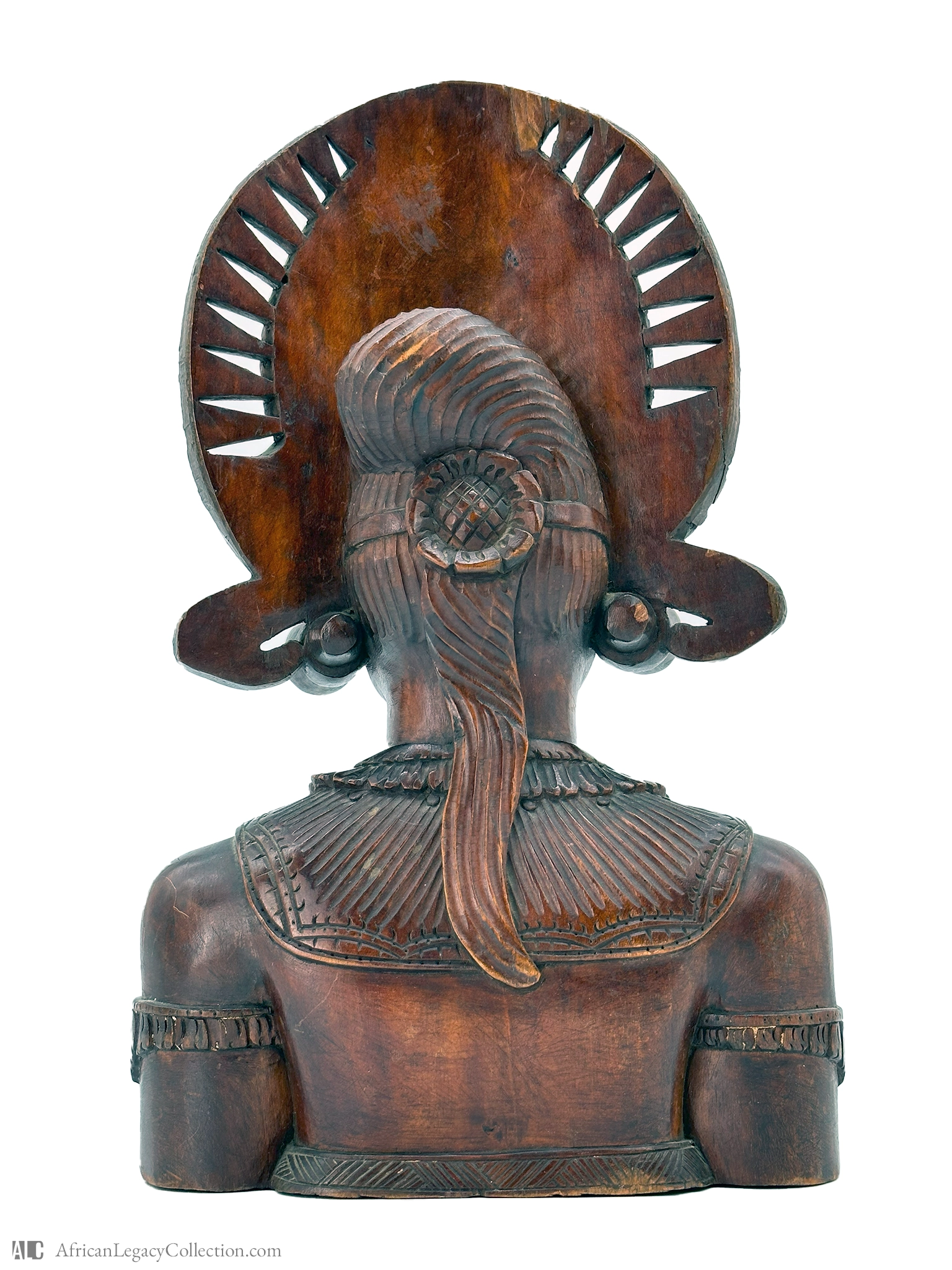 This sculpture likely represents an African figure, serving as a symbolic or decorative piece. Its style is indicative of traditional carvings found in various African cultures, suggesting its place of origin might be from regions known for woodcraft. The deliberate and careful detailing on the headdress and facial features suggest it was intended for ceremonial or high-status display.