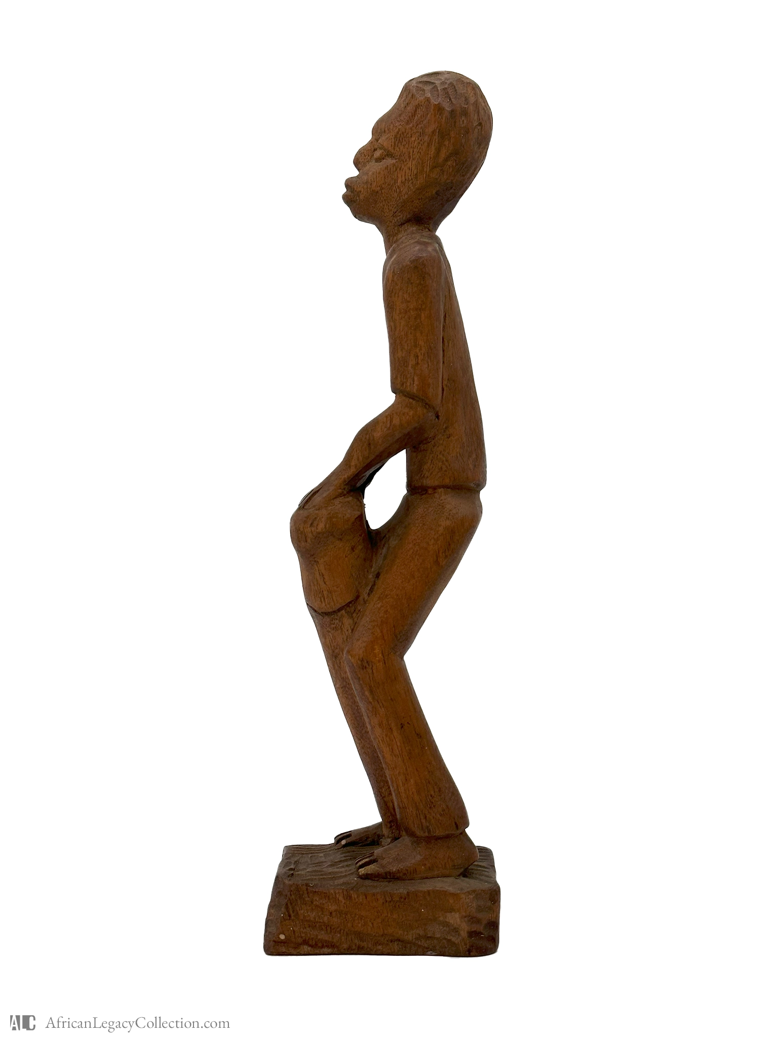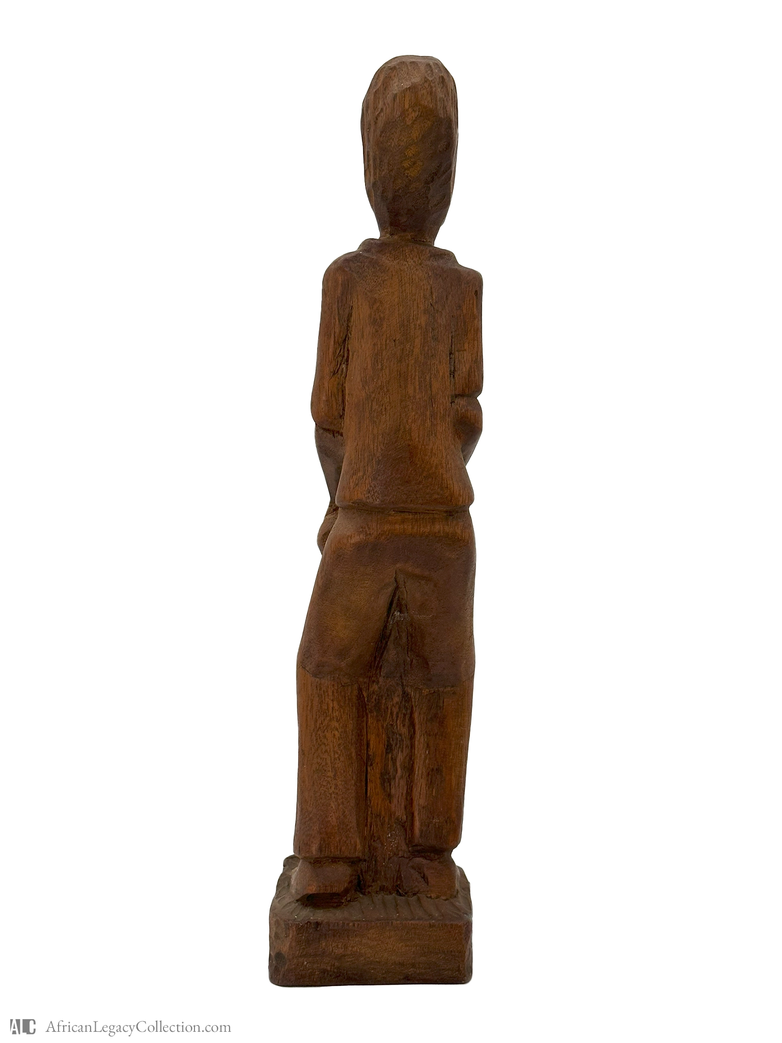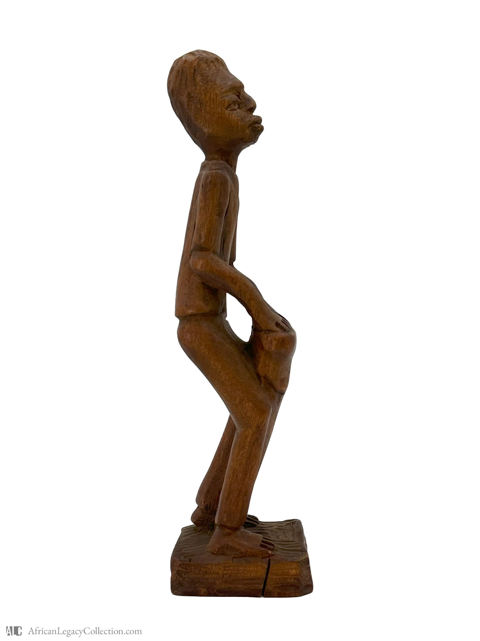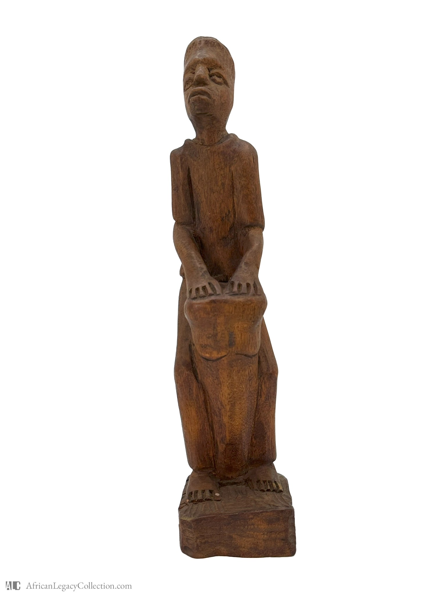 This sculpture likely represents a figure playing a drum, commonly used in various West African communities for rituals and celebrations. The style suggests it might originate from a region known for its rich tradition of wooden carvings, reflecting the cultural importance of music and rhythmic expression.