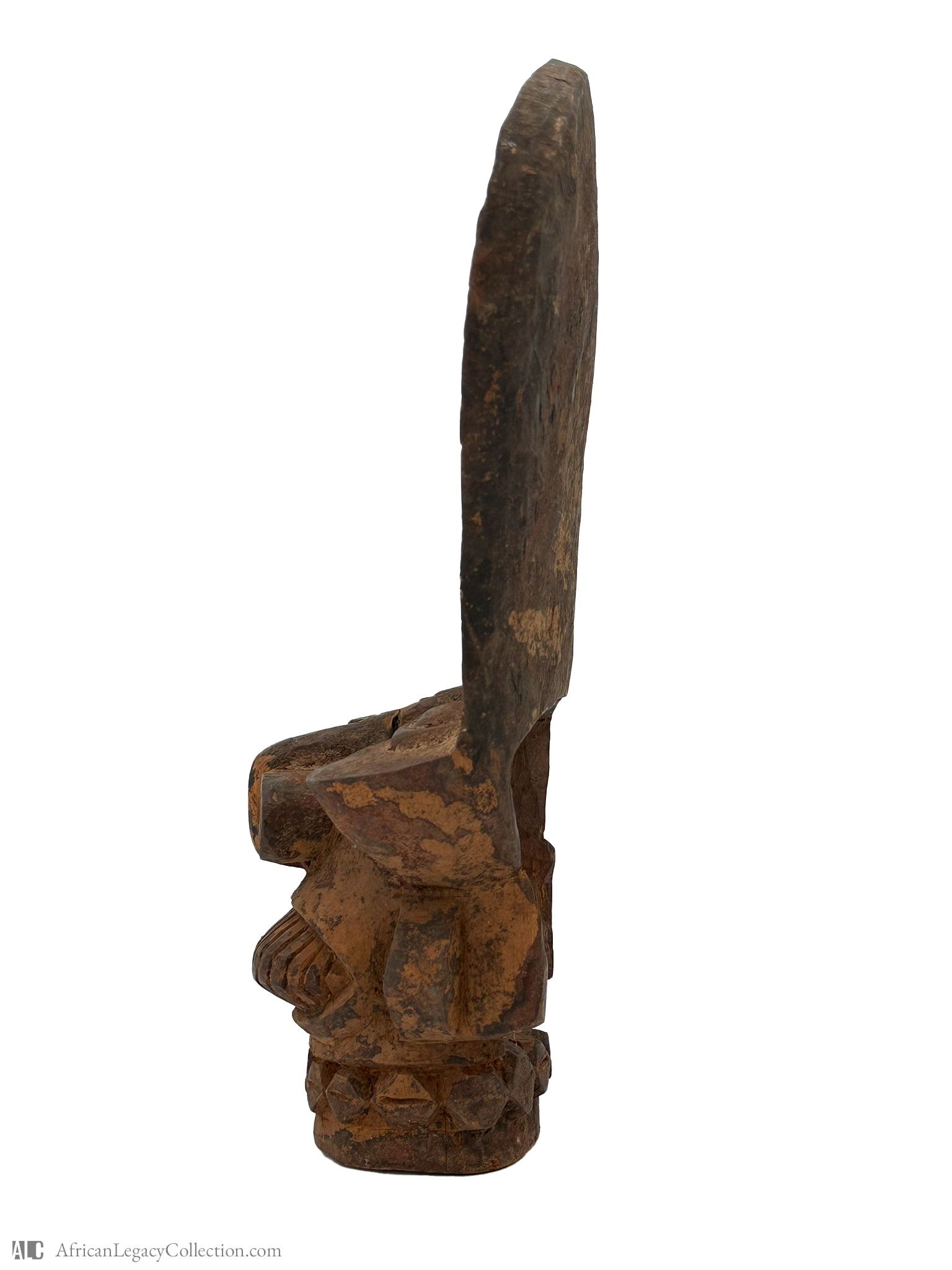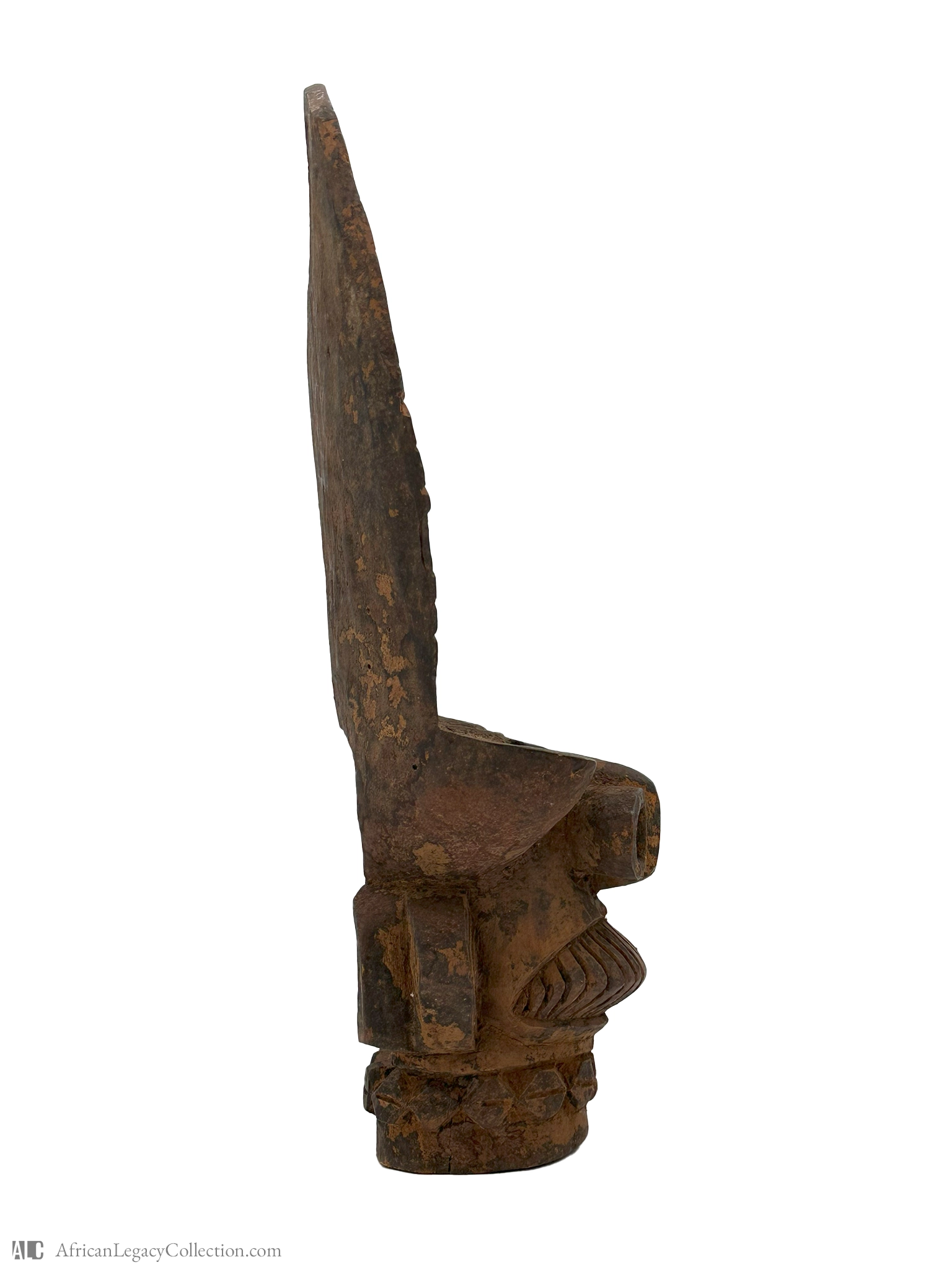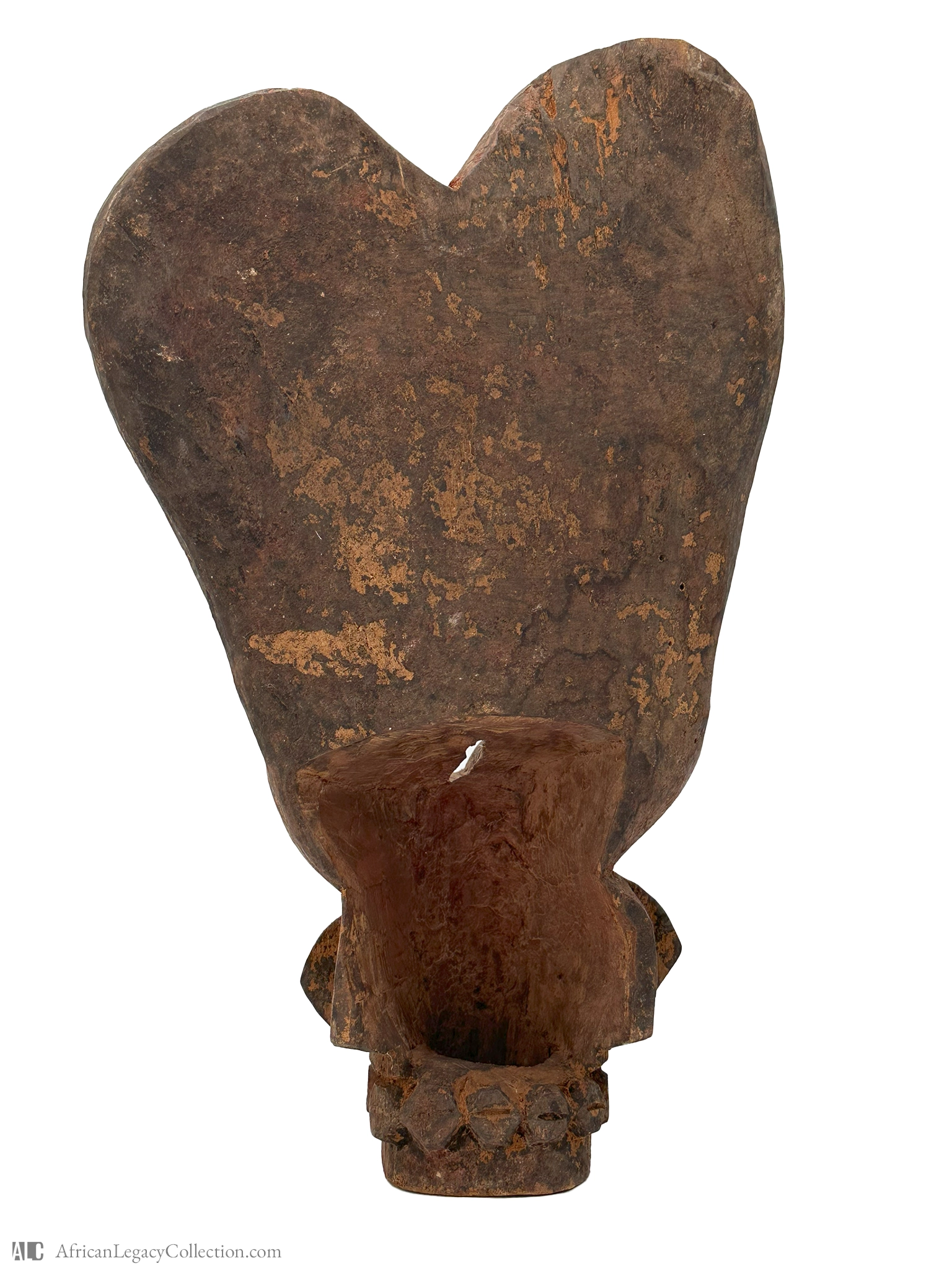 The mask is carved from wood, displaying incised striations and a distinct patina, indicative of its age and use. The historical context places it within the realm of tribal societies where such masks play a pivotal role. The craftsmanship and use of natural materials highlight the cultural significance and artistic skills prevalent in the community.