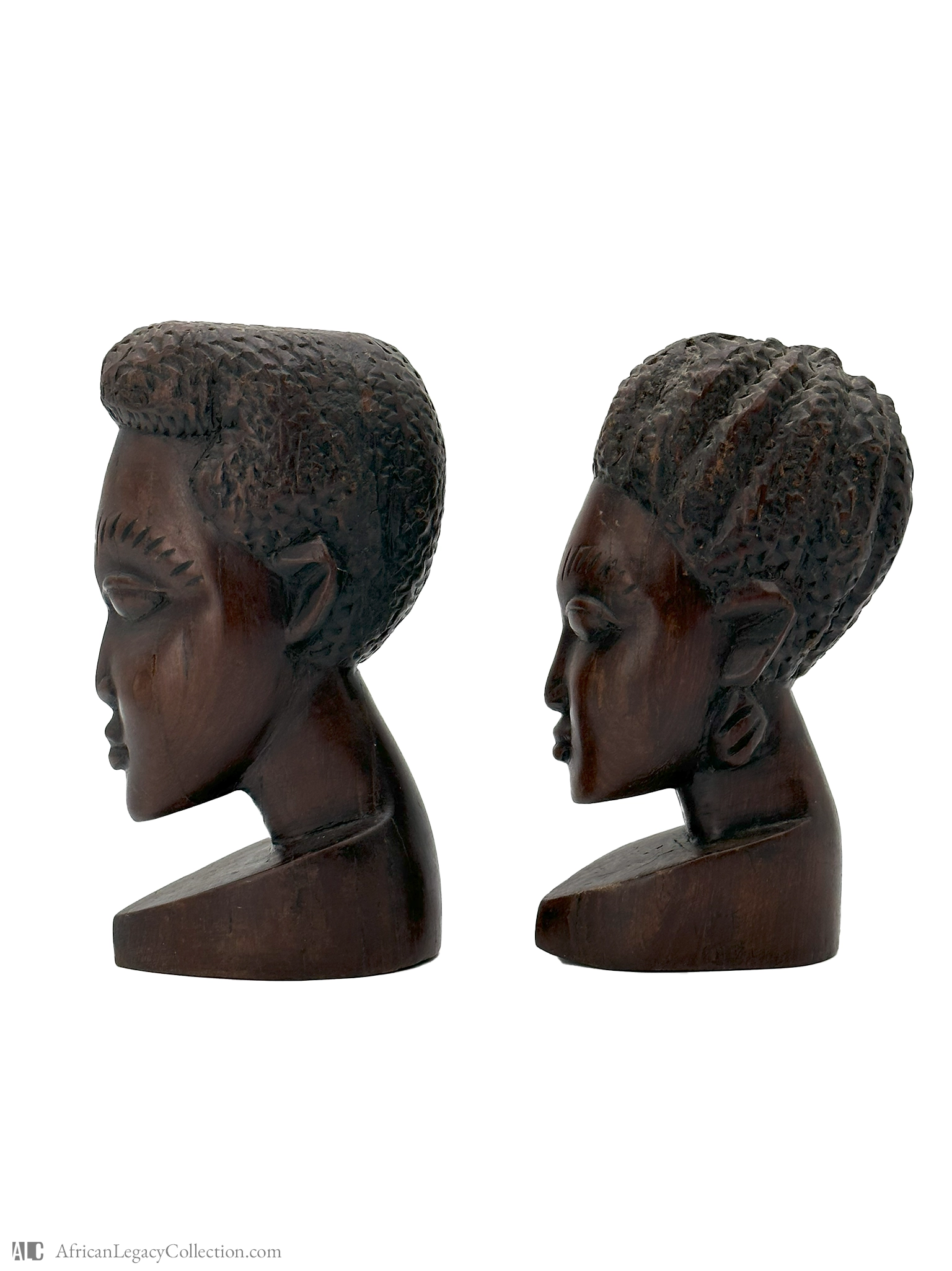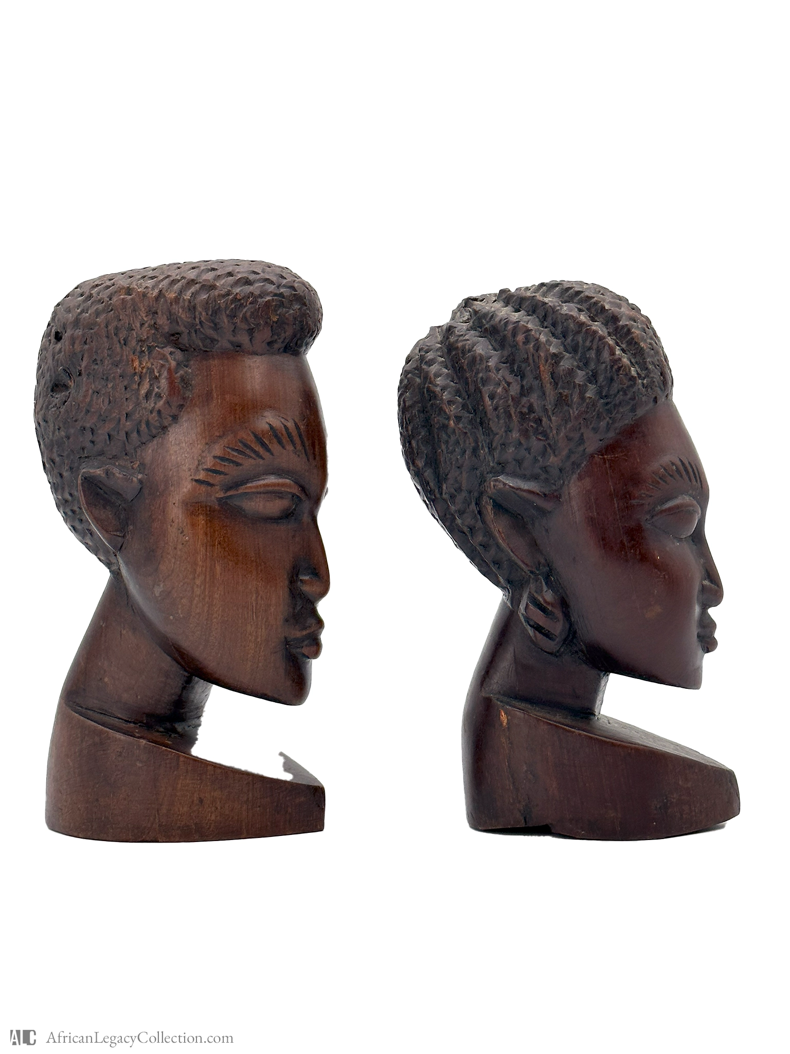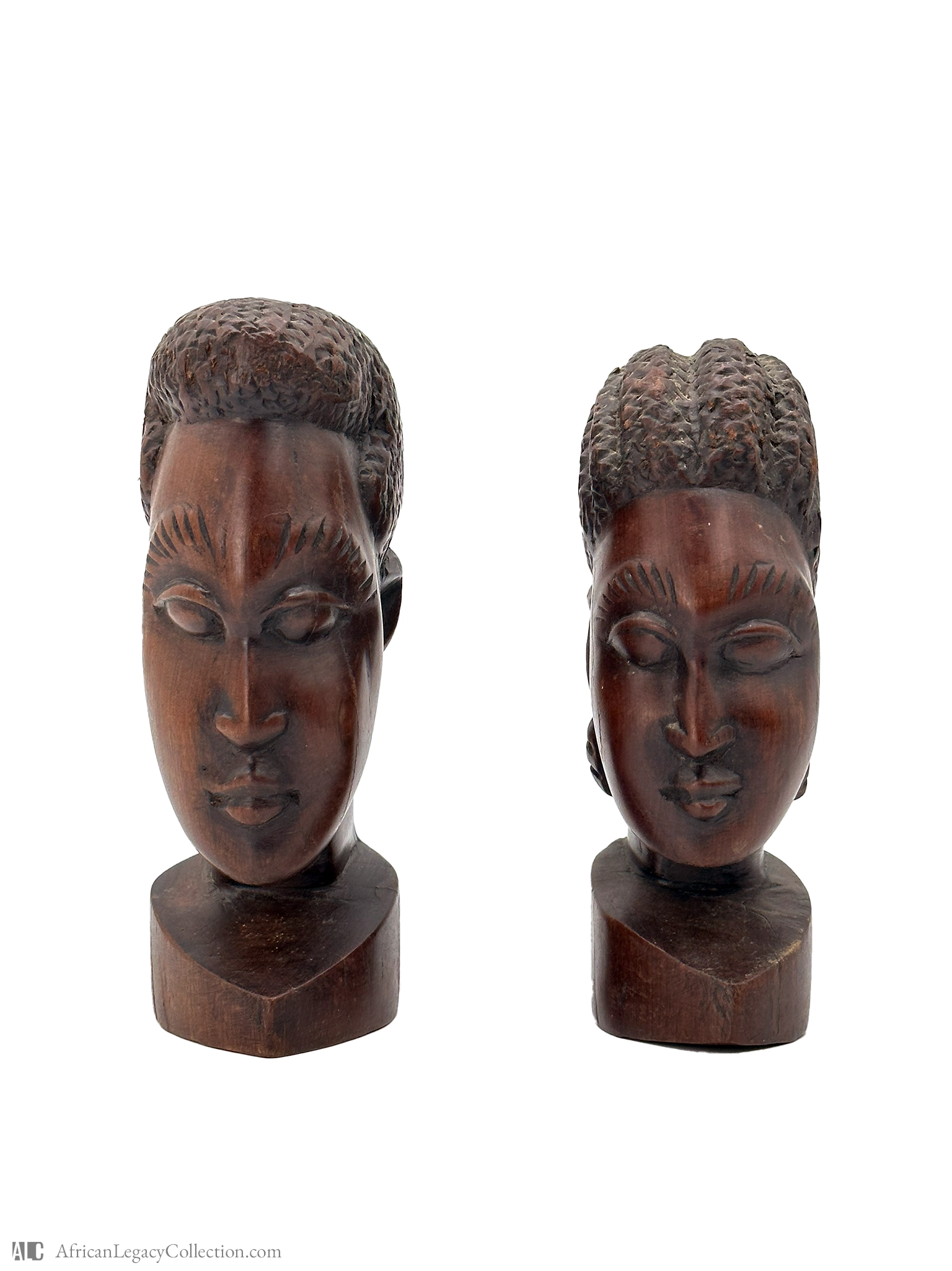 These carved wooden busts likely originate from West Africa and depict stylized human figures. They may serve a decorative purpose or represent cultural iconography, reflecting the artistic traditions of the region.