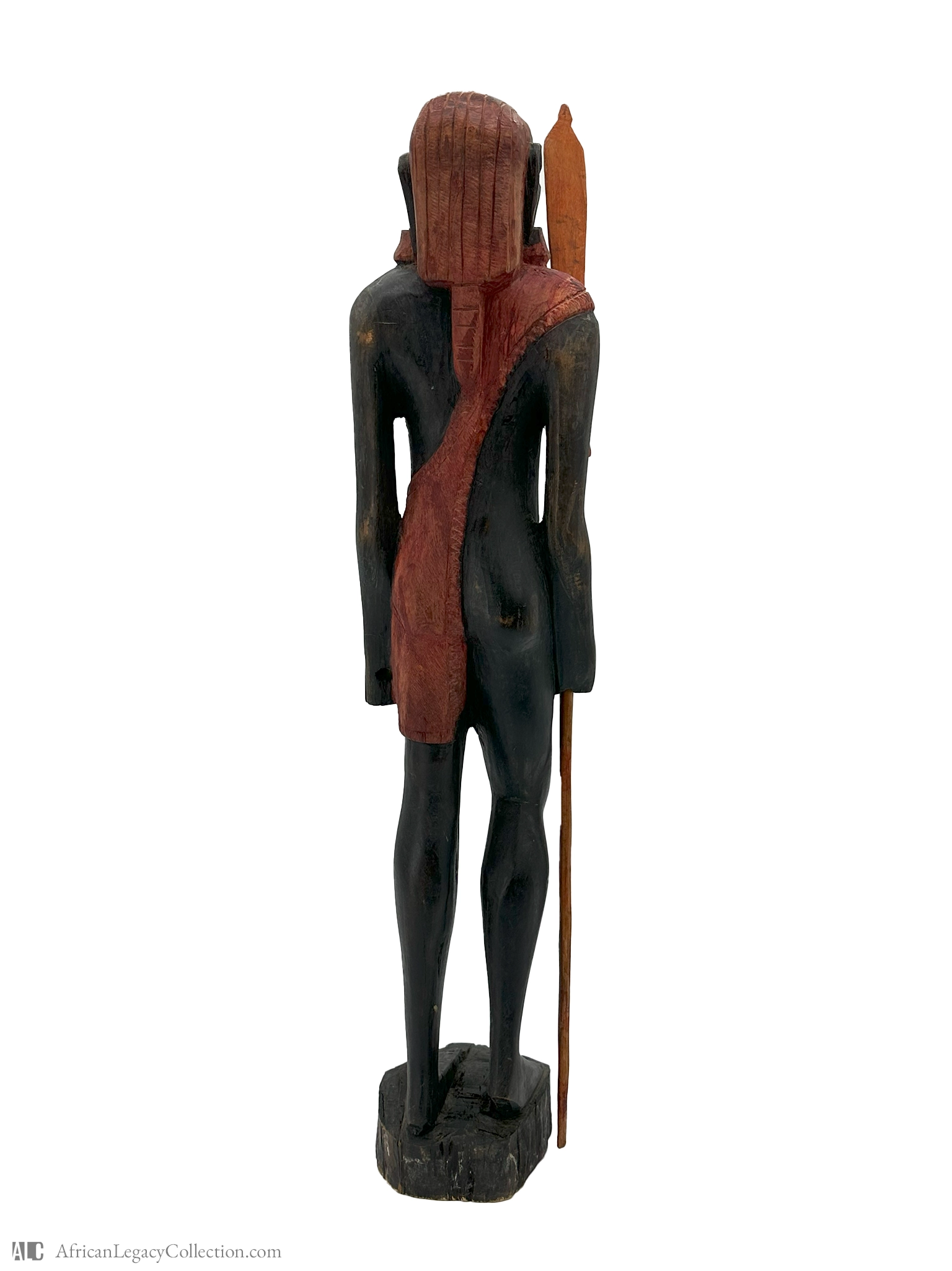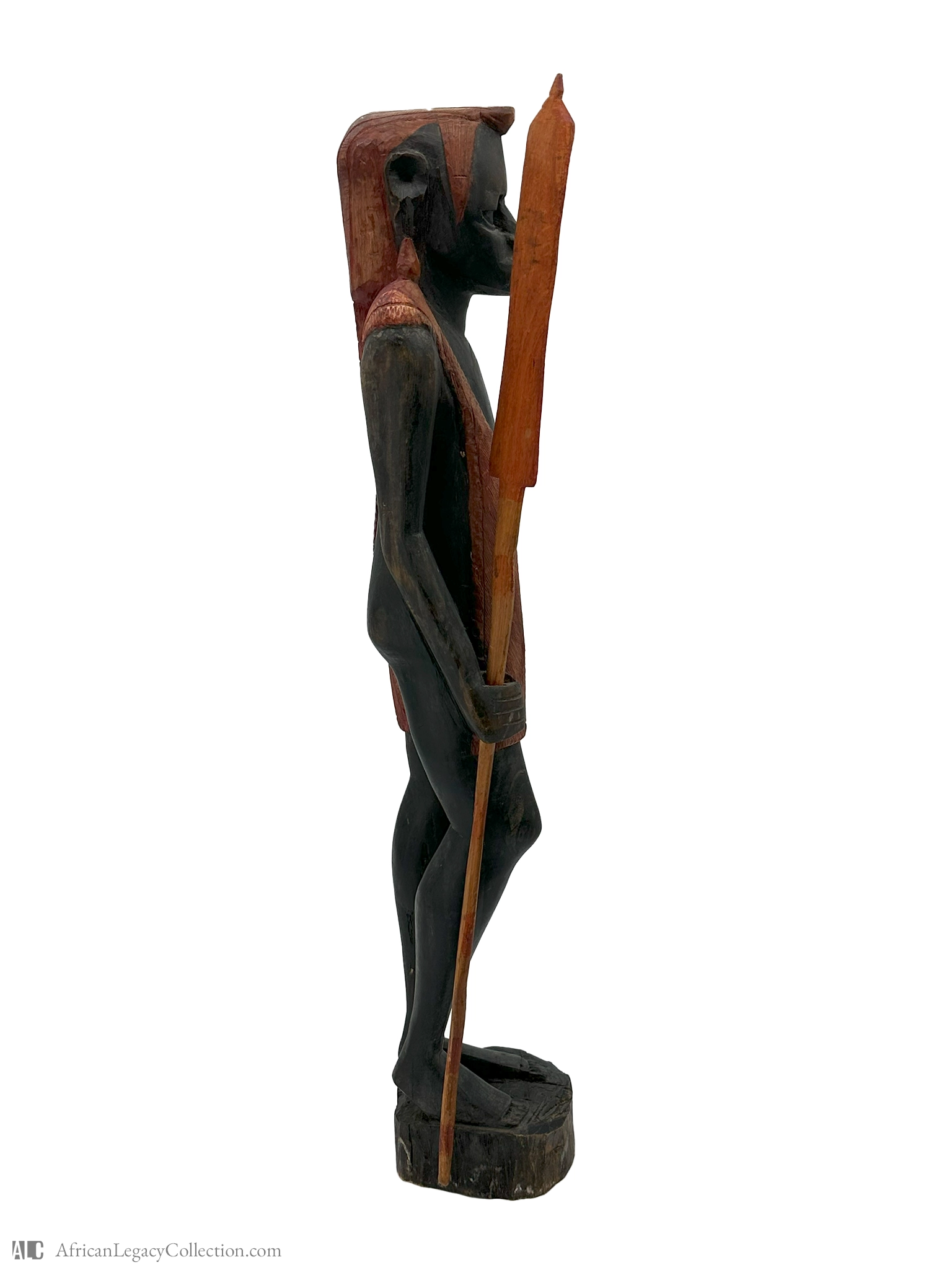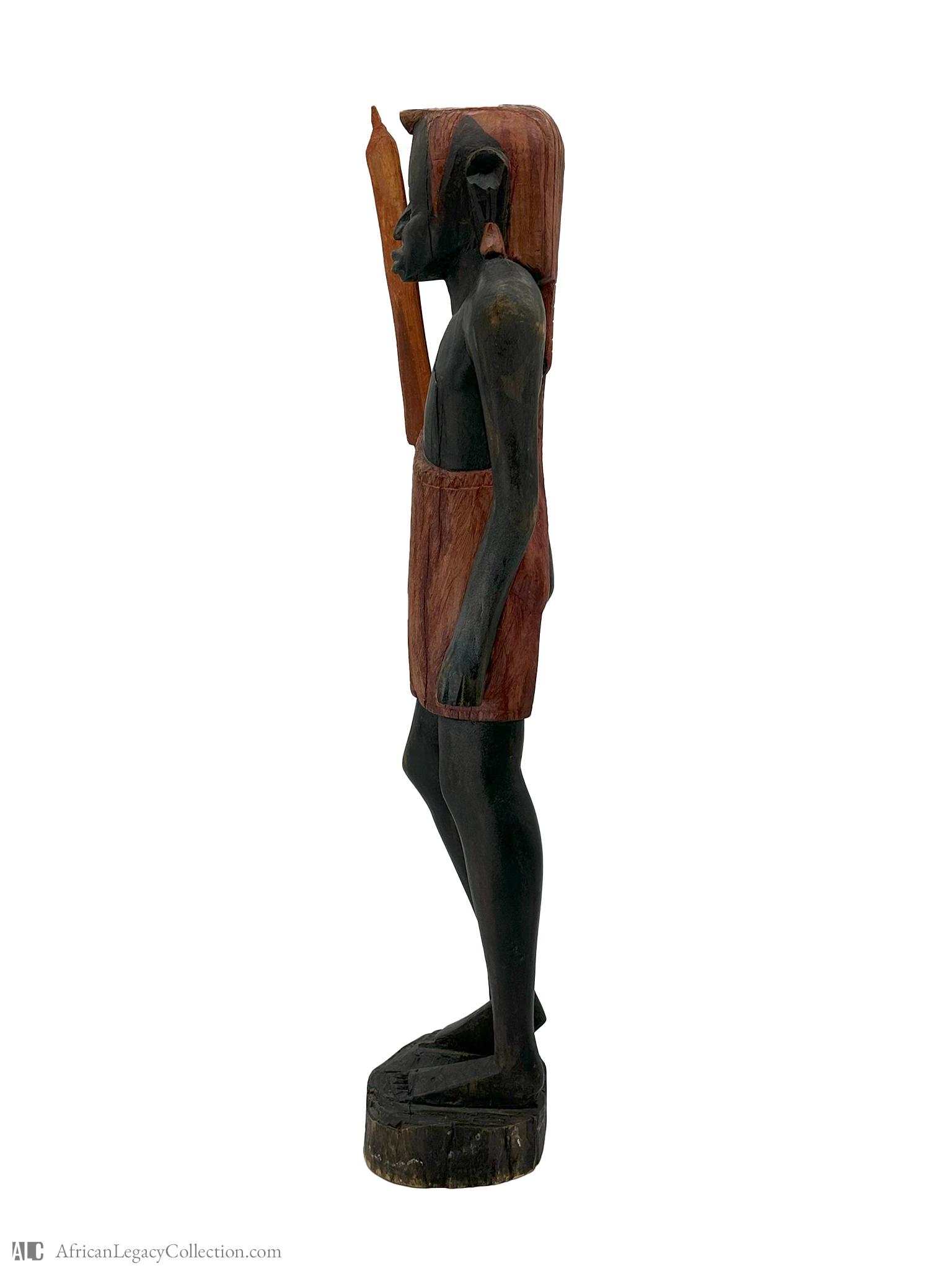 This wooden sculpture likely originates from East Africa. It represents a warrior figure, indicated by the spear and traditional attire, and may have been used for ceremonial purposes or as a cultural representation in storytelling or educational practices within the community.