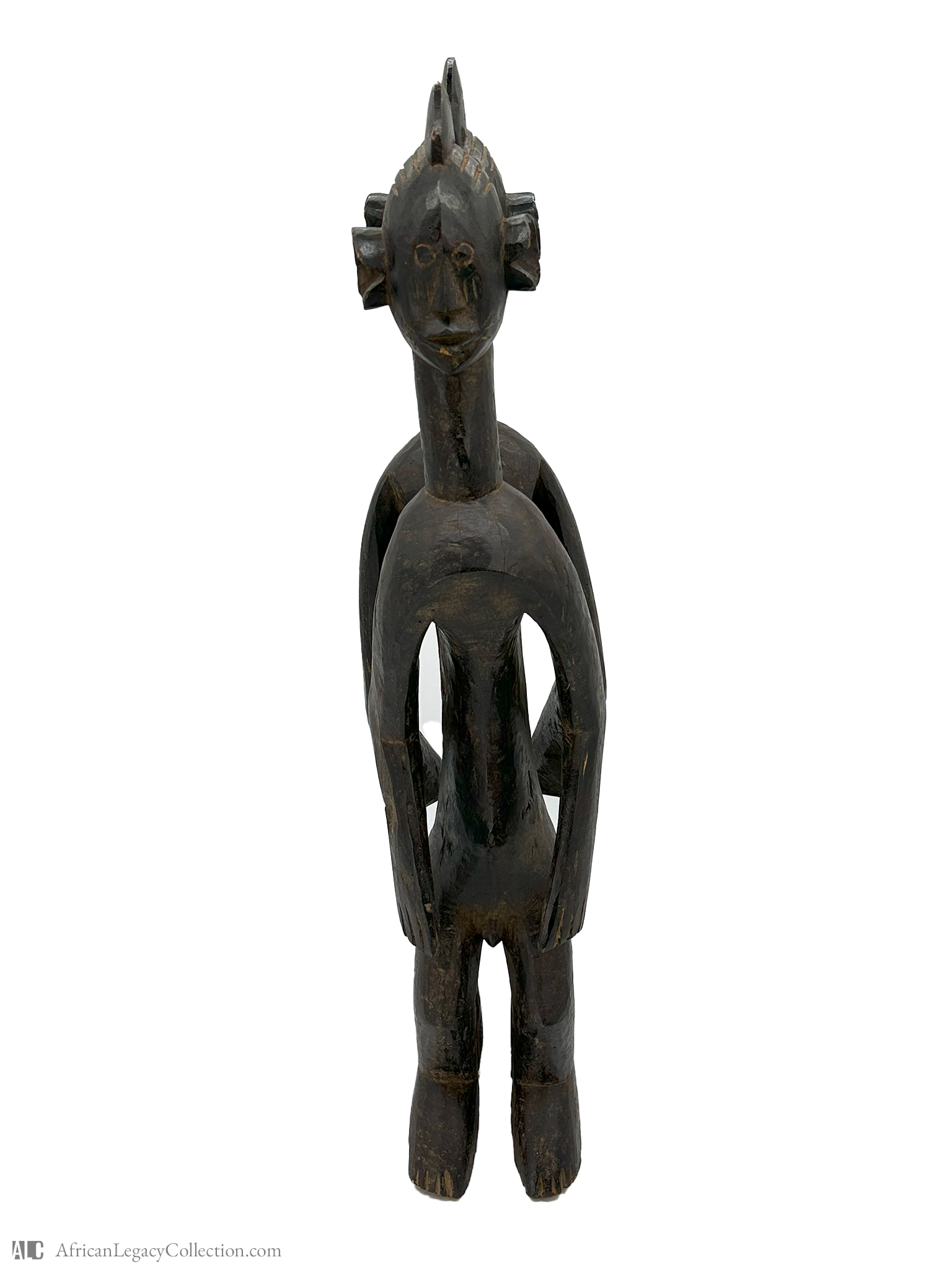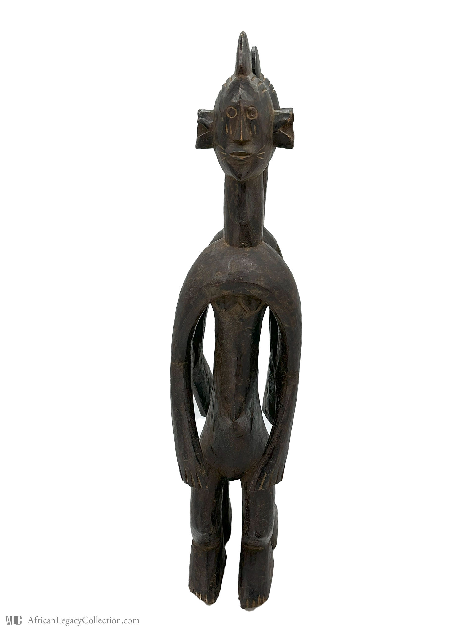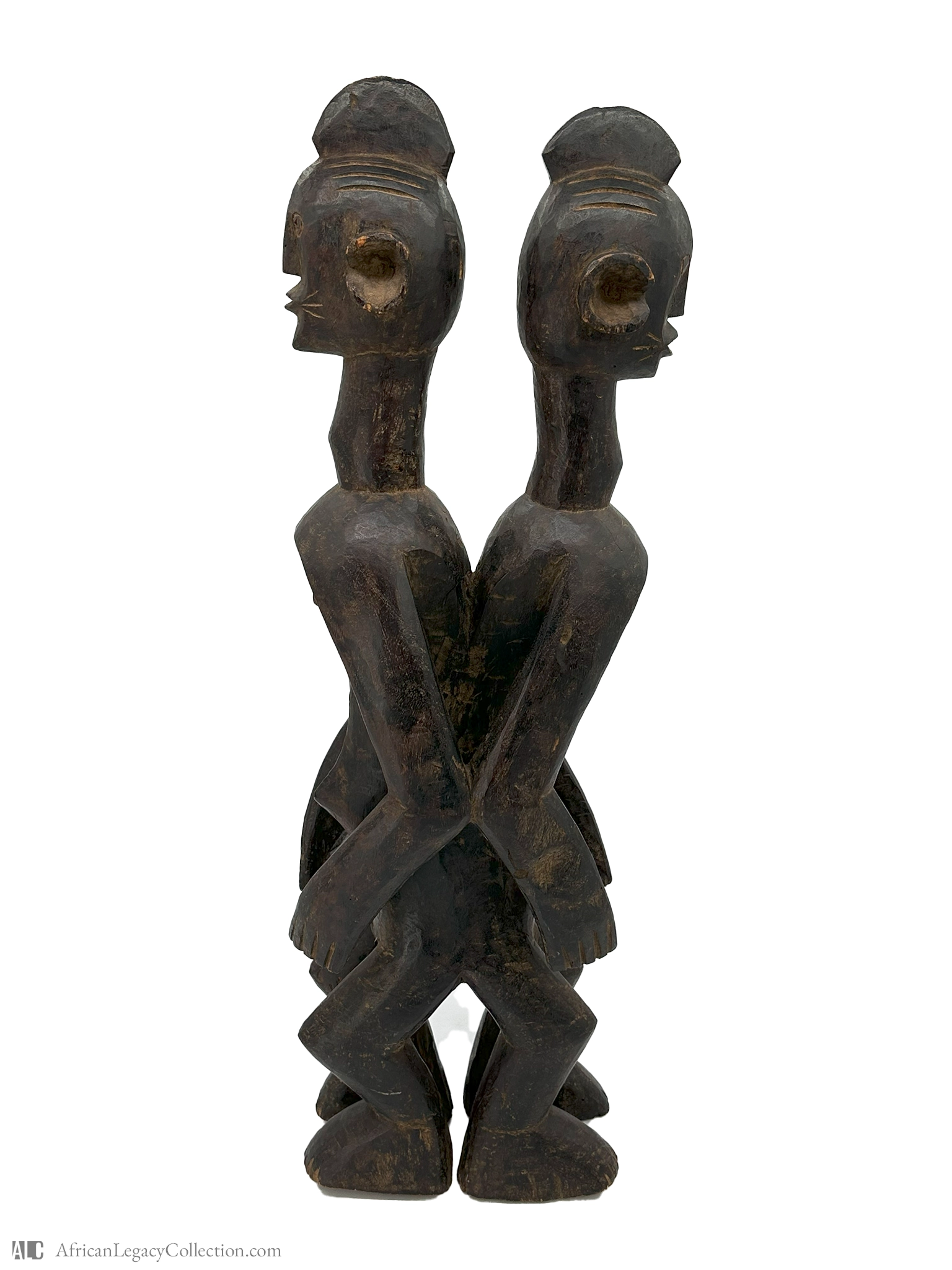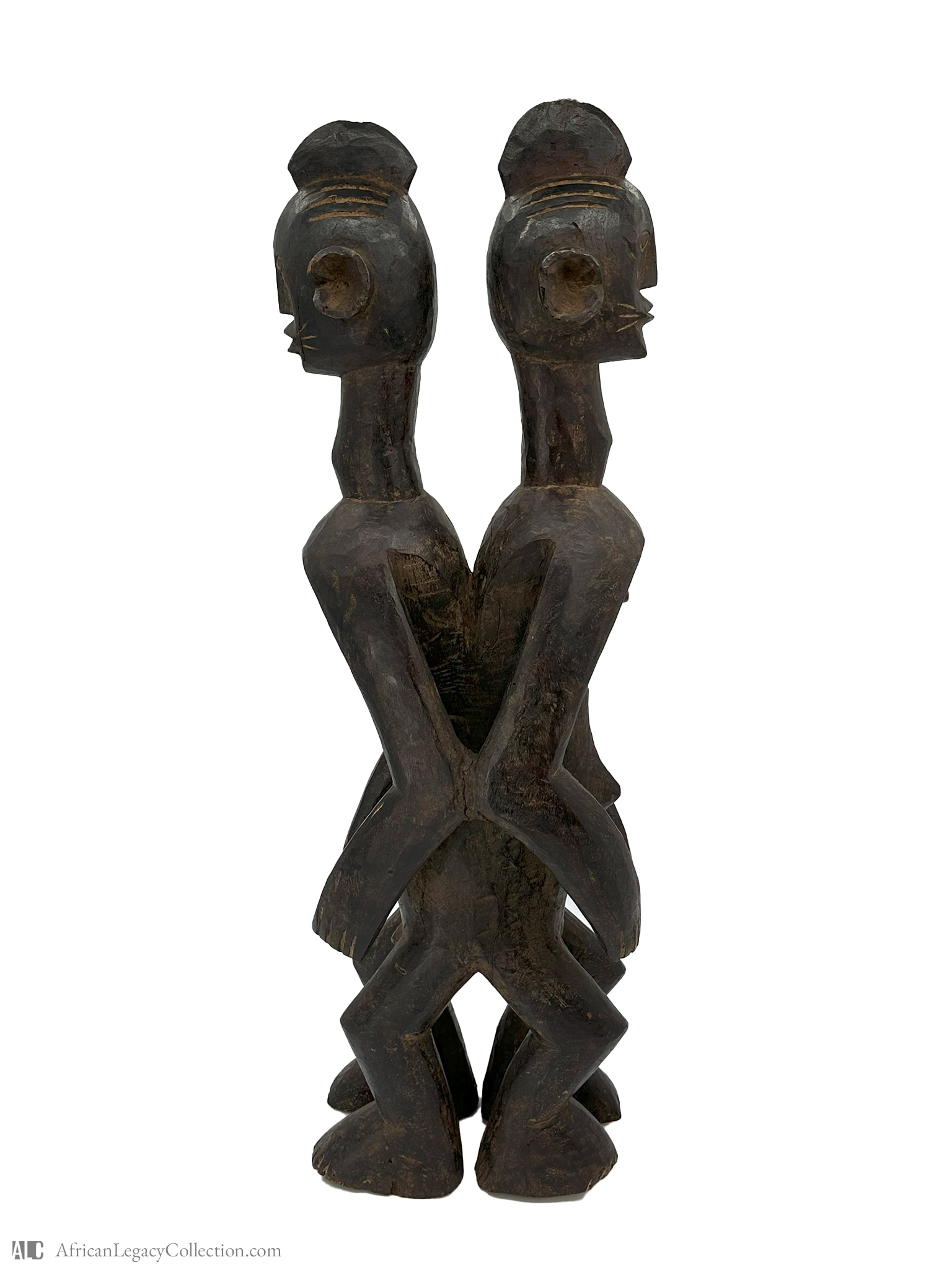 This wooden sculpture, featuring two figures joined back-to-back, likely originates from West Africa and is commonly associated with spiritual or ritualistic purposes. The figures’ stylized form and symmetrical posture indicate a cultural emphasis on duality and unity, possibly representing themes of interconnectedness within community or family structures.