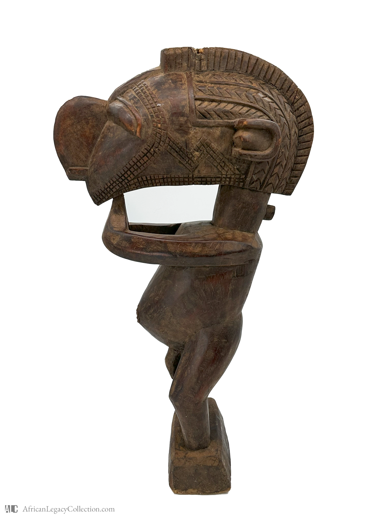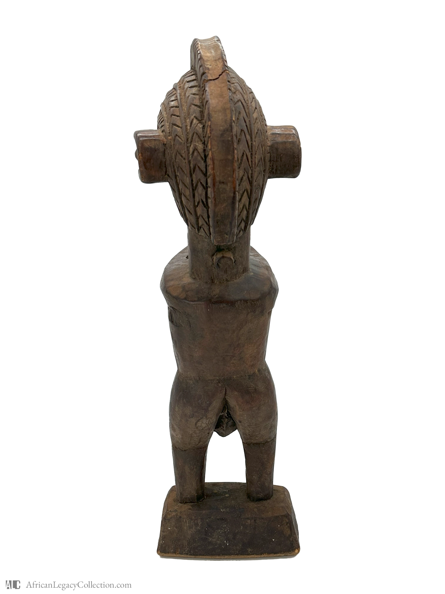 Crafted primarily from wood, this piece showcases incised striations and scarification motifs, demonstrating exquisite craftsmanship typical of Baule artistry. Its historical context lies in the rich tradition of African masquerades, which play a critical role in social and religious ceremonies, highlighting the cultural significance of art in spiritual practices.