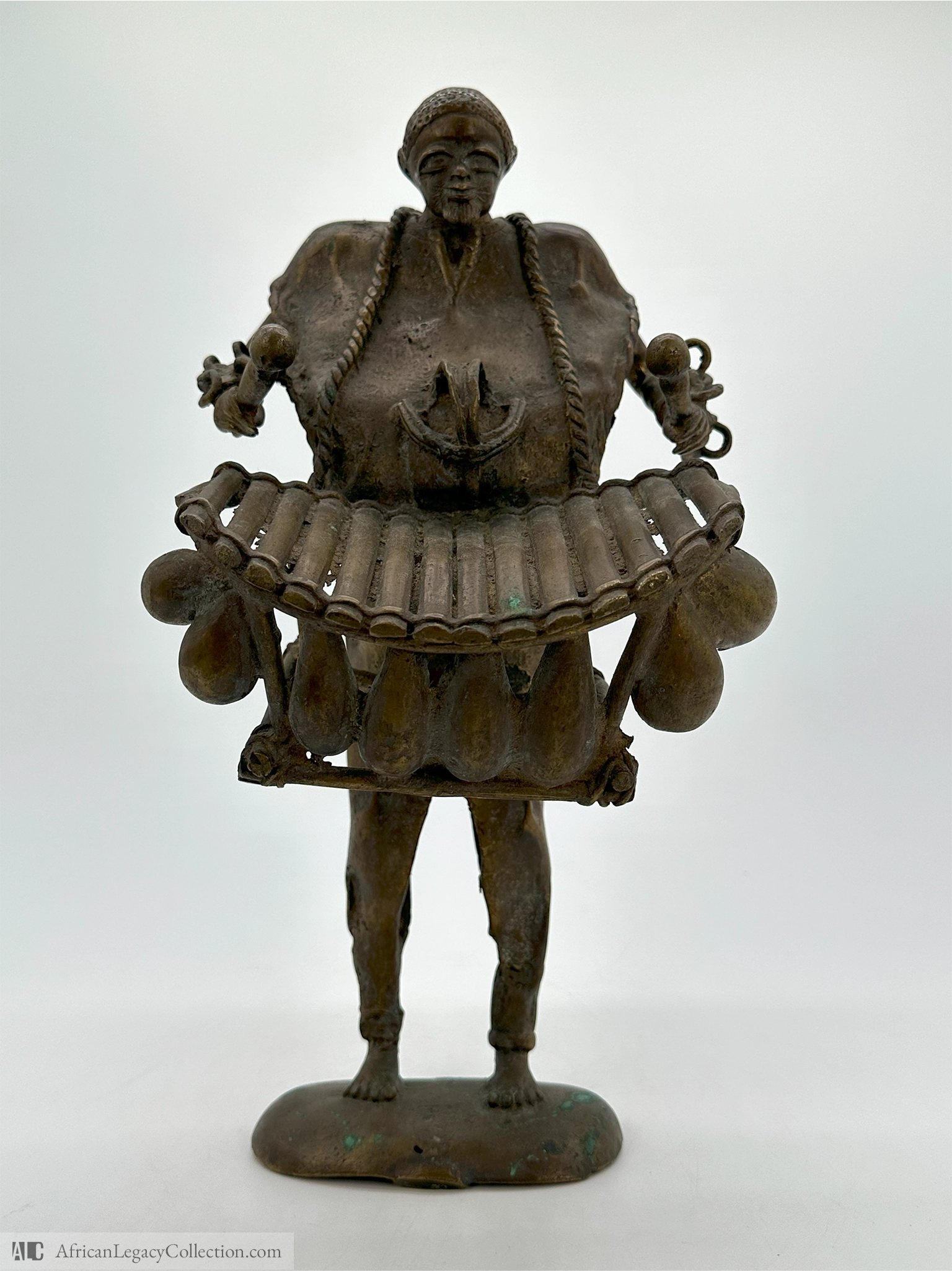 This artifact is a bronze sculpture likely originating from West Africa, representing a musician playing the xylophone. Its purpose is to depict musical performance in cultural or ritualistic settings, commonly seen in various African communities.